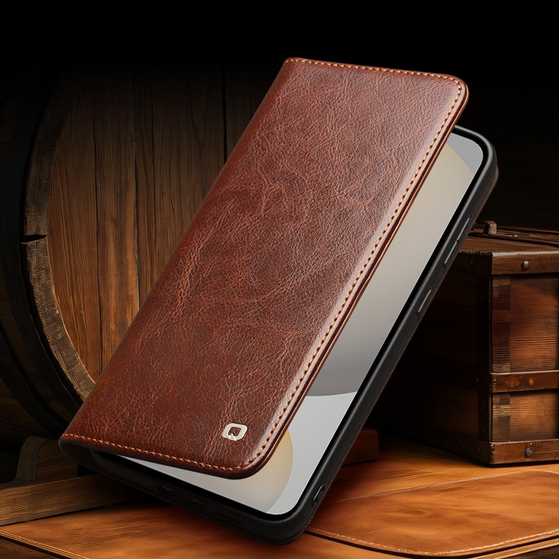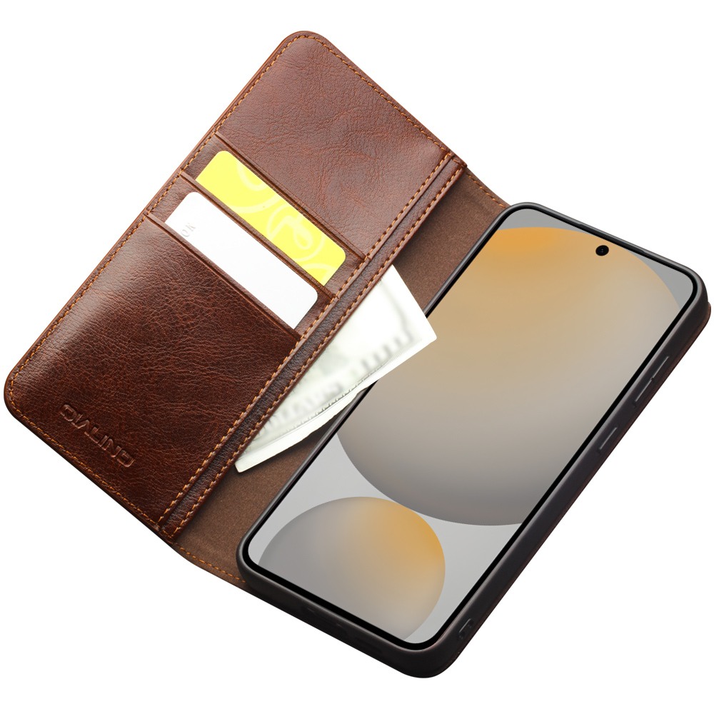Husa din piele fina naturala pentru Samsung Galaxy S25 FE - tip carte, cu buzunare carduri si bani, stand video, Qialino Classic Wallet, Maro - Espresso Brown