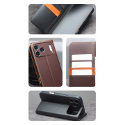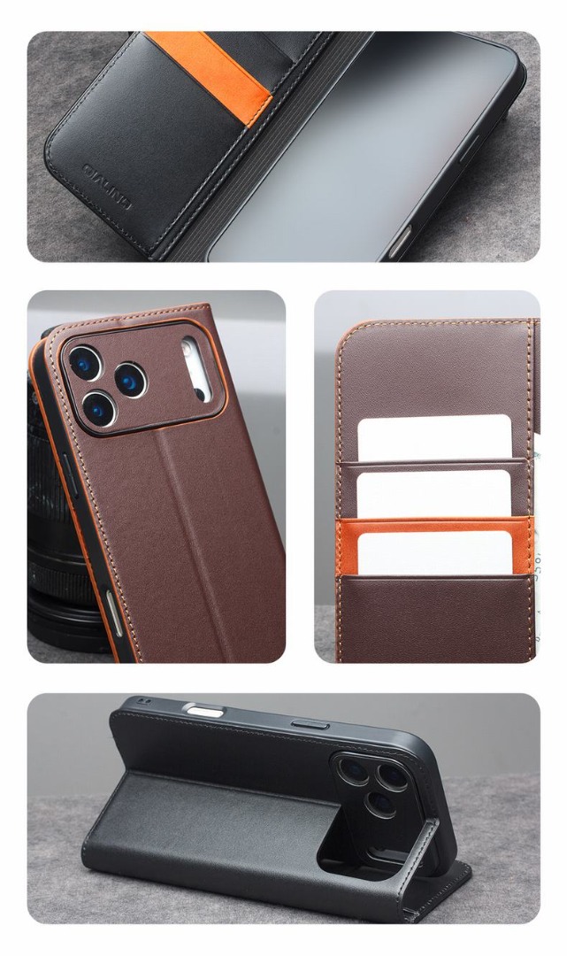 Husa din piele naturala pentru iPhone 17 Pro - tip carte, cu buzunare carduri si bani, stand video, textura mata si neteda, Qialino Business Wallet, Maro - Chestnut Brown