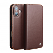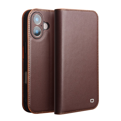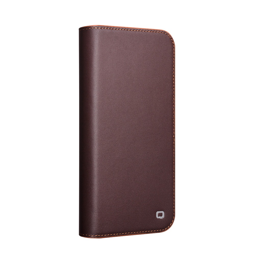 Husa din piele naturala pentru iPhone 17 - tip carte, cu buzunare carduri si bani, stand video, textura mata si neteda, Qialino Business Wallet, Maro - Chestnut Brown