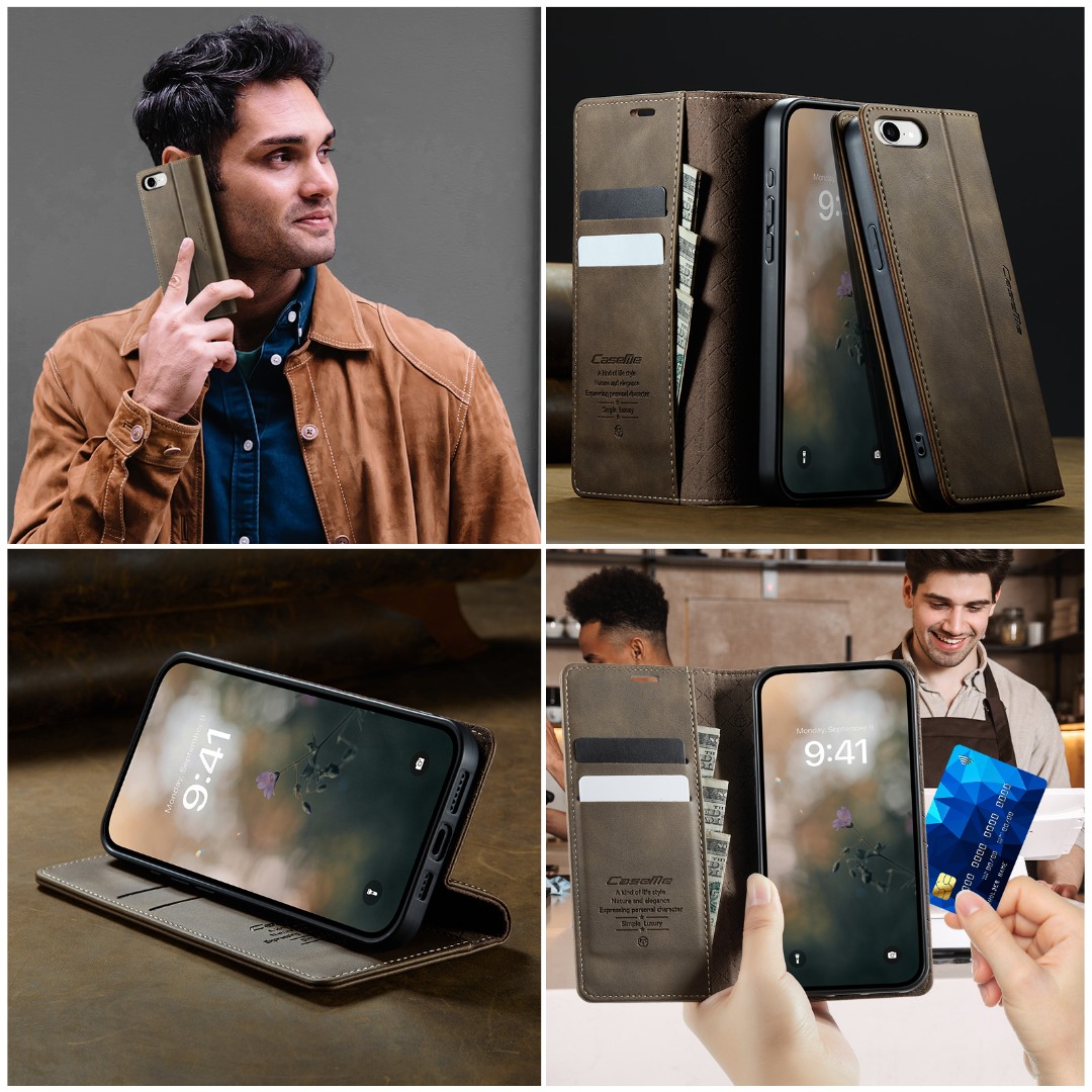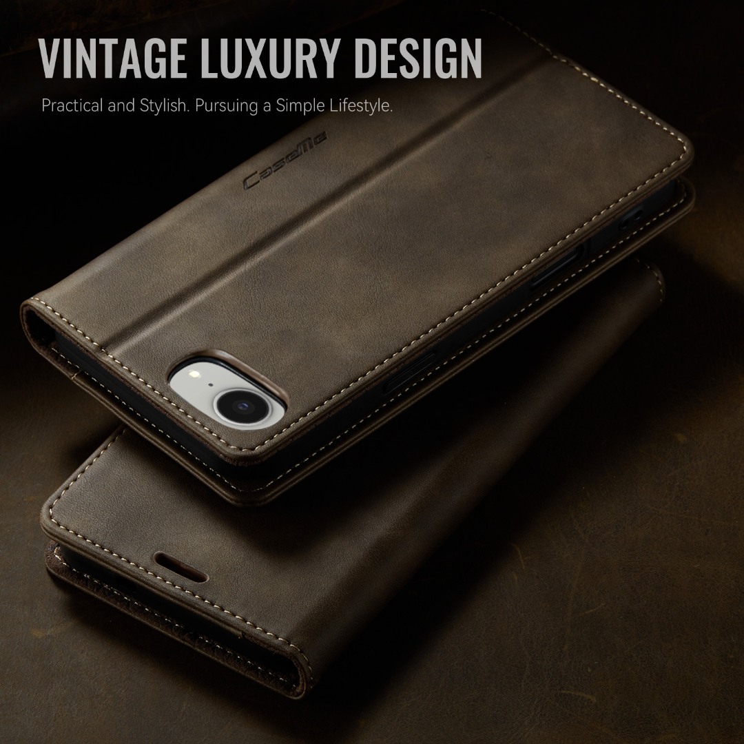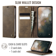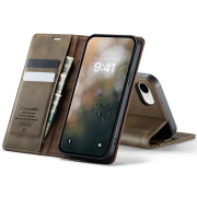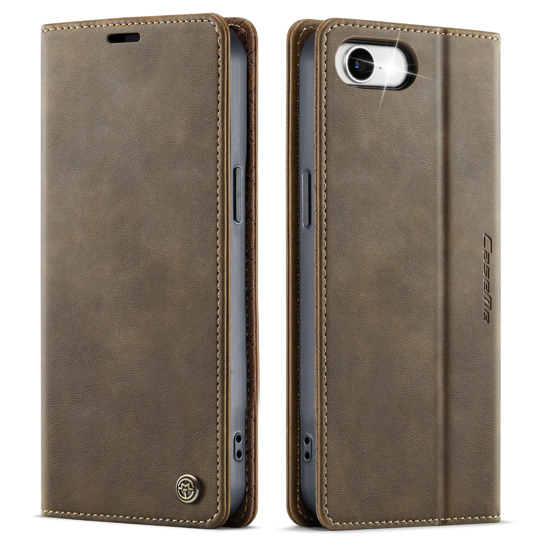 Husa pentru iPhone 16e - Slim tip portofel, cu stand si inchidere magnetica – textura neteda, aderenta sigura, usor de curatat, design curat si minimalist, CaseMe, Brun clasic