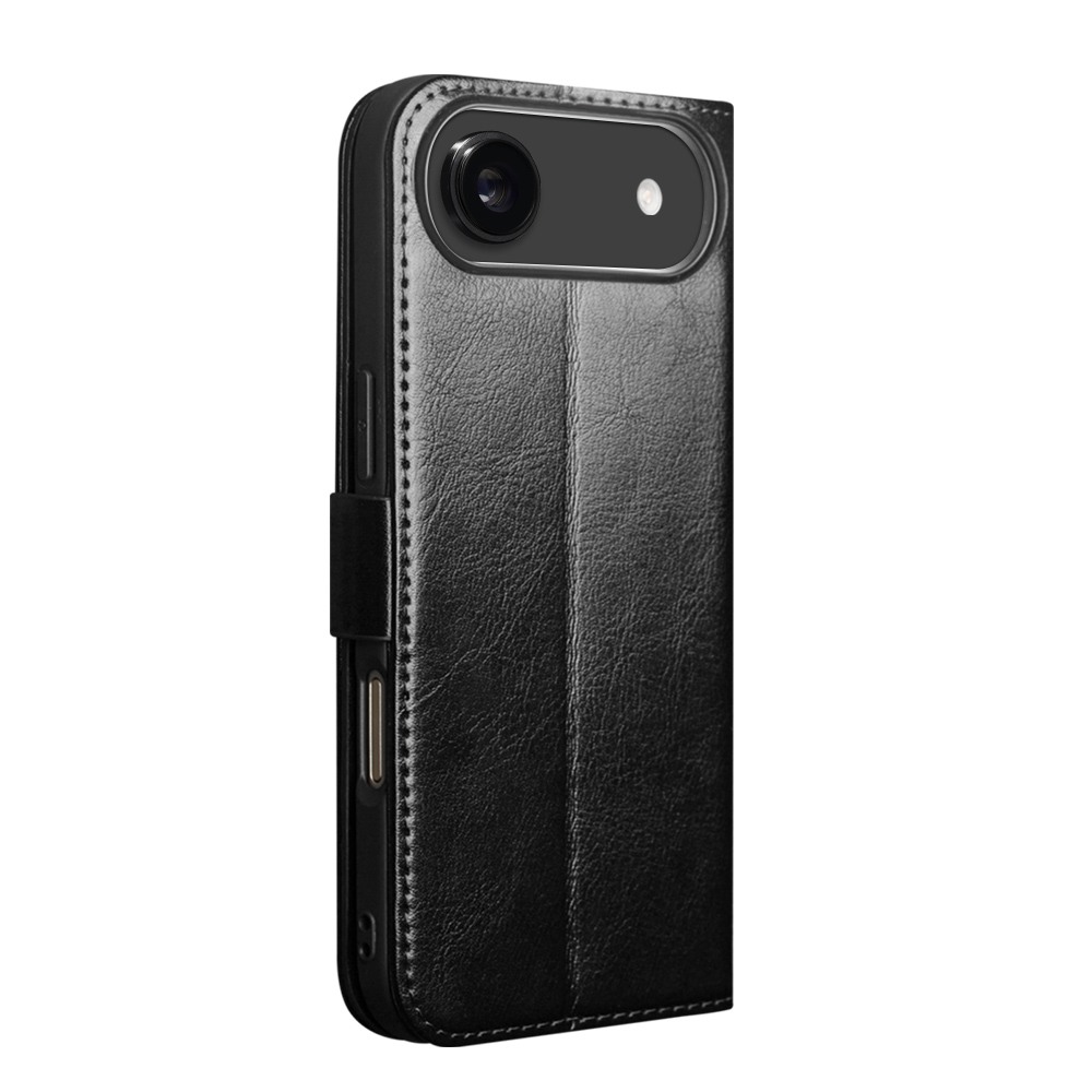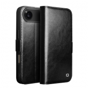 Husa pentru iPhone Air din piele fina naturala, tip carte, inchidere sigura magnetica, cu buzunare carduri si bani, stand video, rama moale carcasa, protectie camera prin rama inaltata - Qialino Magnetic Classic Wallet, Negru - Black Prestige