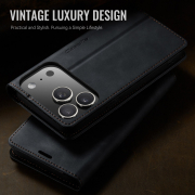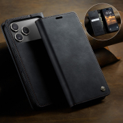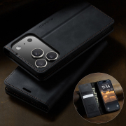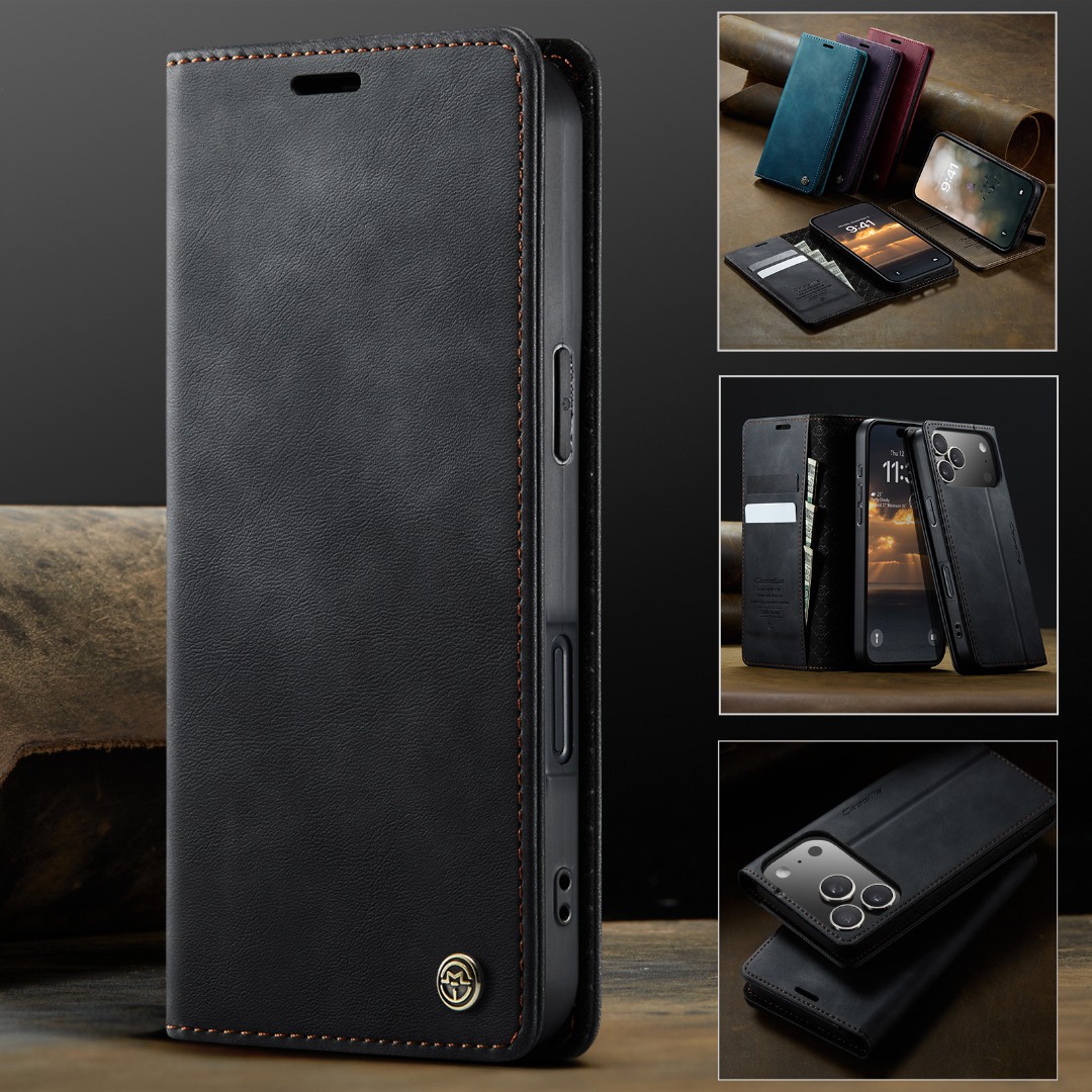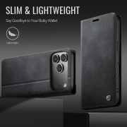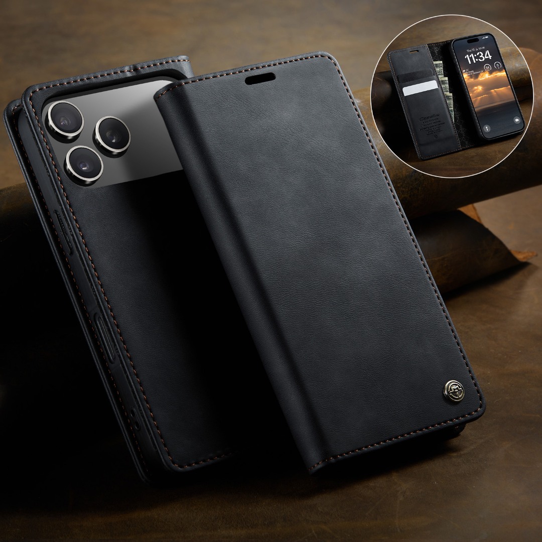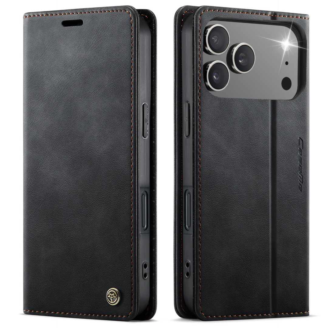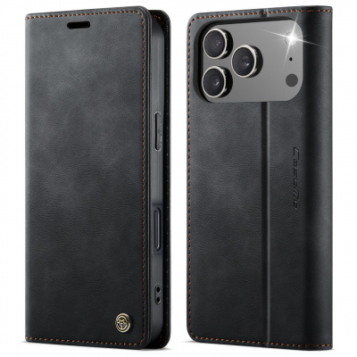 Husa pentru iPhone 17 Pro Max - Slim tip portofel, cu stand si inchidere magnetica – textura neteda, aderenta sigura, usor de curatat, design curat si minimalist, CaseMe, Negru carbon