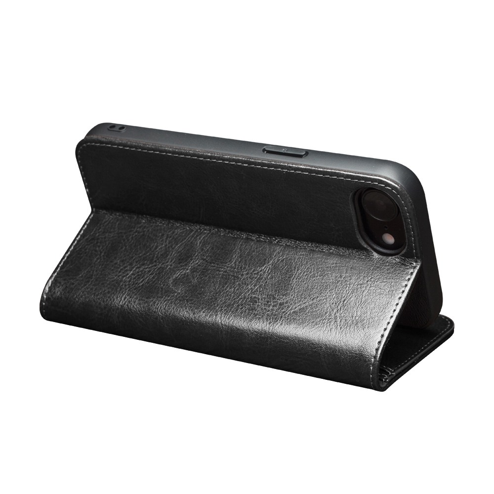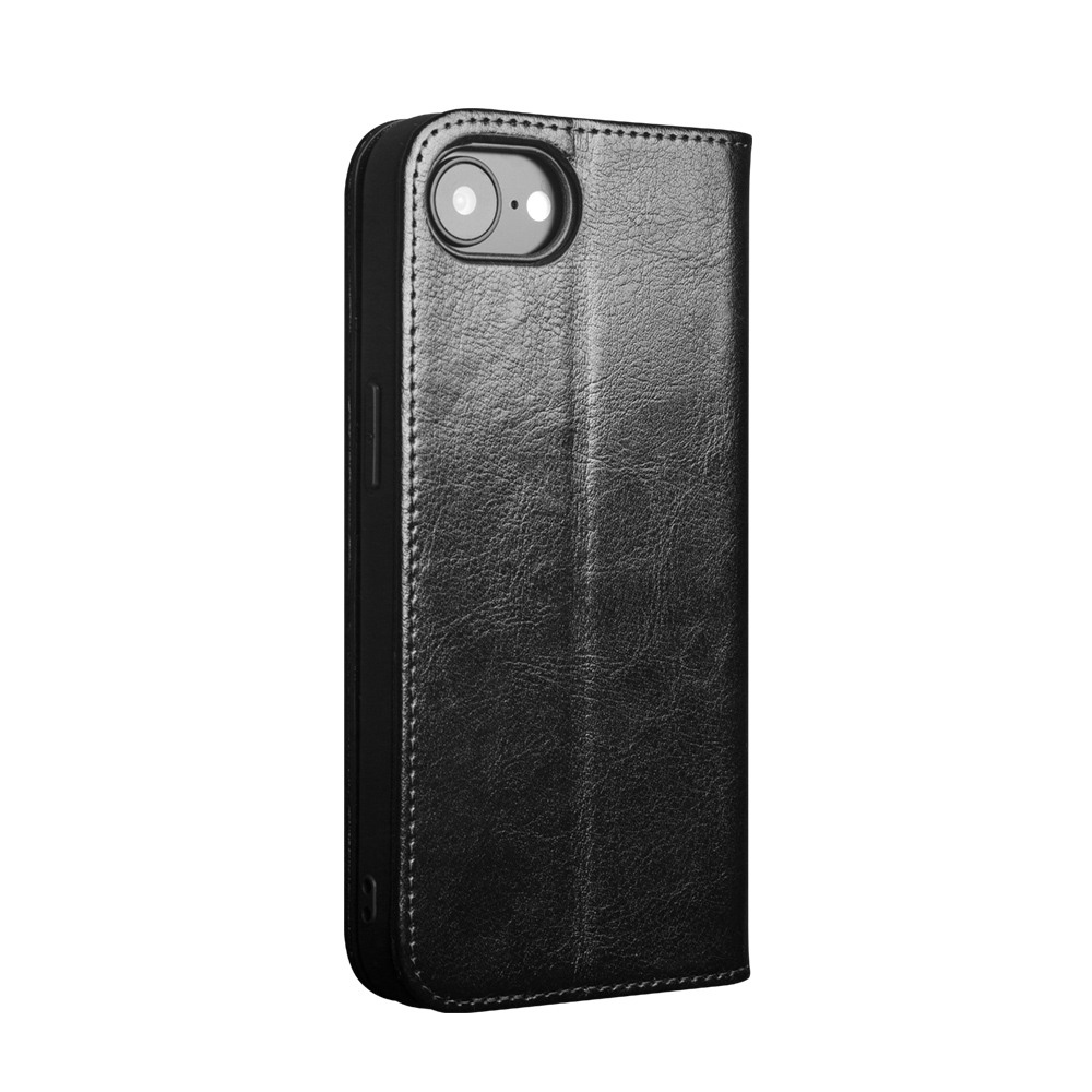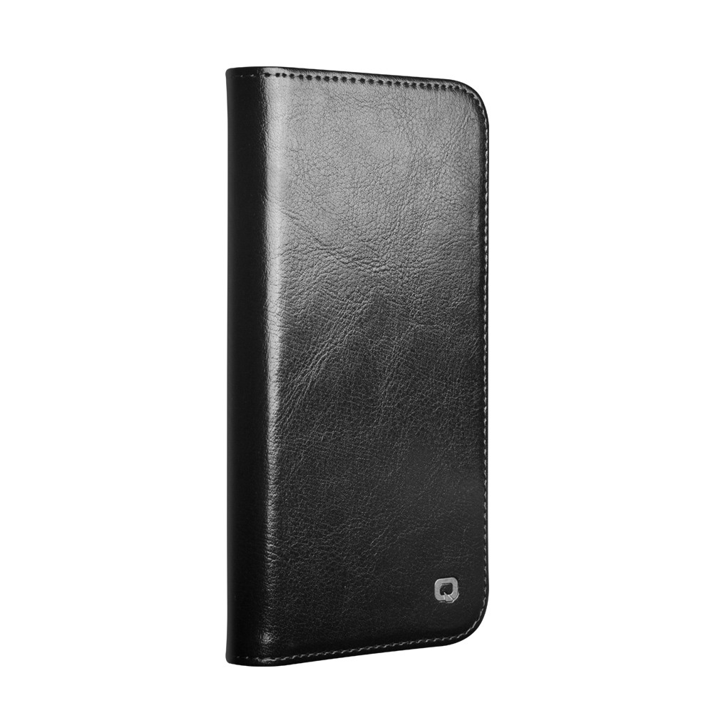 Husa pentru iPhone 17e – piele naturala fina, tip carte, sloturi carduri si bani, functie stand, Qialino Classic Wallet, Negru - Black Prestige