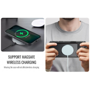 - compatibila cu MagSafe: Magnetii integrati permit aliniere perfecta cu accesoriile MagSafe – incarcatoare wireless, suporturi auto si portofele magnetice. Incarcarea wireless functioneaza fara a scoate husa