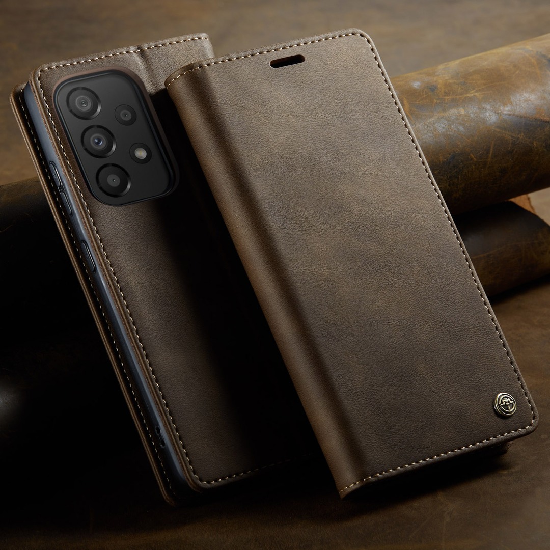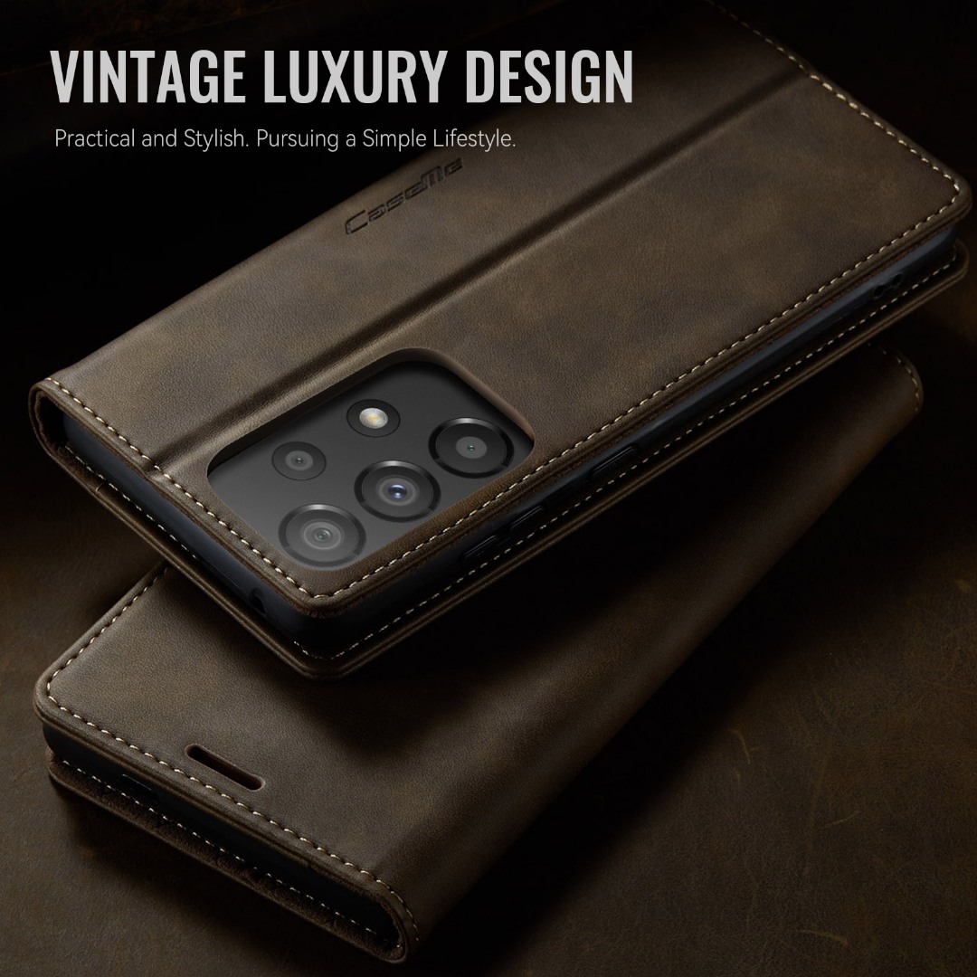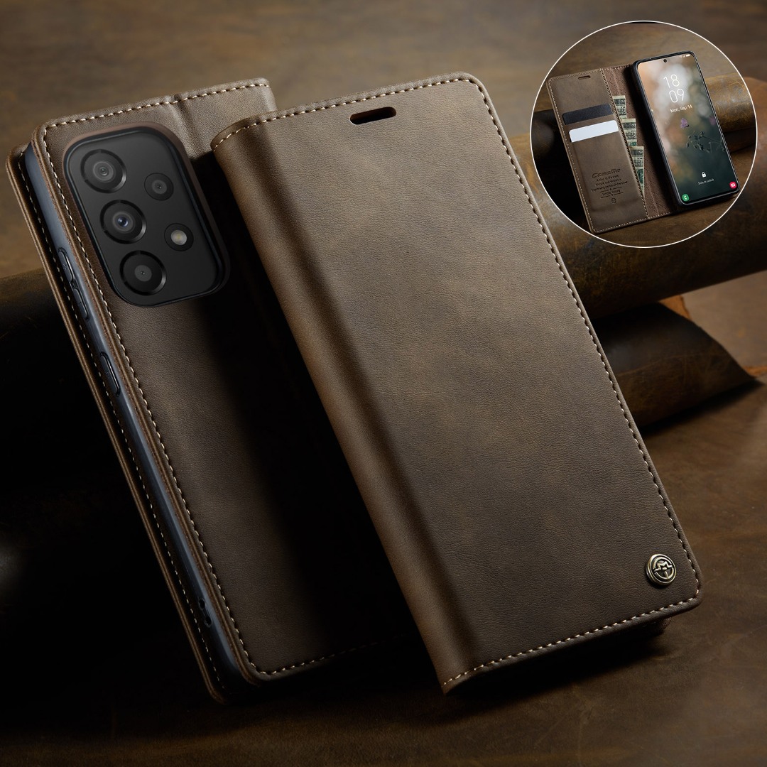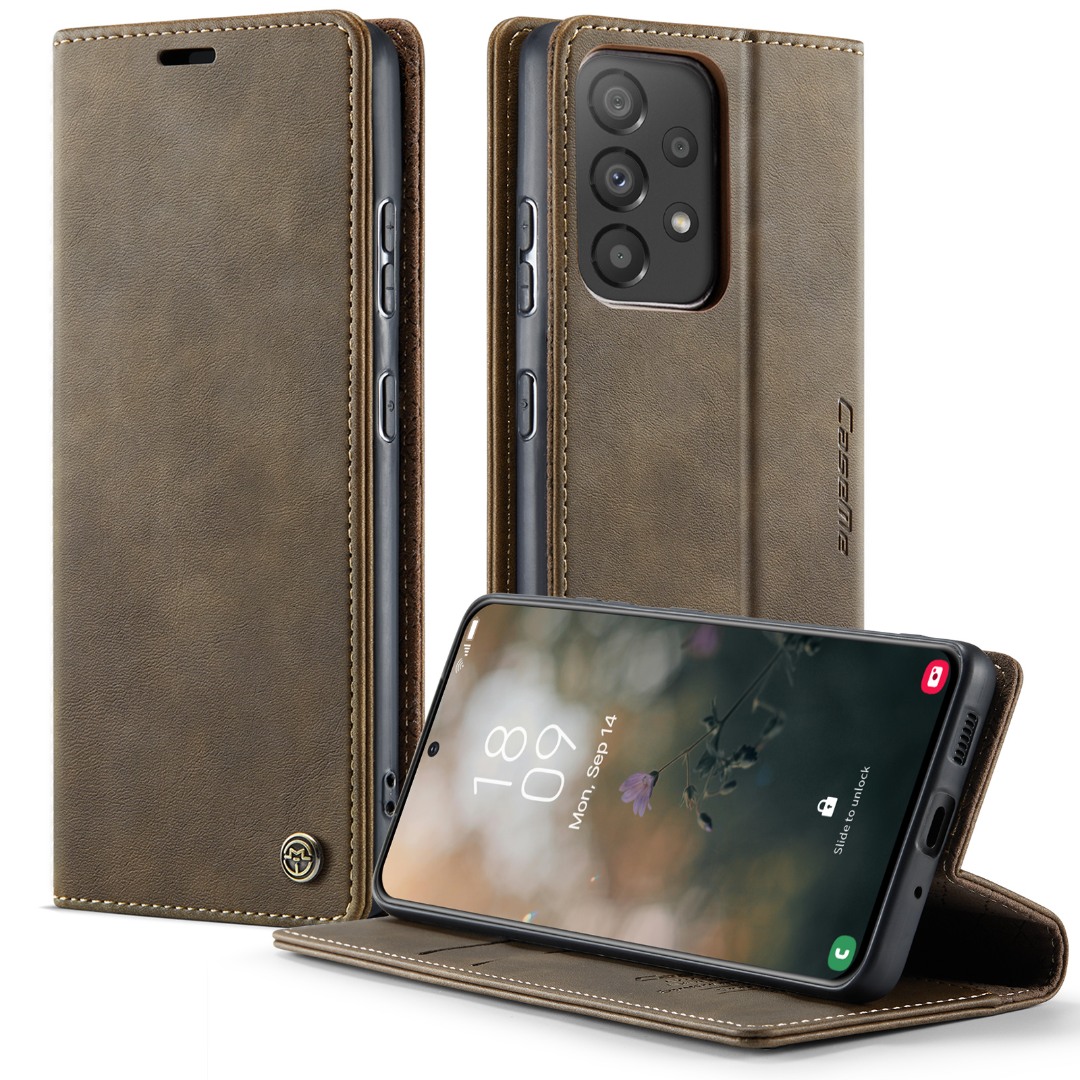 Husa pentru Samsung Galaxy A33 - Slim tip portofel, cu stand si inchidere magnetica – textura neteda, aderenta sigura, usor de curatat, design curat si minimalist, CaseMe, Brun clasic