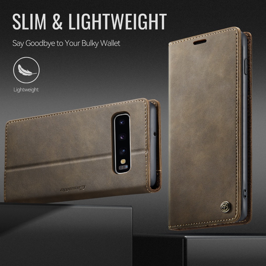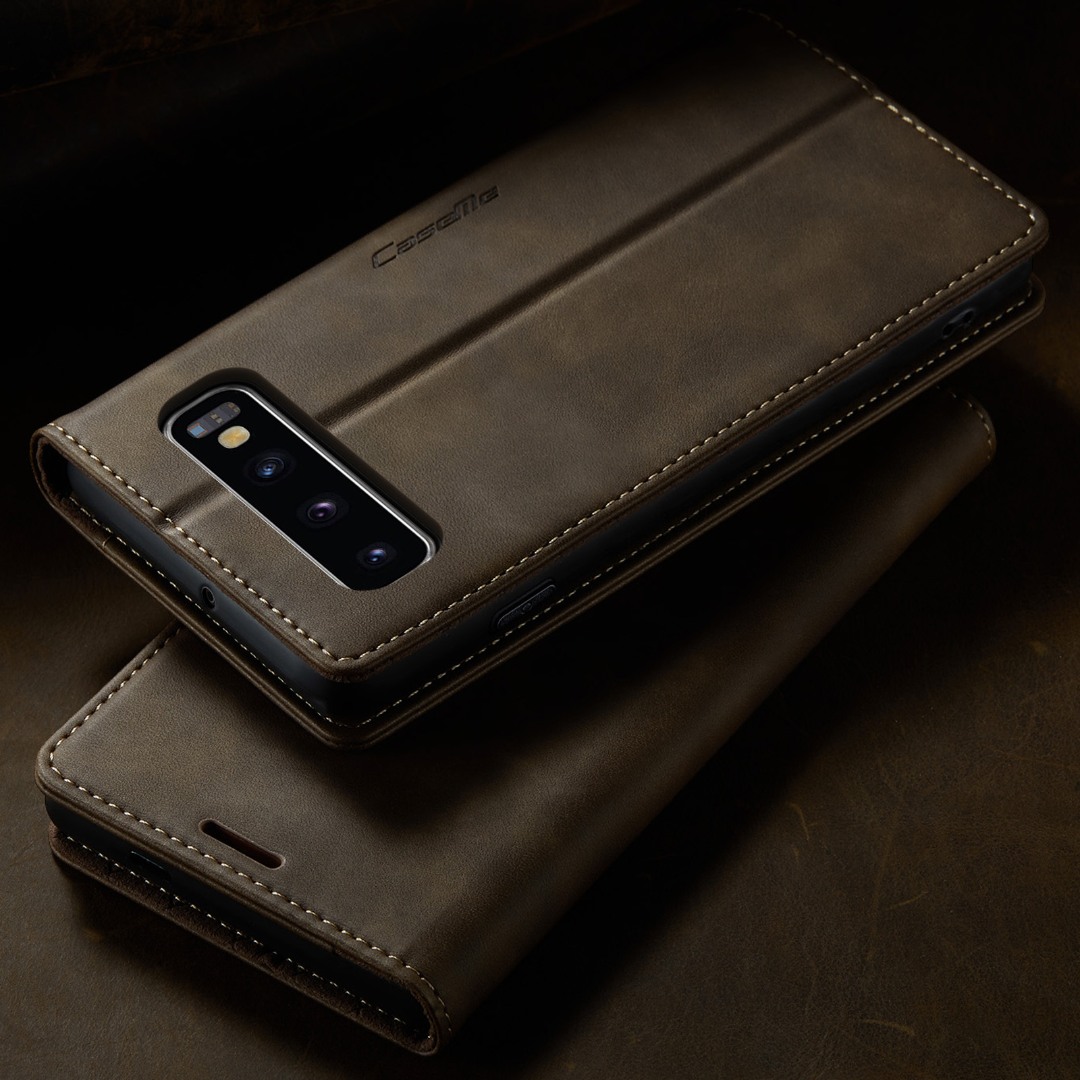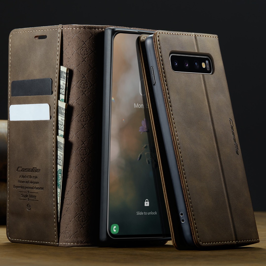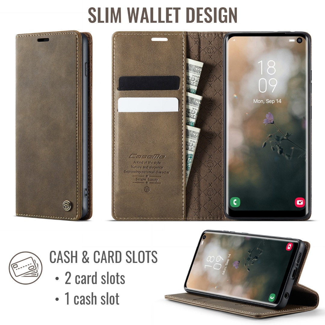 Husa pentru Samsung Galaxy S10 Plus - Slim tip portofel, cu stand si inchidere magnetica – textura neteda, aderenta sigura, usor de curatat, design curat si minimalist, CaseMe, Brun clasic
