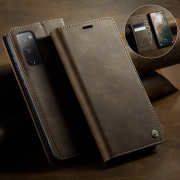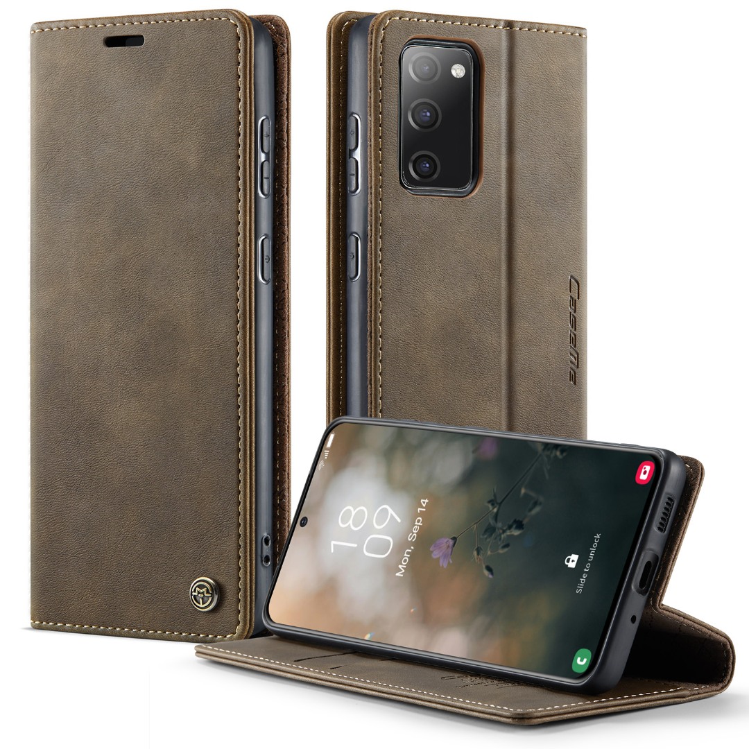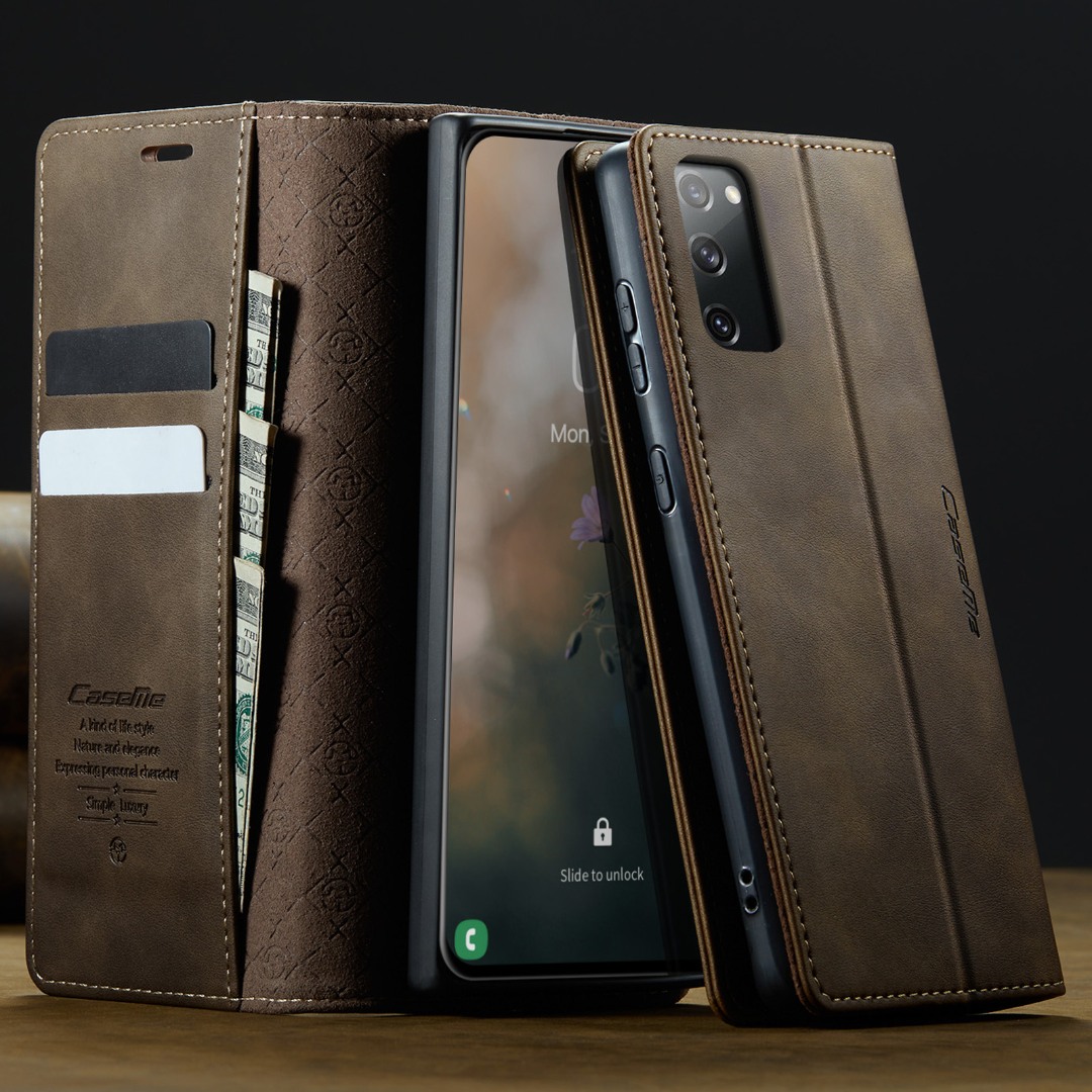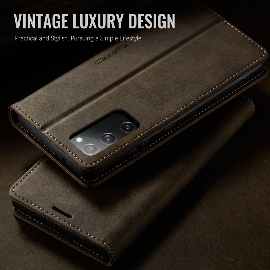 Husa pentru Samsung Galaxy S20 FE - Slim tip portofel, cu stand si inchidere magnetica – textura neteda, aderenta sigura, usor de curatat, design curat si minimalist, CaseMe, Brun clasic