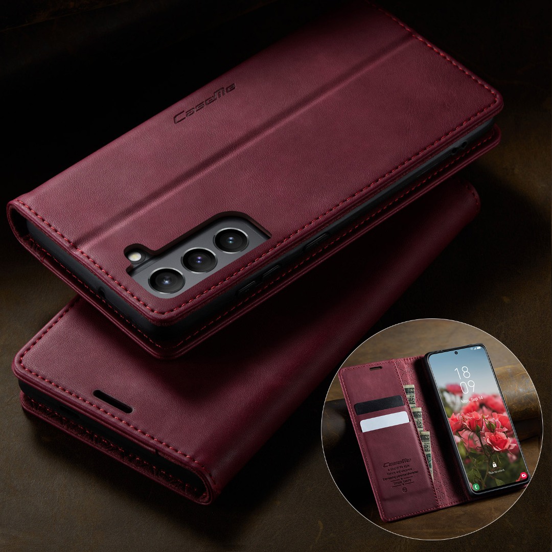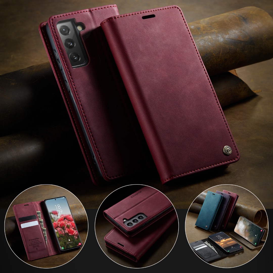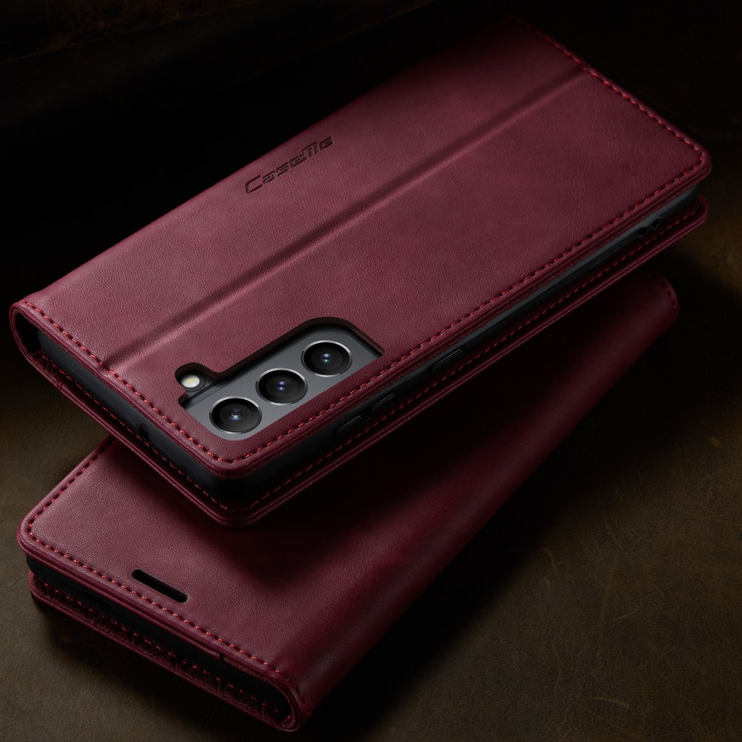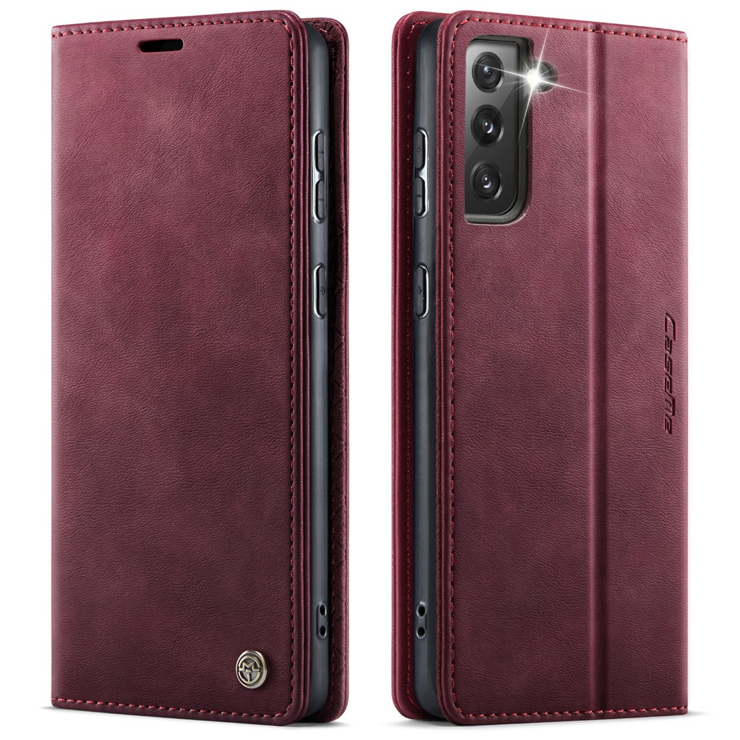 Husa pentru Samsung Galaxy S21 FE - Slim tip portofel, cu stand si inchidere magnetica – textura neteda, aderenta sigura, usor de curatat, design curat si minimalist, CaseMe, Rosu burgundy