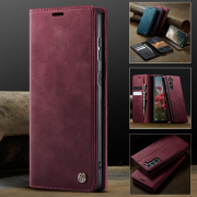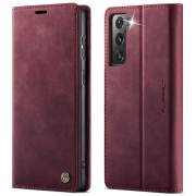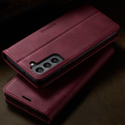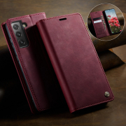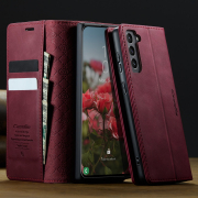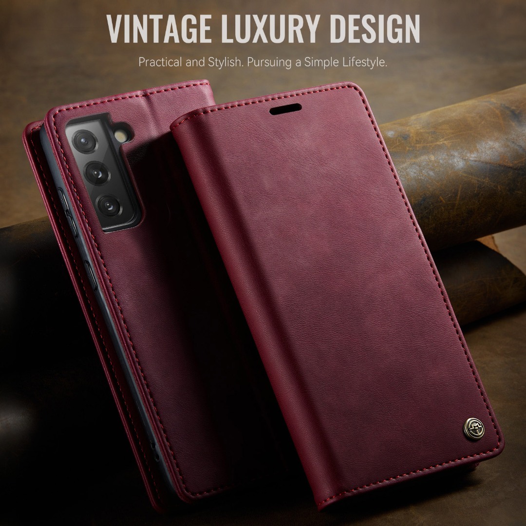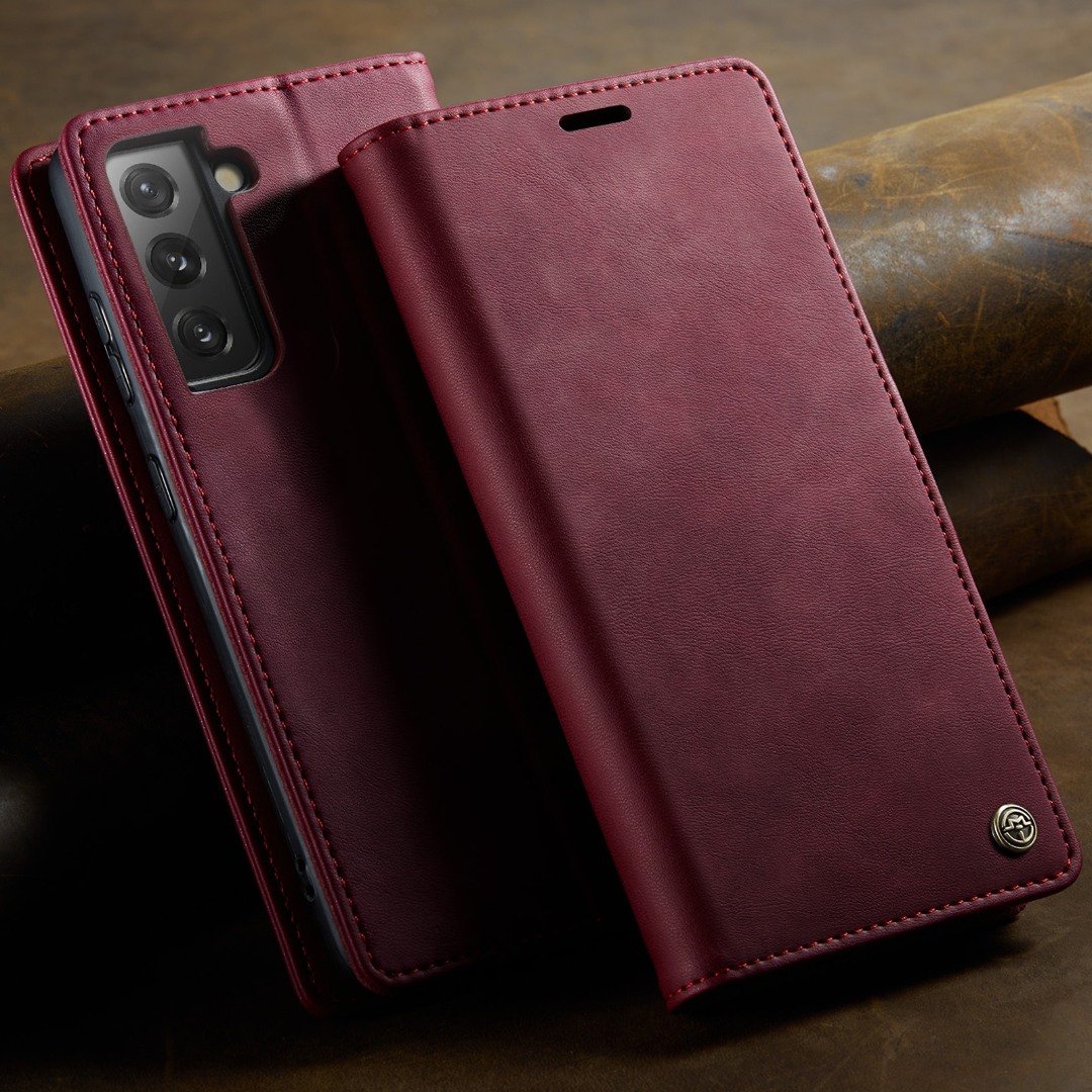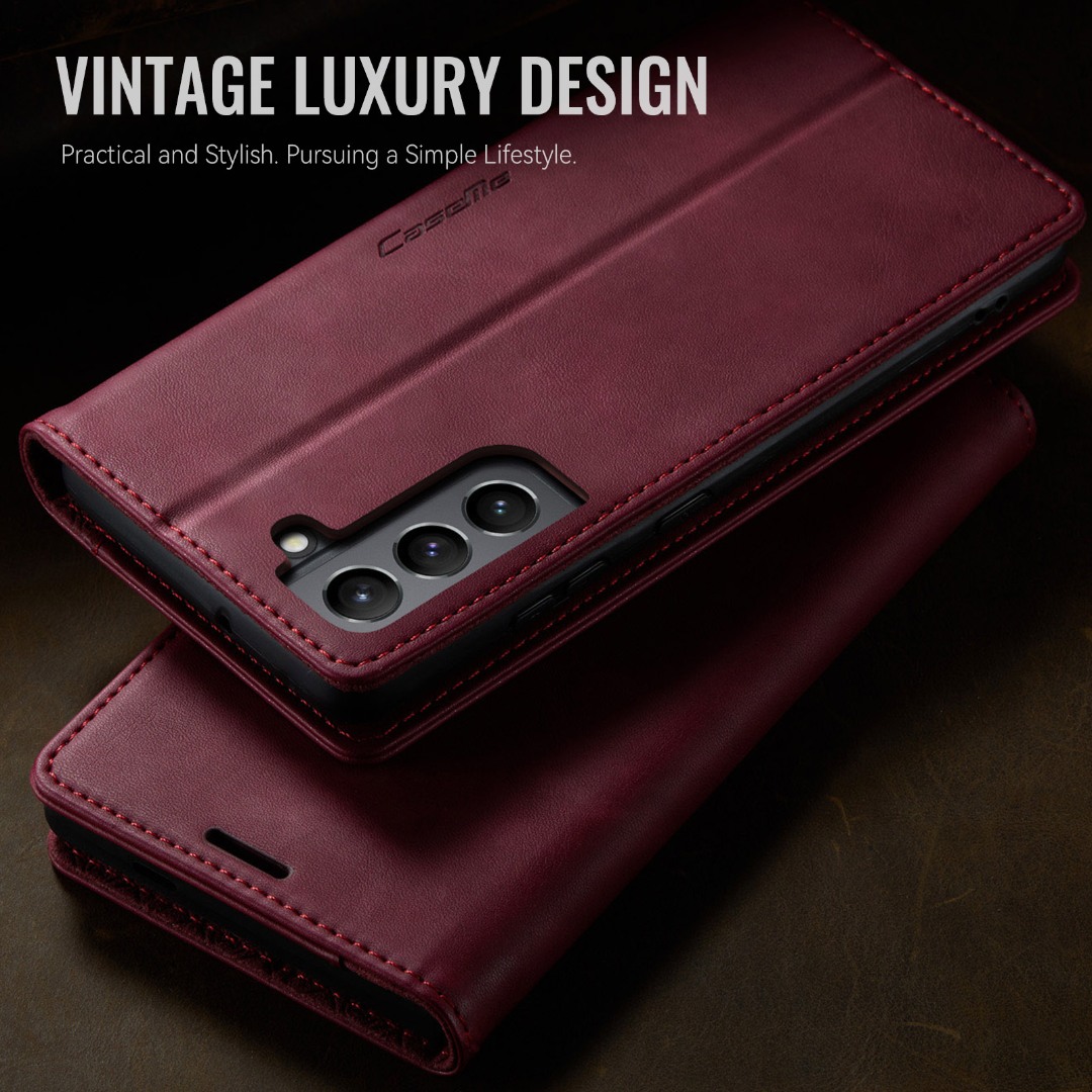 Husa pentru Samsung Galaxy S21 FE - Slim tip portofel, cu stand si inchidere magnetica – textura neteda, aderenta sigura, usor de curatat, design curat si minimalist, CaseMe, Rosu burgundy