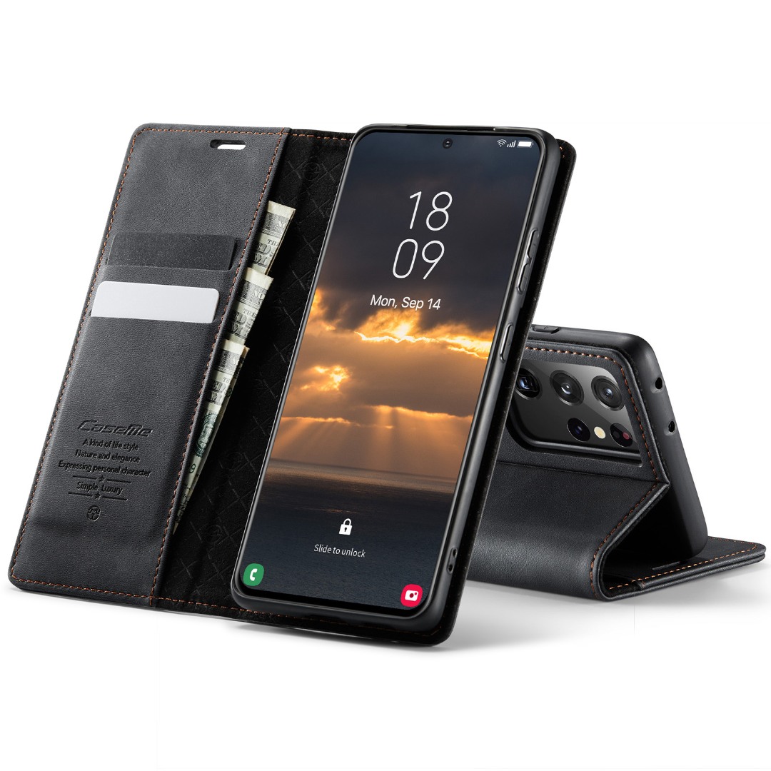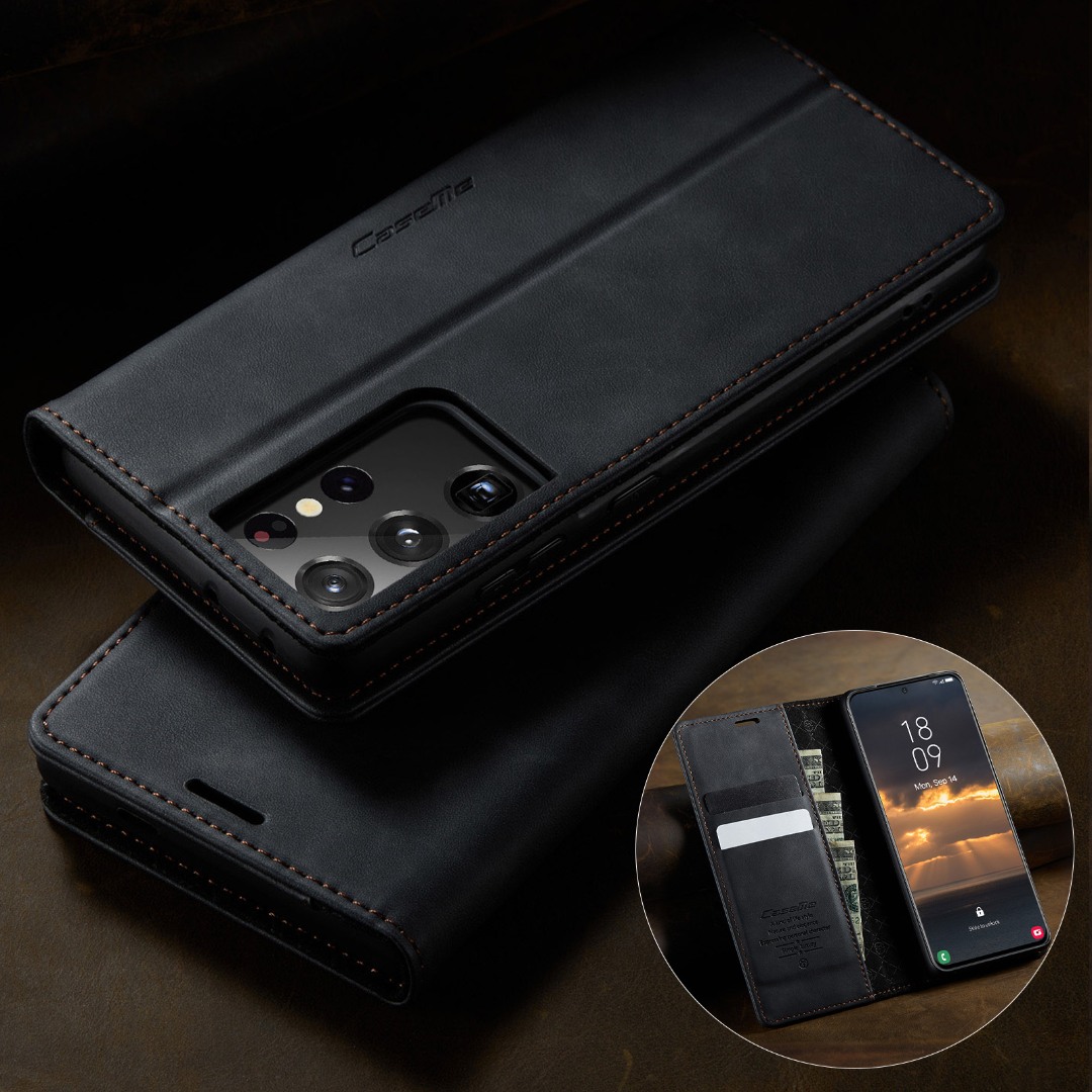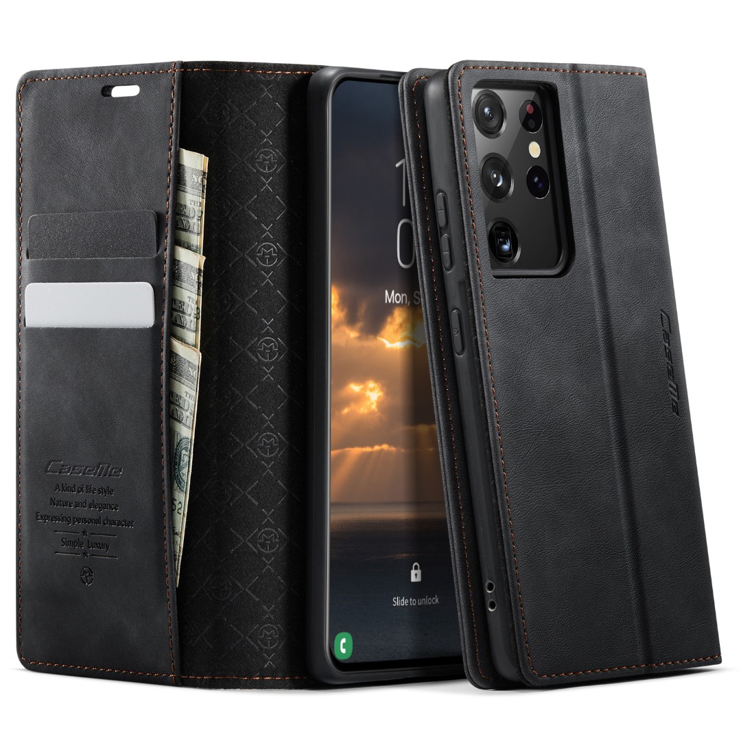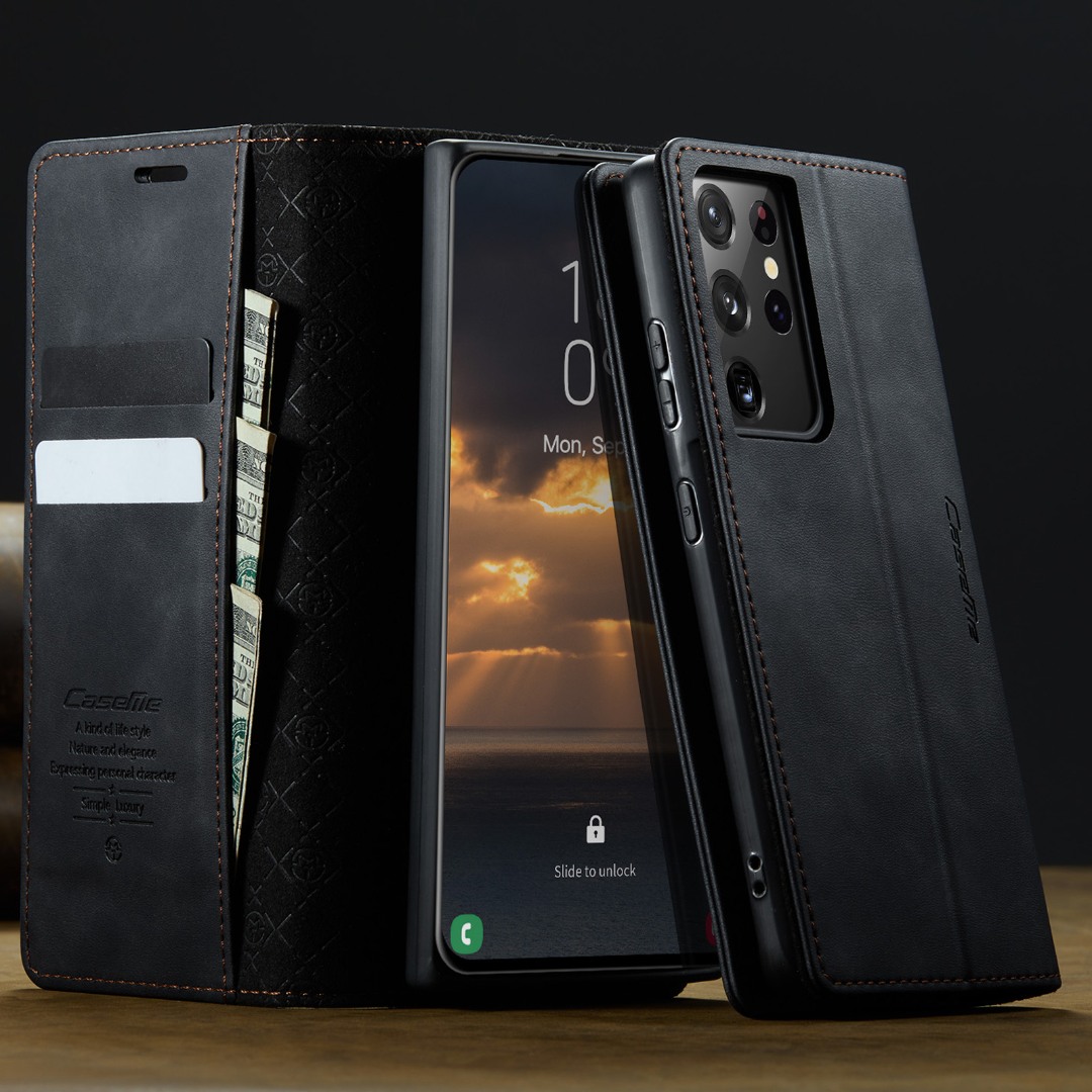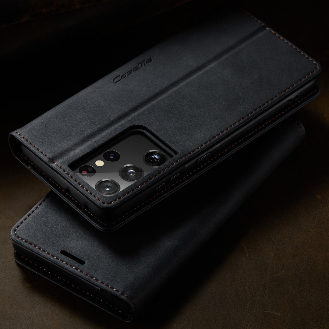 Husa pentru Samsung Galaxy S21 Ultra - Slim tip portofel, cu stand si inchidere magnetica – textura neteda, aderenta sigura, usor de curatat, design curat si minimalist, CaseMe, Negru carbon