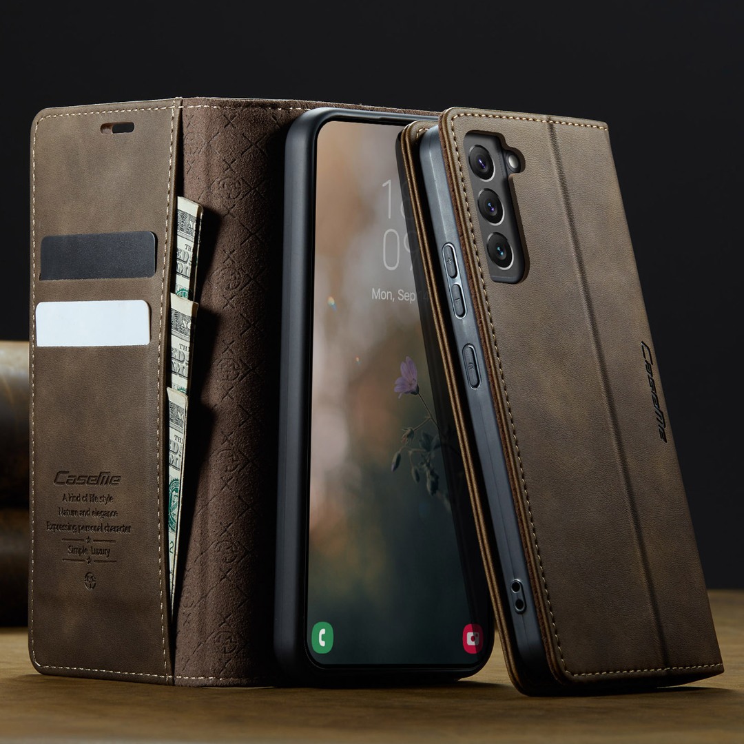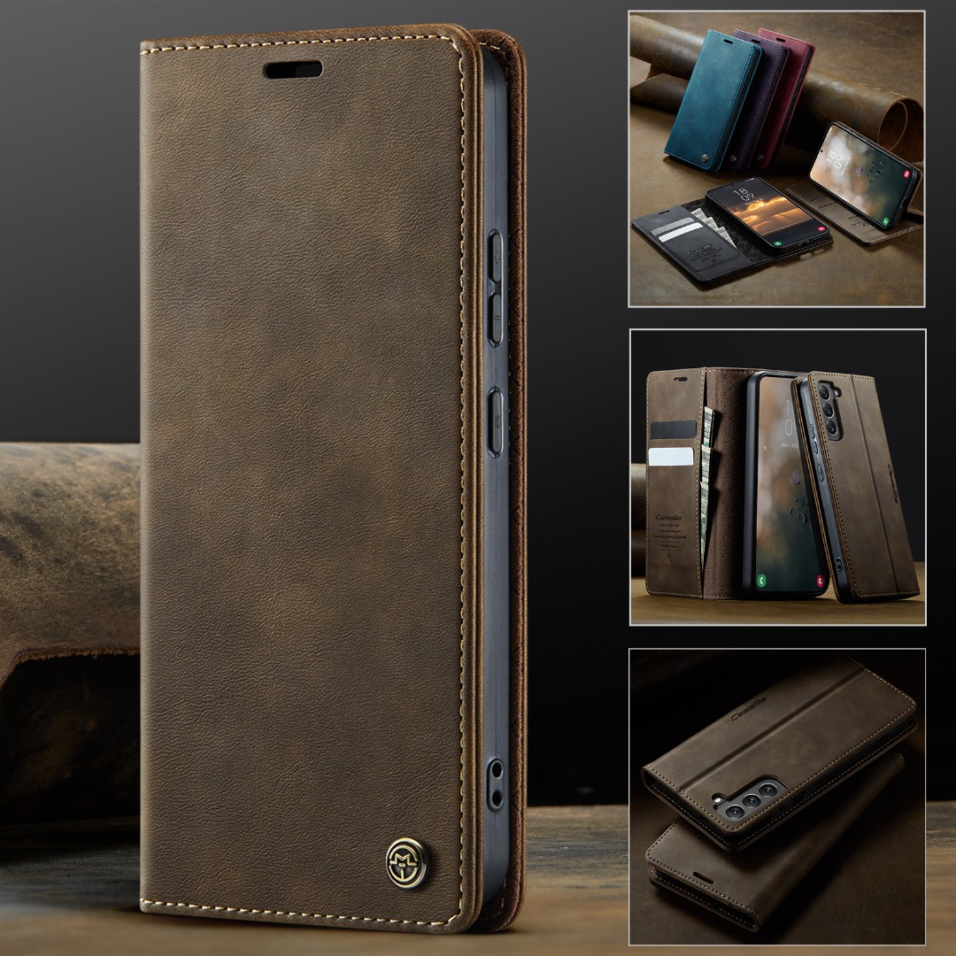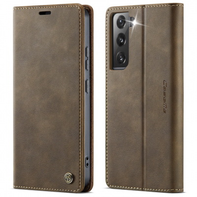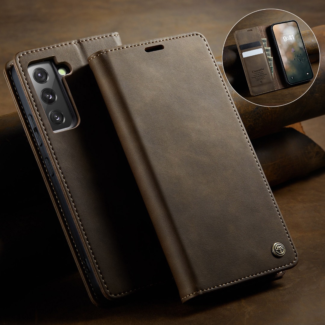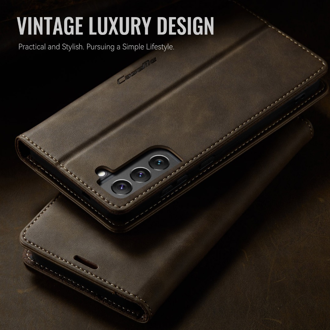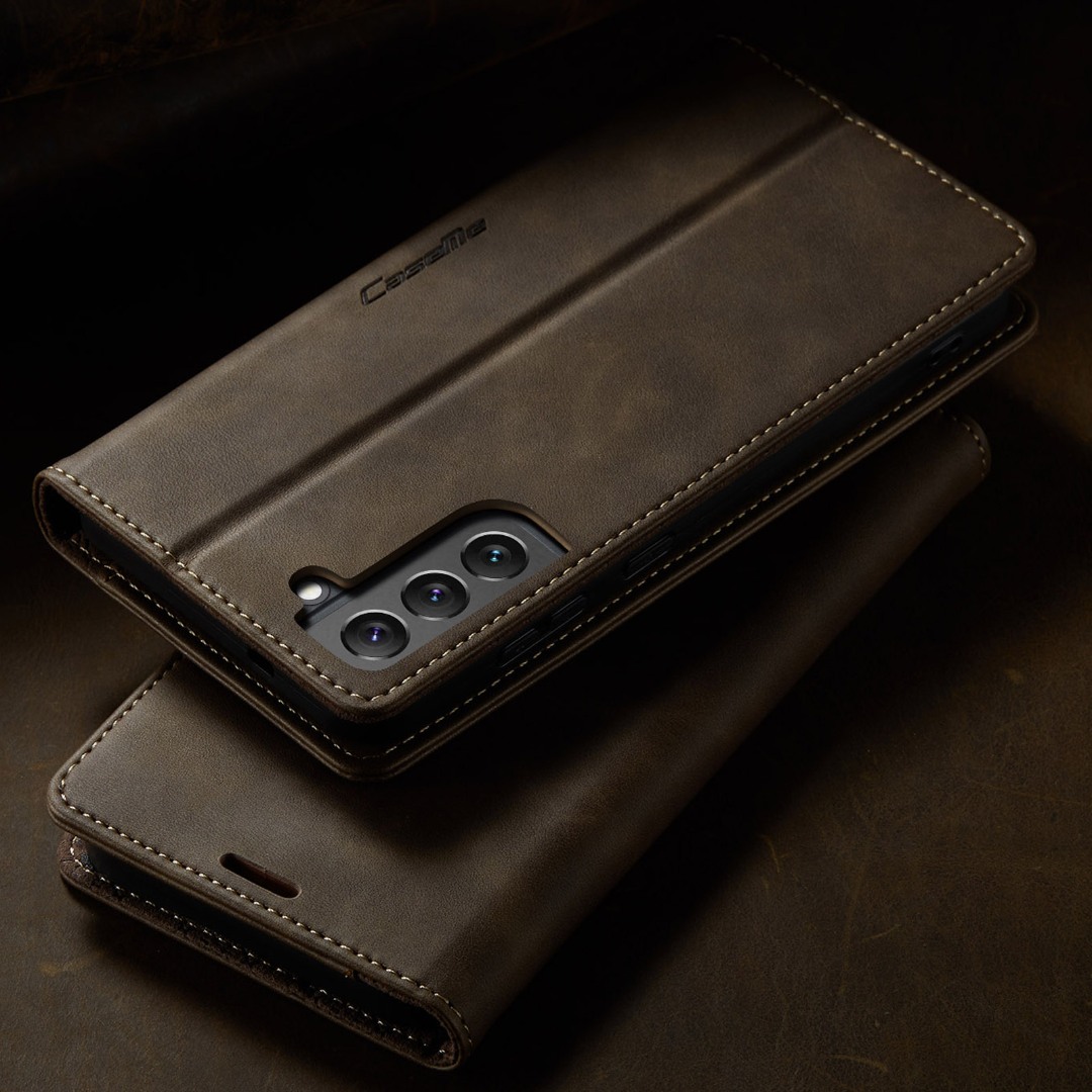 Husa pentru Samsung Galaxy S22 - Slim tip portofel, cu stand si inchidere magnetica – textura neteda, aderenta sigura, usor de curatat, design curat si minimalist, CaseMe, Brun clasic