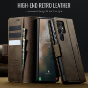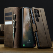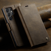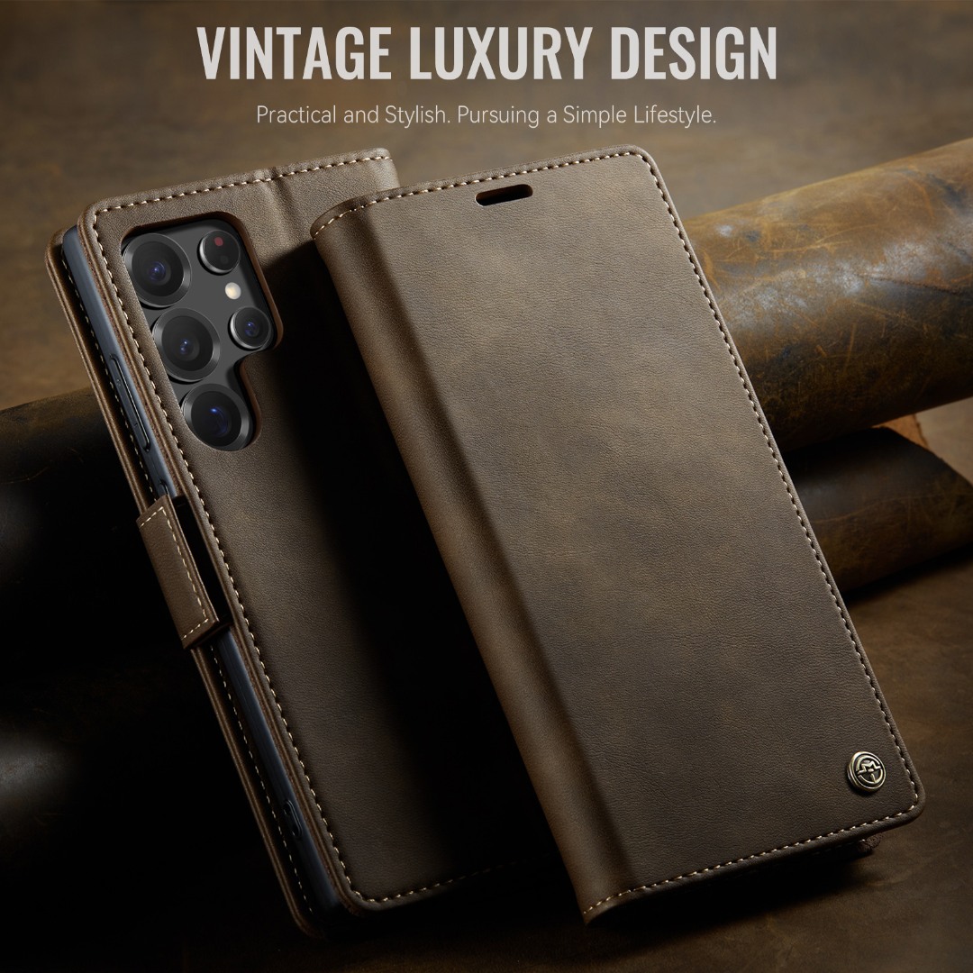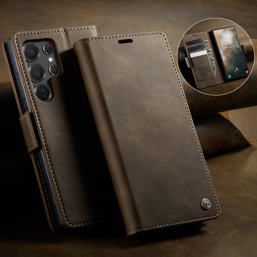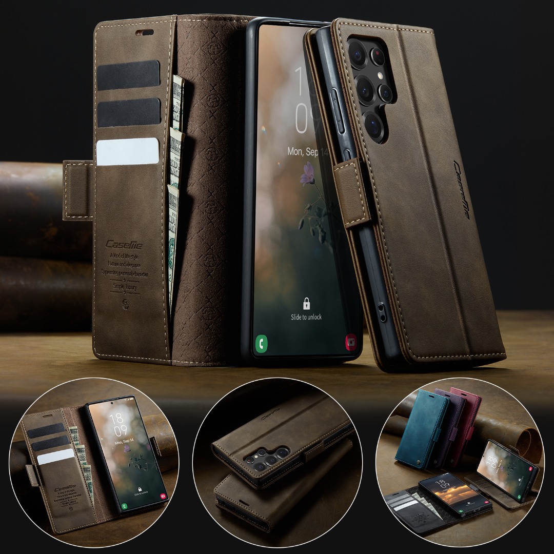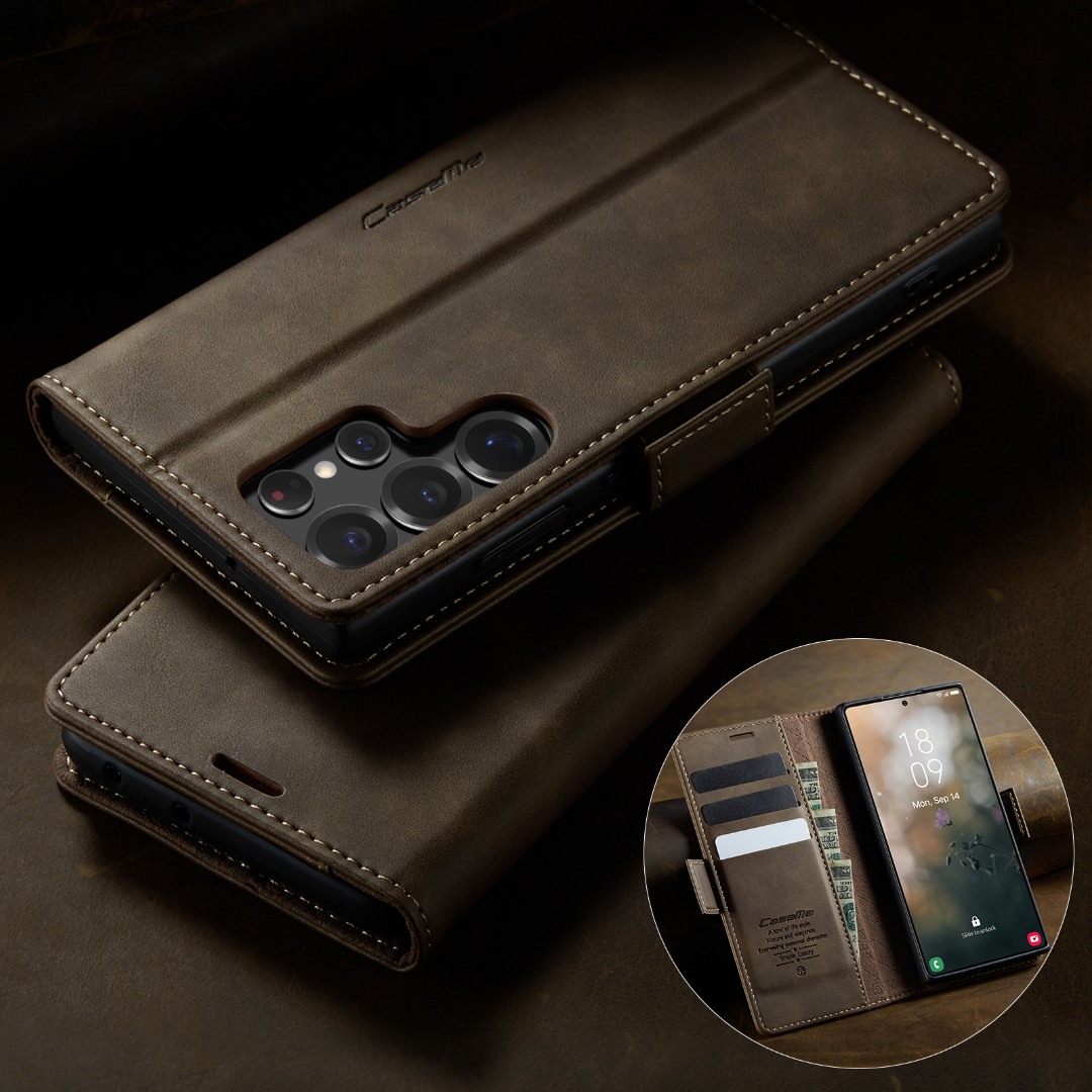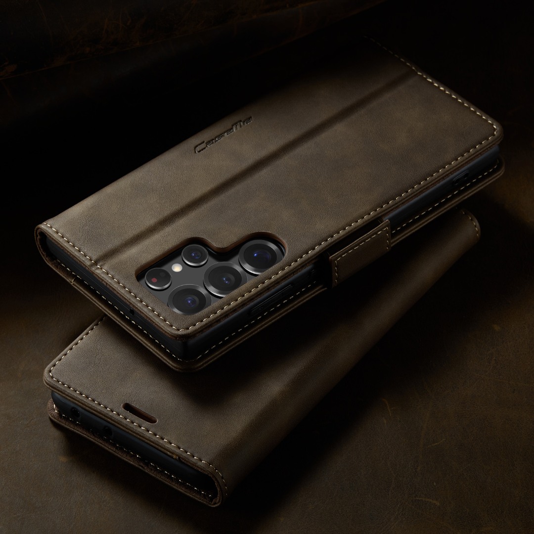 Husa pentru Samsung Galaxy S22 Ultra - Slim tip portofel, cu stand si inchidere magnetica – textura neteda, aderenta sigura, usor de curatat, design curat si minimalist, CaseMe, Brun clasic