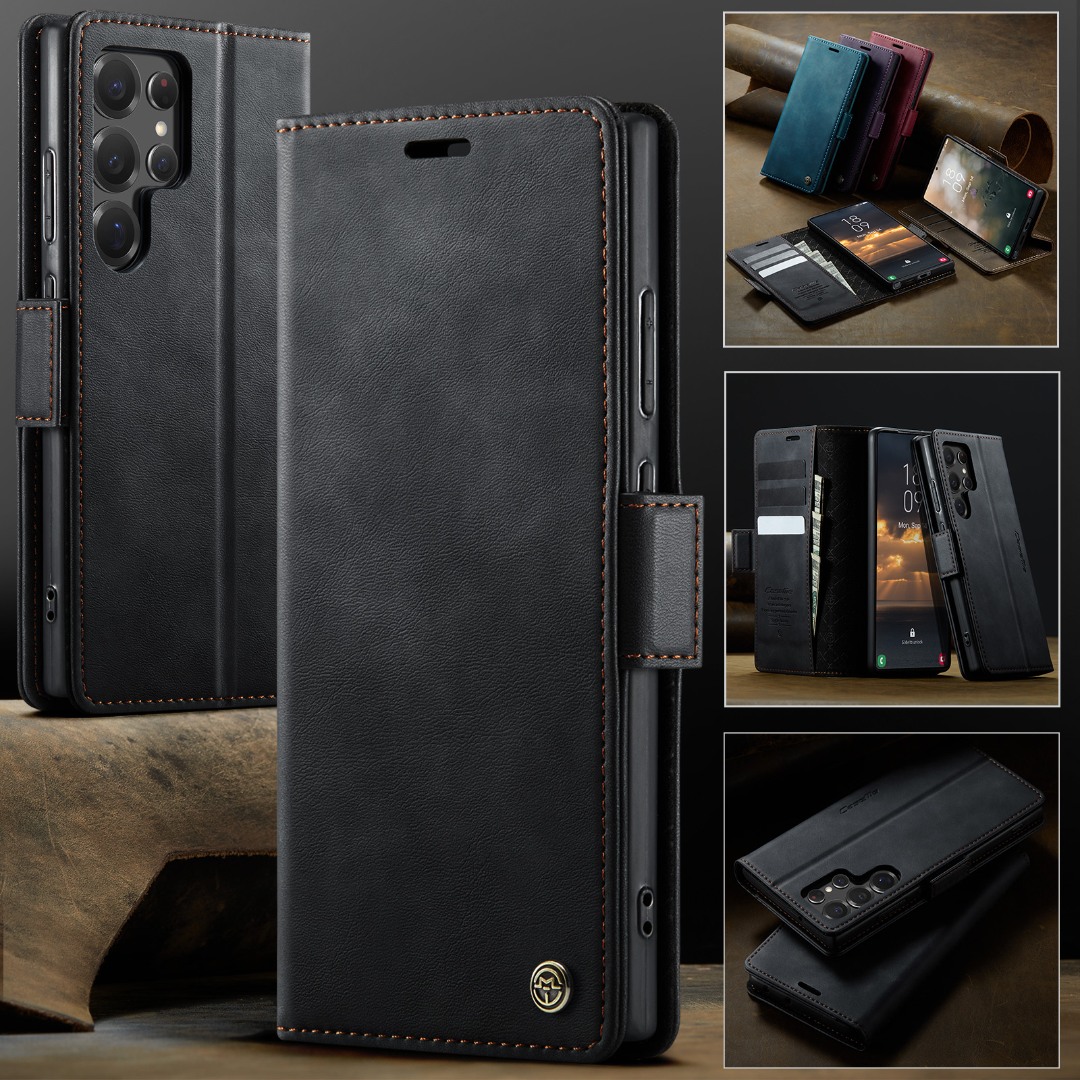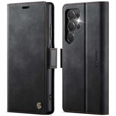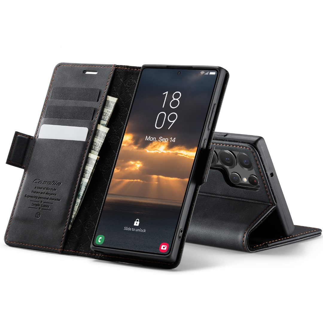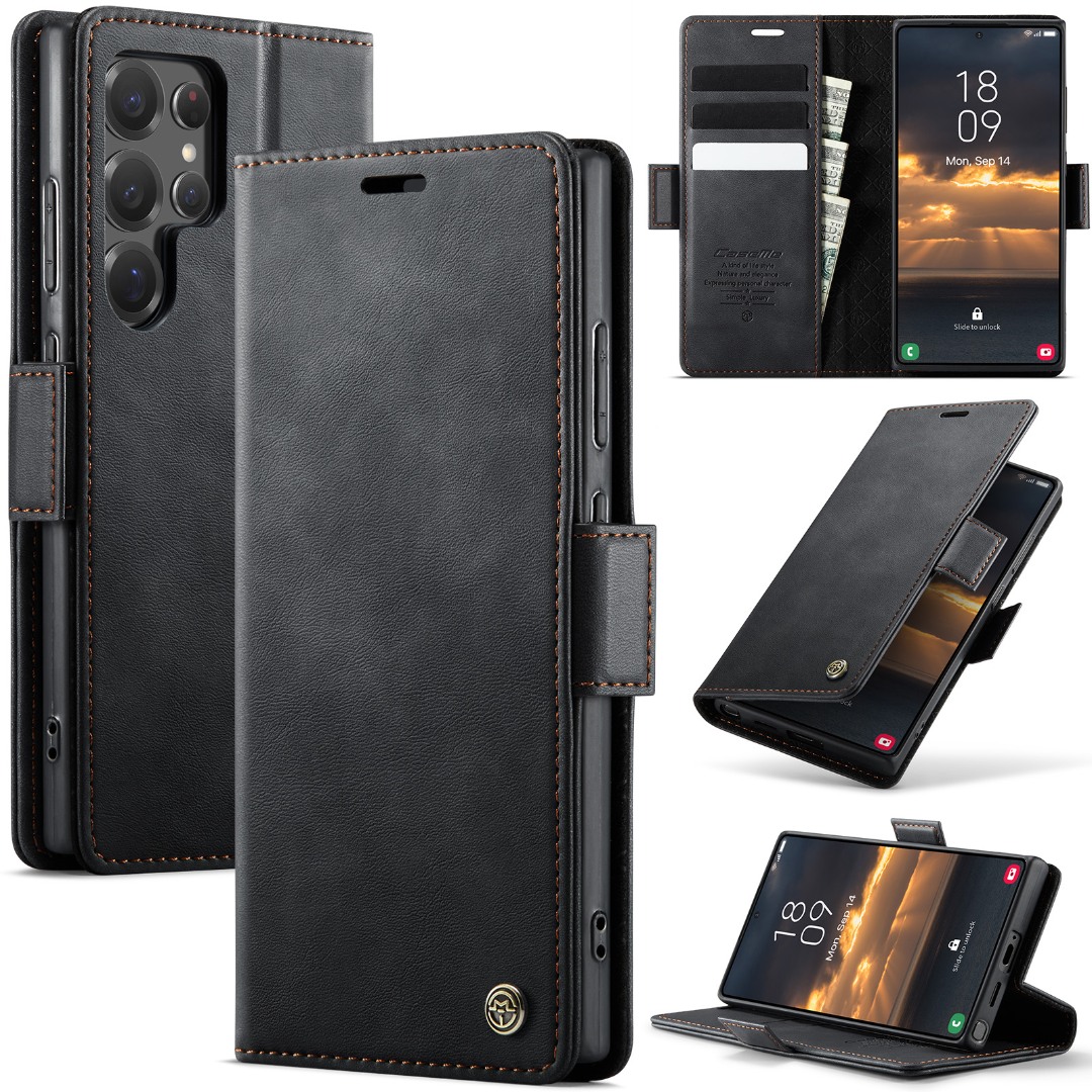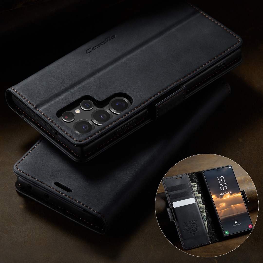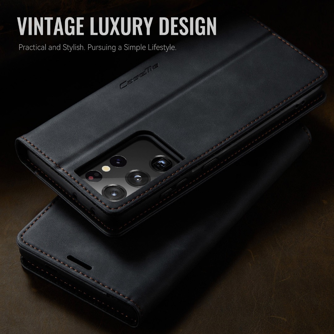 Husa pentru Samsung Galaxy S22 Ultra - Slim tip portofel, cu stand si inchidere magnetica – textura neteda, aderenta sigura, usor de curatat, design curat si minimalist, CaseMe, Negru carbon