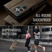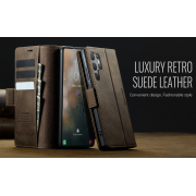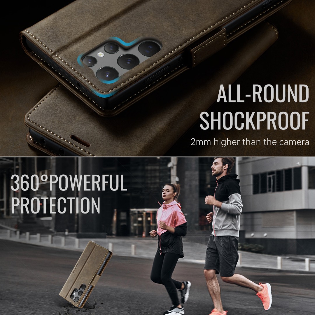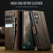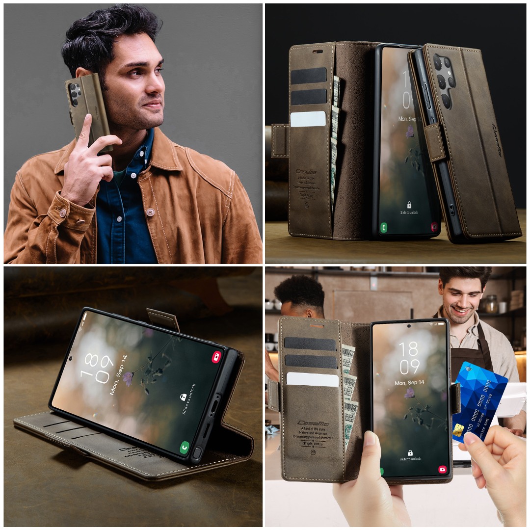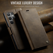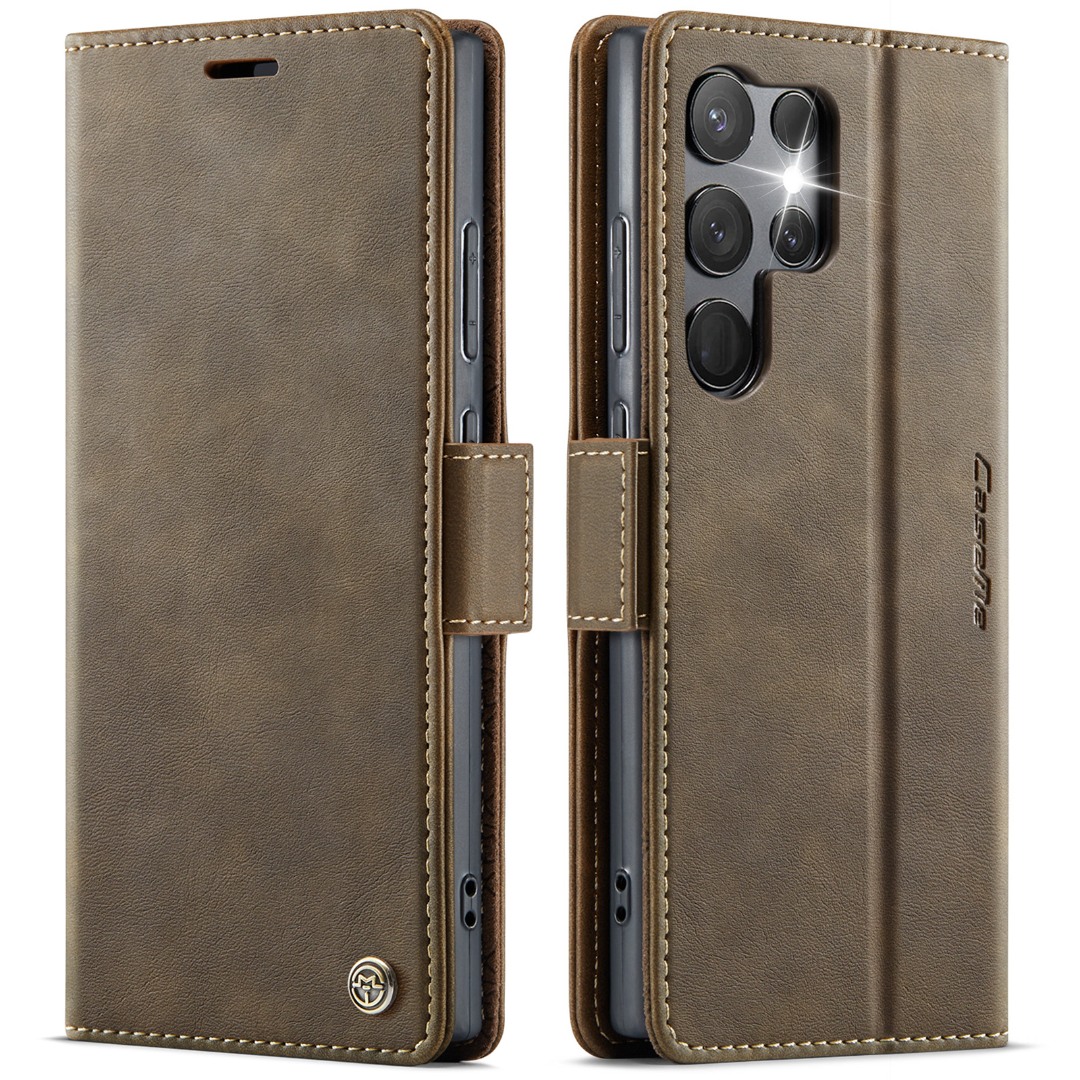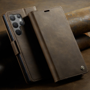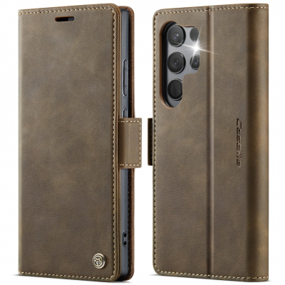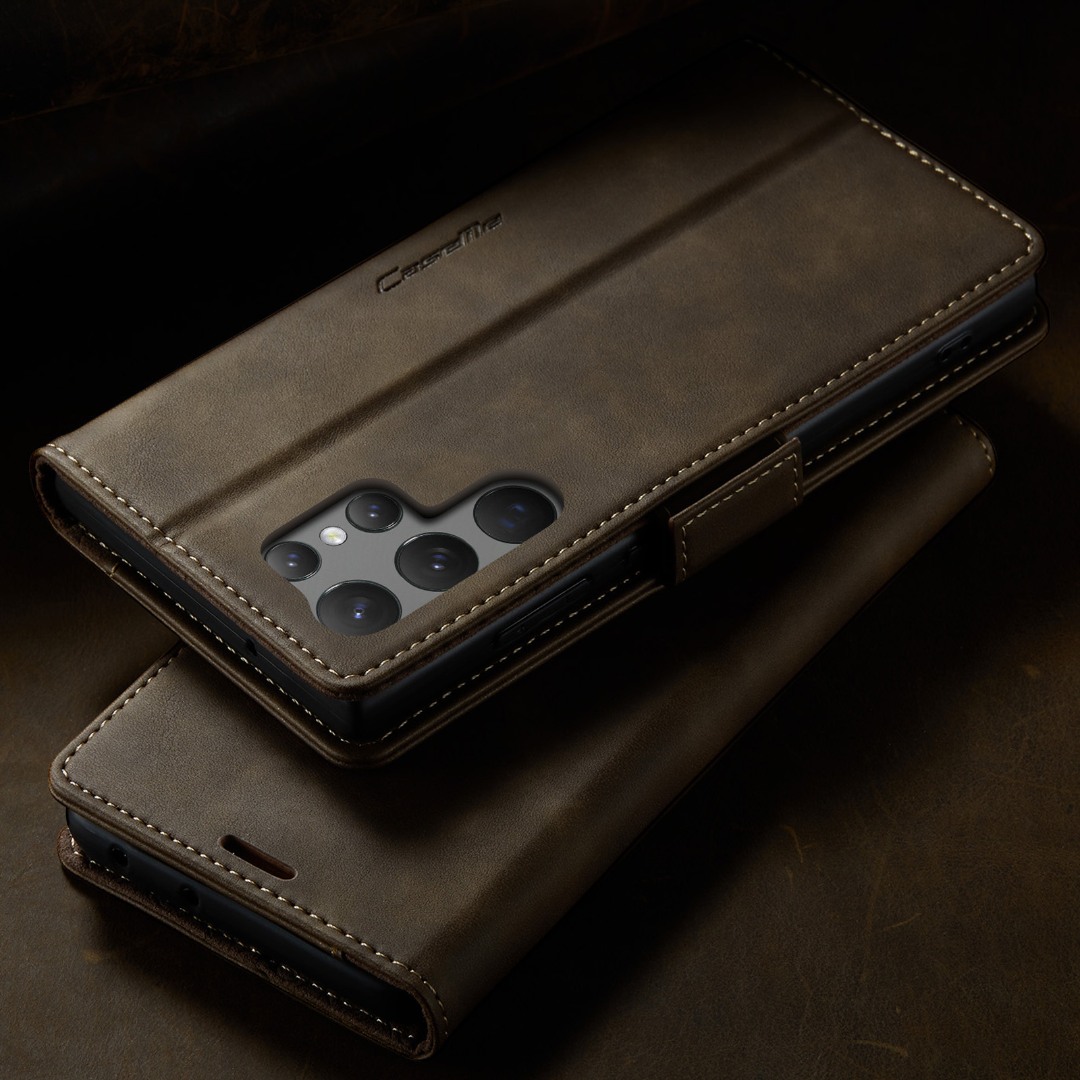 Husa pentru Samsung Galaxy S23 Ultra - Slim tip portofel, cu stand si inchidere magnetica – textura neteda, aderenta sigura, usor de curatat, design curat si minimalist, CaseMe, Brun clasic