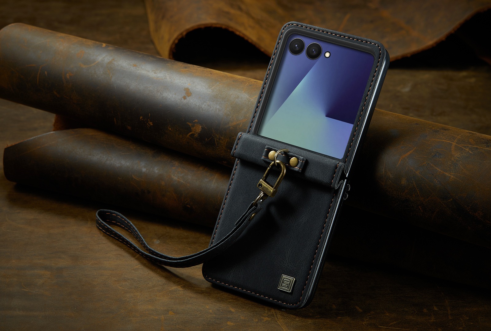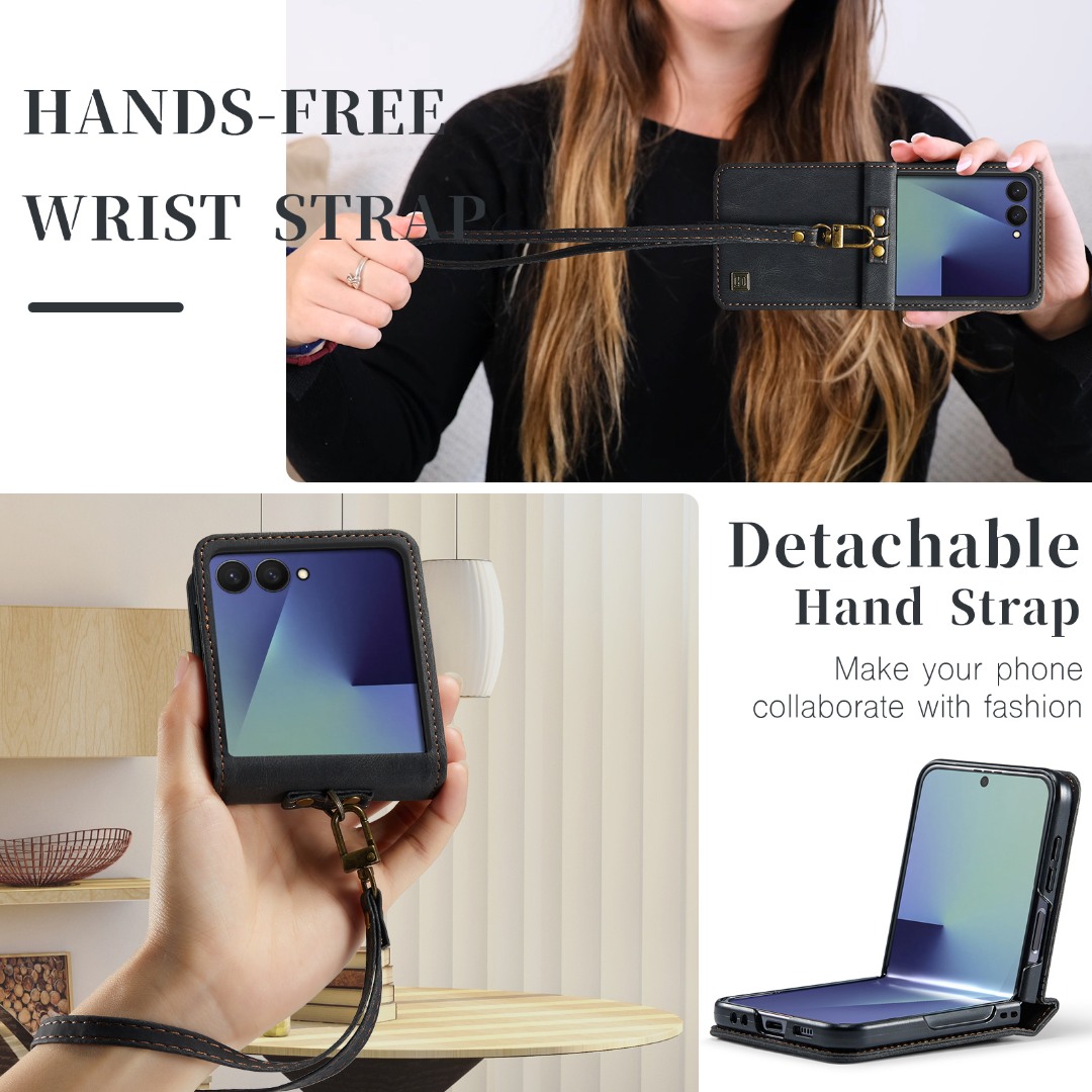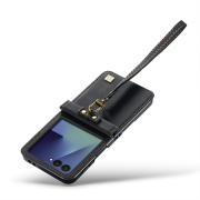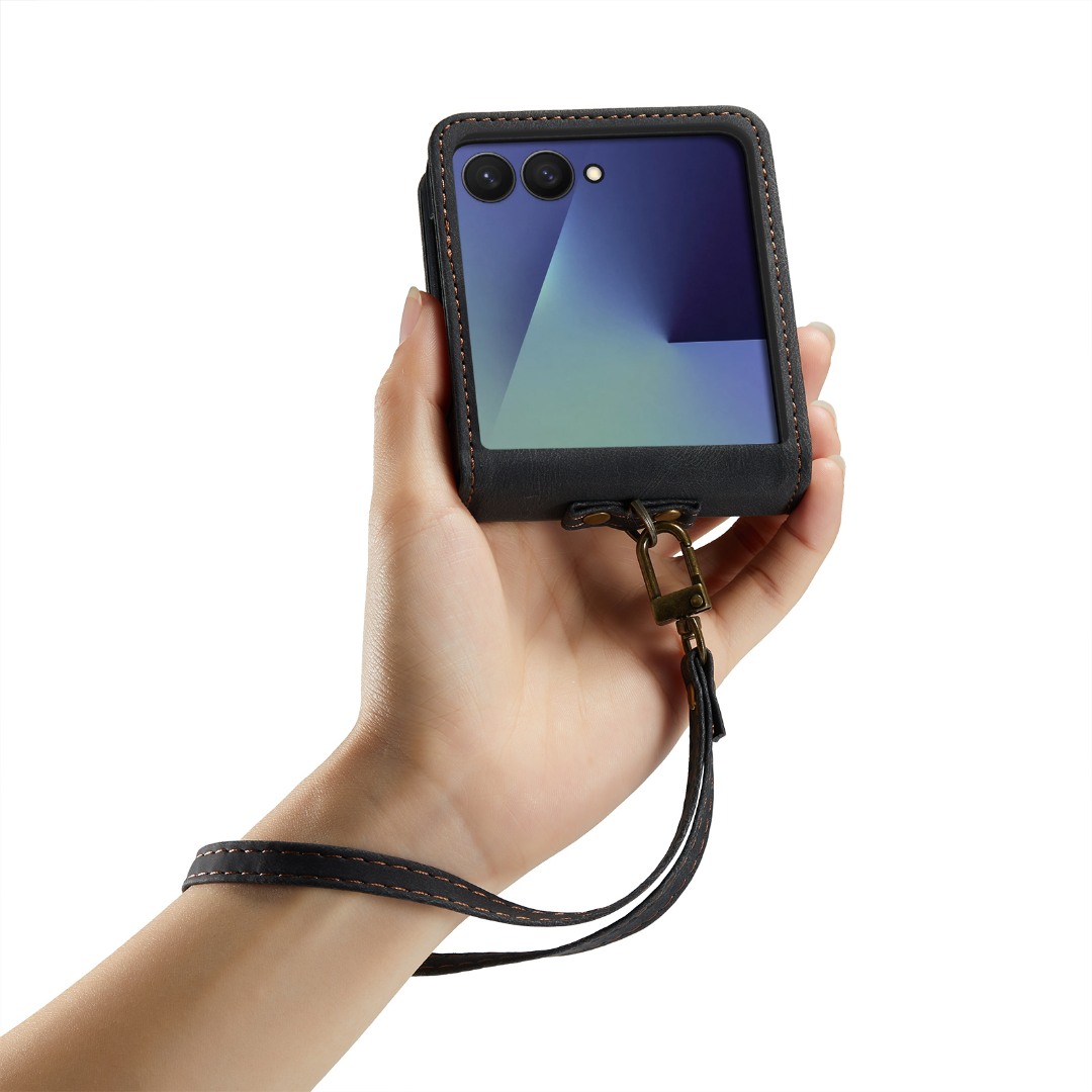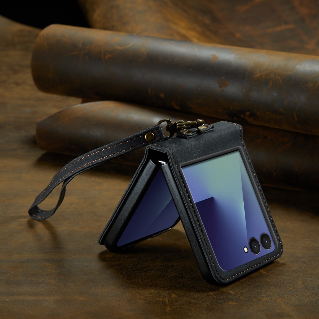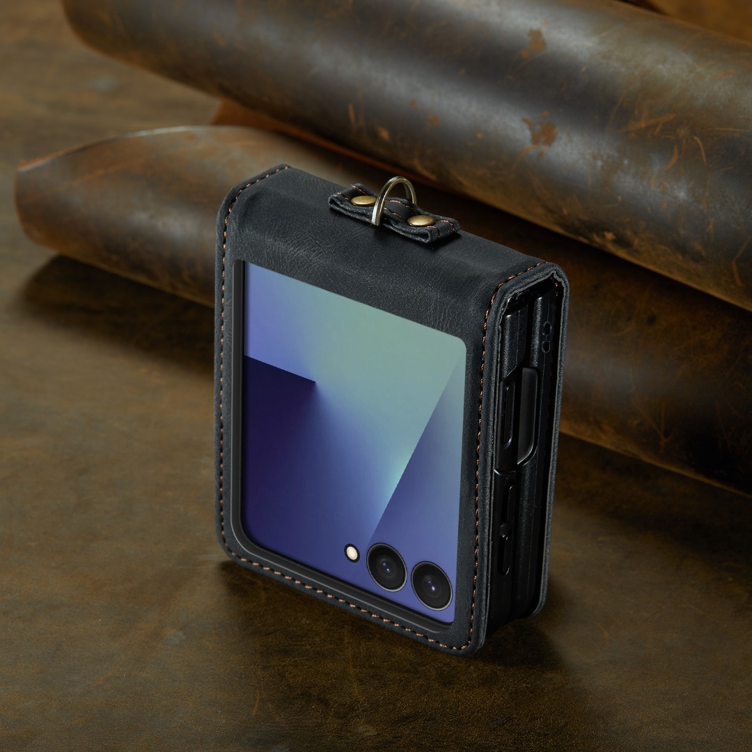 Husa pentru Samsung Galaxy Z Flip7, piele cu textura moale, carcasa cu curelusa de mana detasabila, protectie pentru balama si colturi, CaseMe Retro, Negru - Ash Black