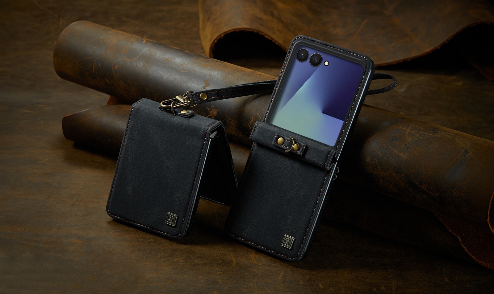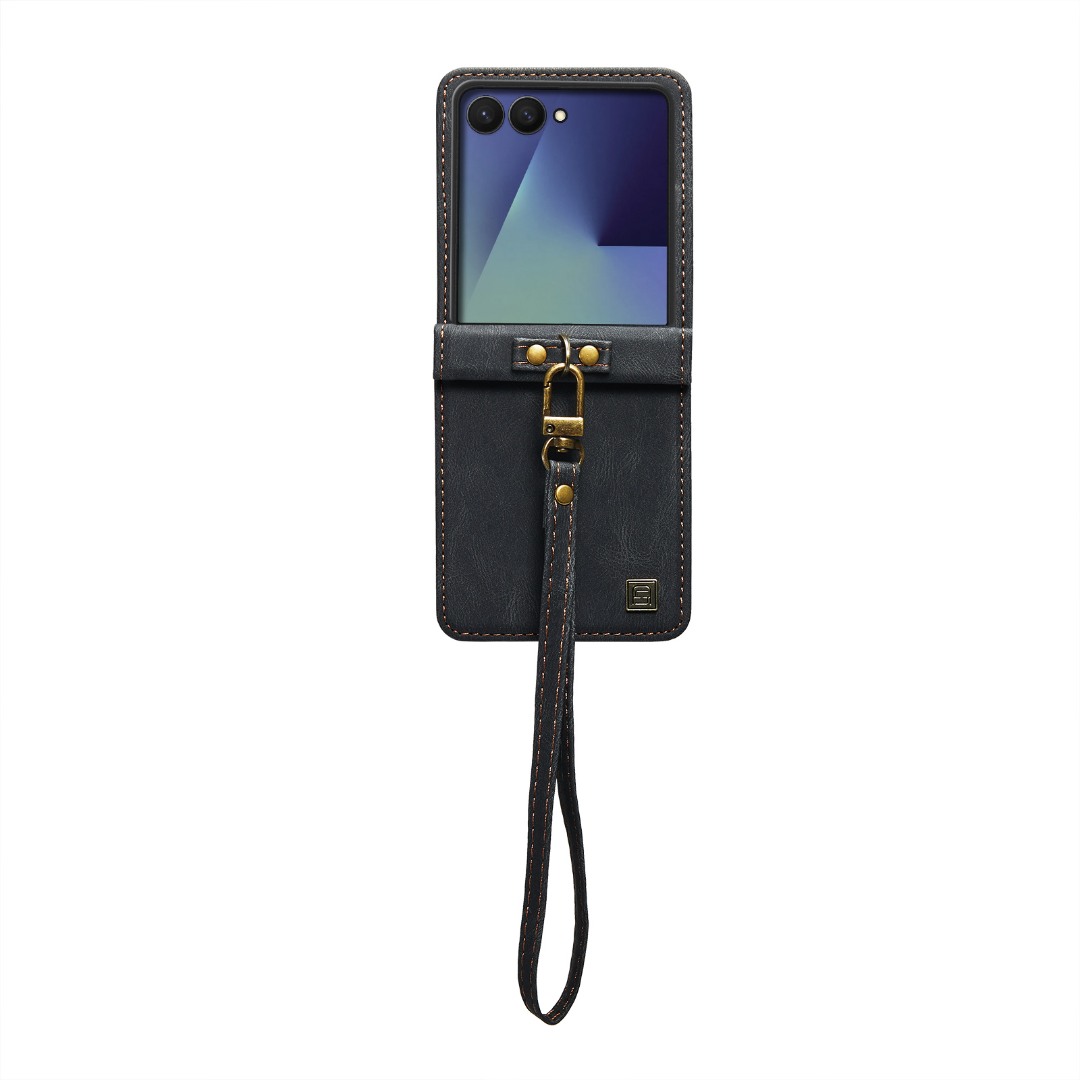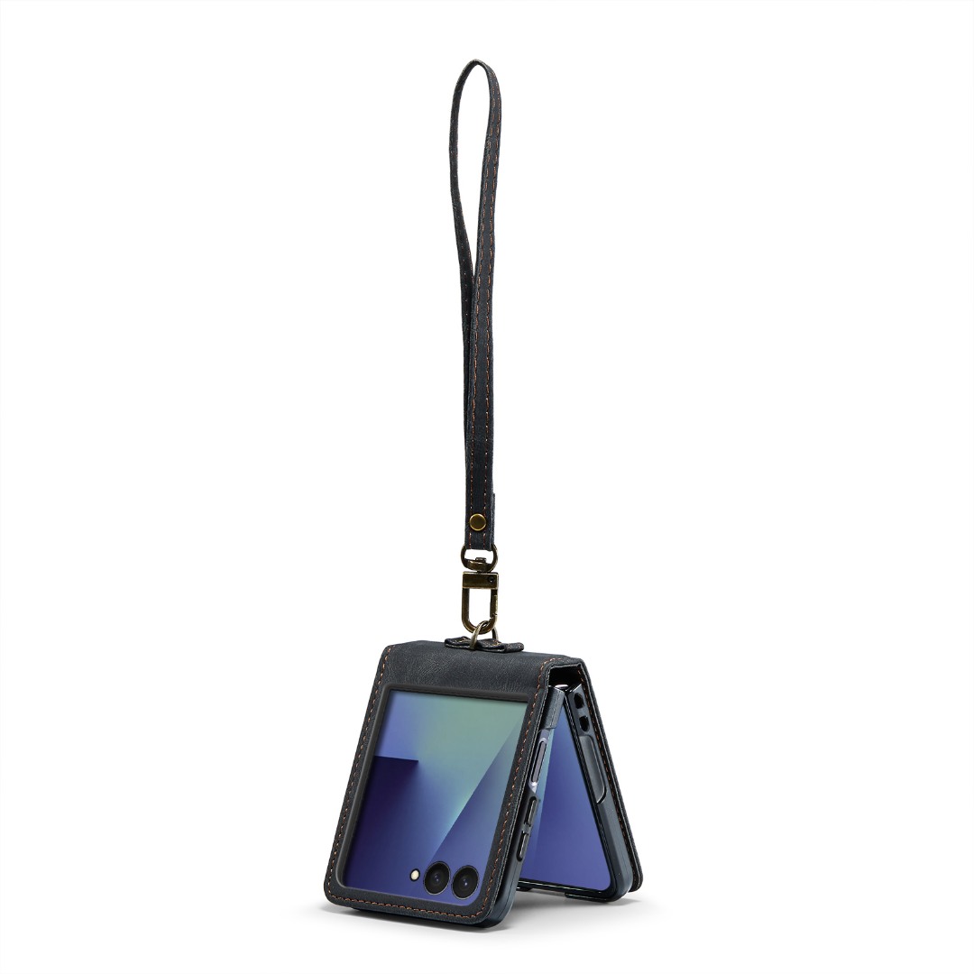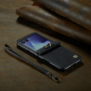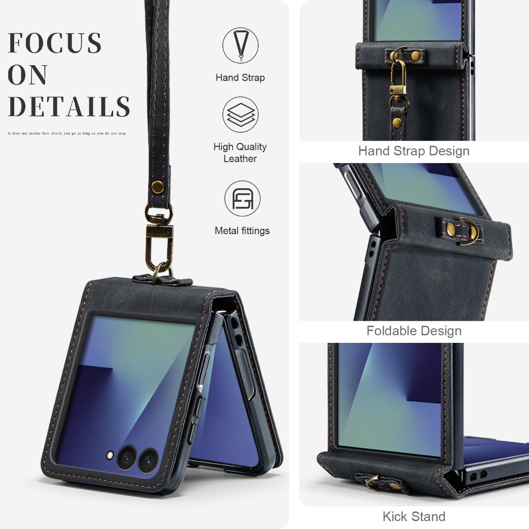 Husa pentru Samsung Galaxy Z Flip7, piele cu textura moale, carcasa cu curelusa de mana detasabila, protectie pentru balama si colturi, CaseMe Retro, Negru - Ash Black