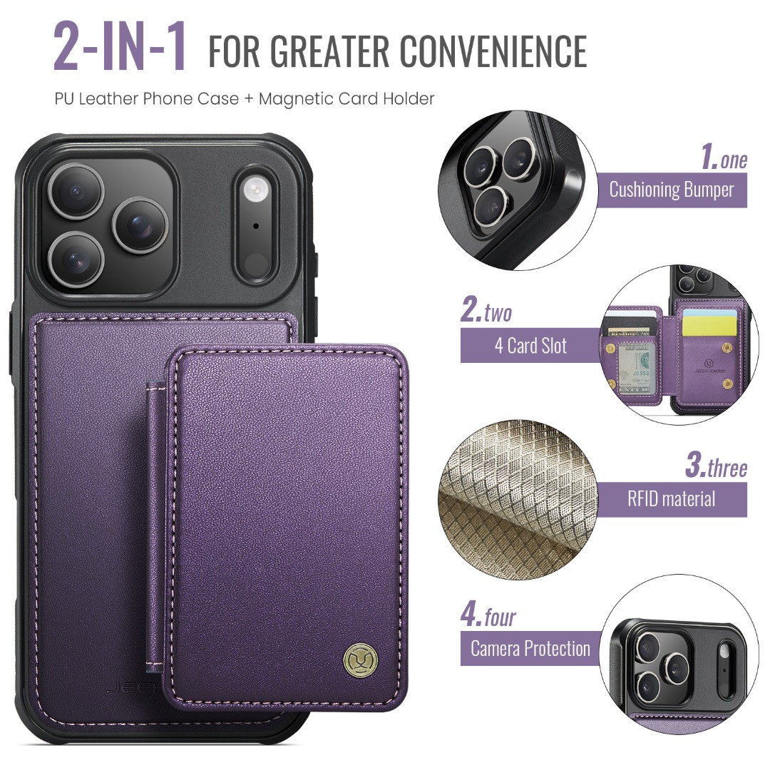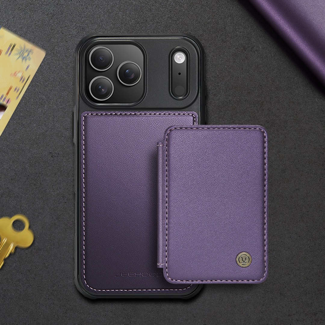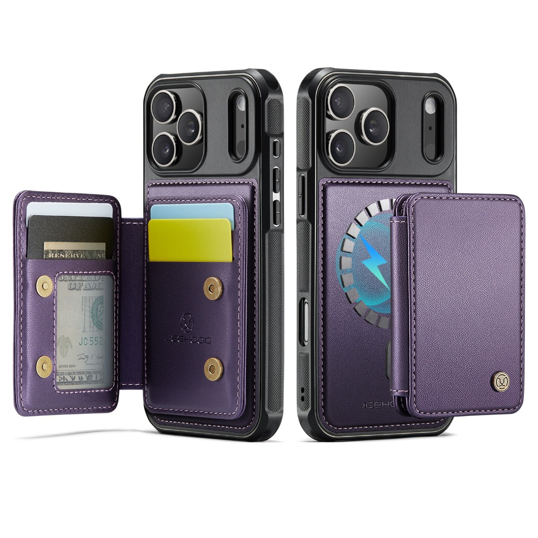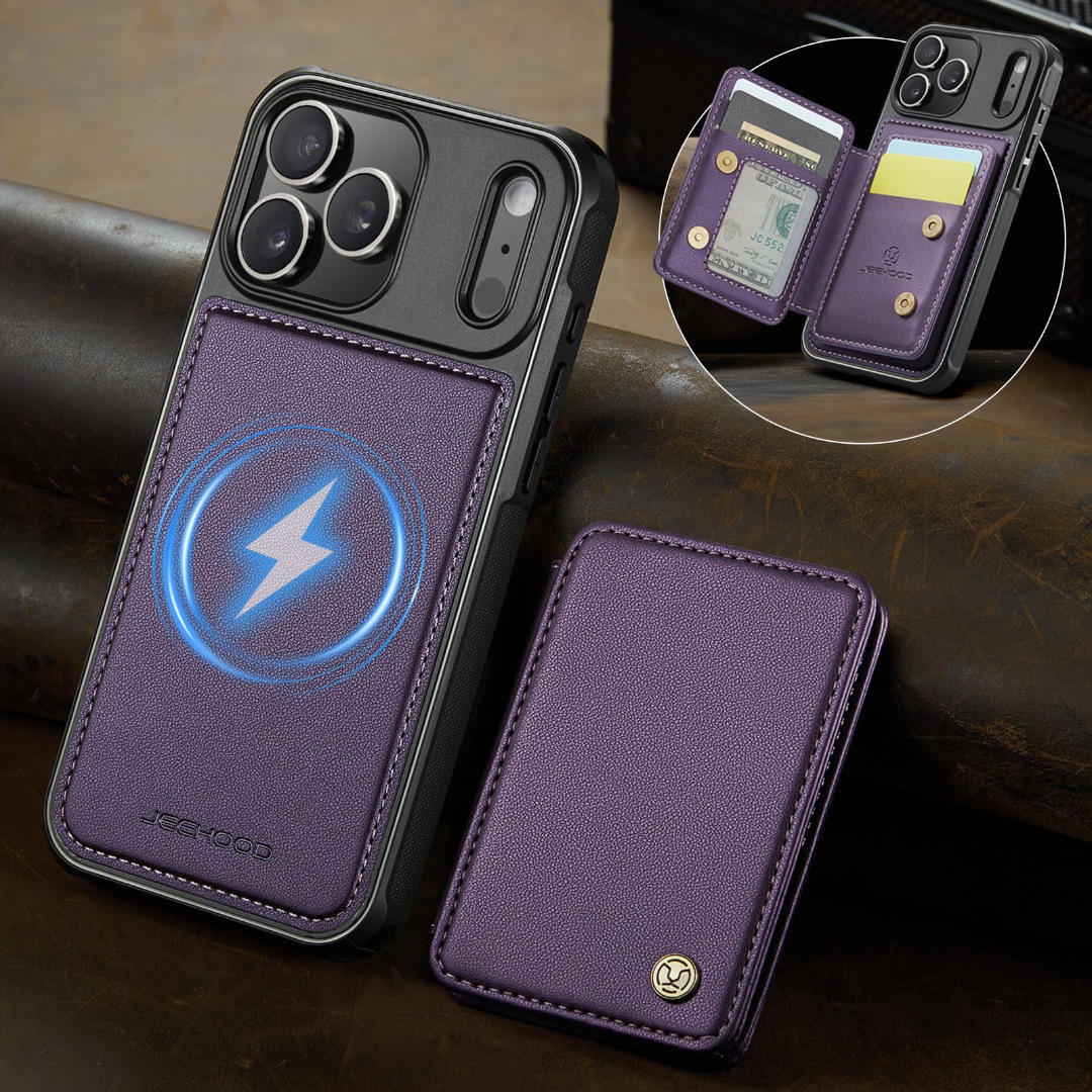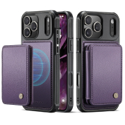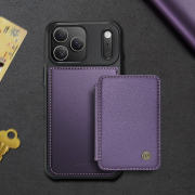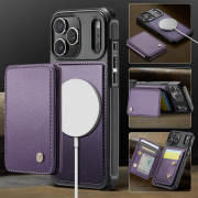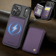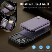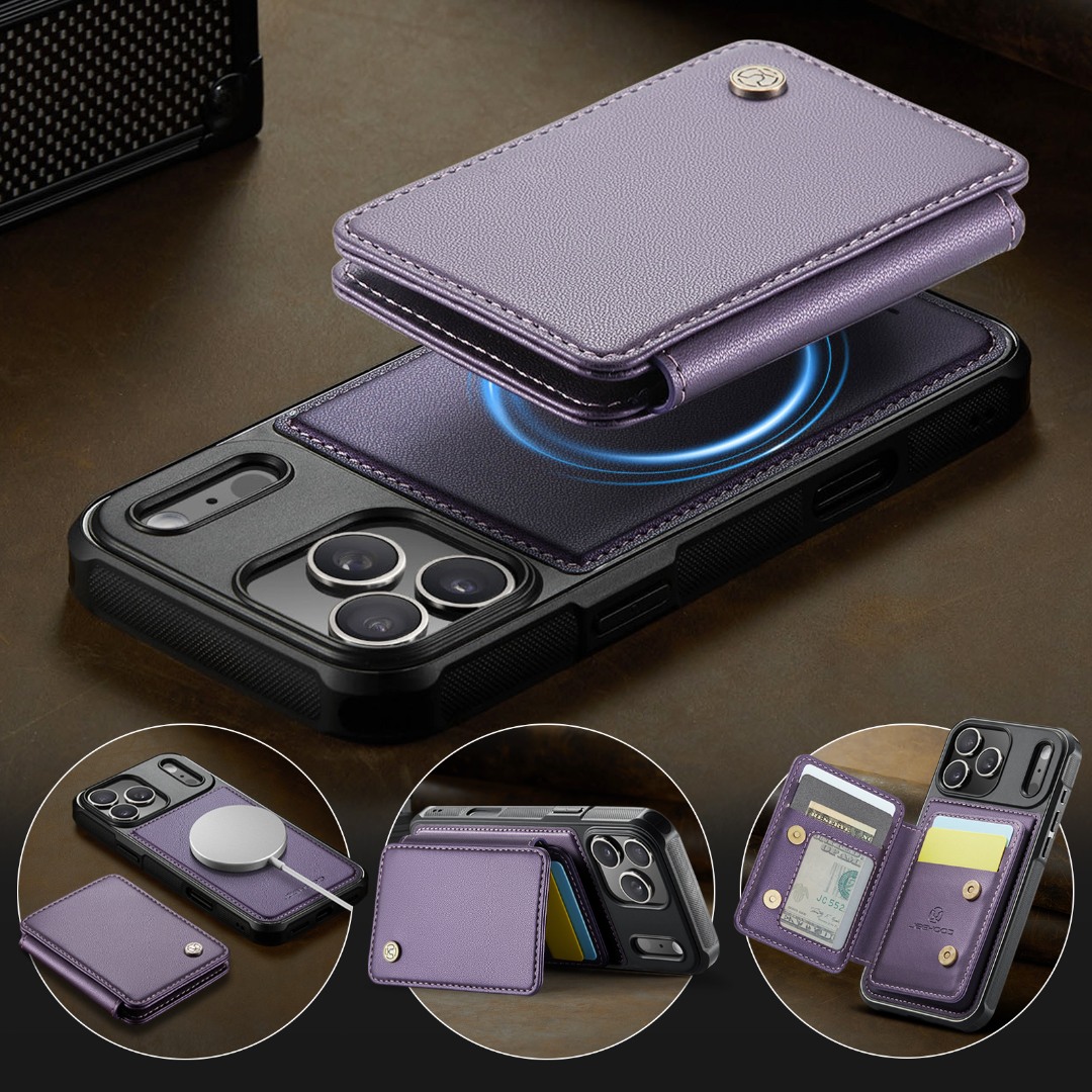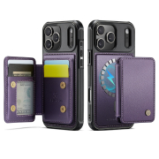Husa piele cu textura moale si aderenta in mana, back cover, mini portofel magnetic detasabil, slot carduri, functie stand, protectie RFID, compatibil MagSafe, iPhone 17 Pro, CaseMe, Mov
