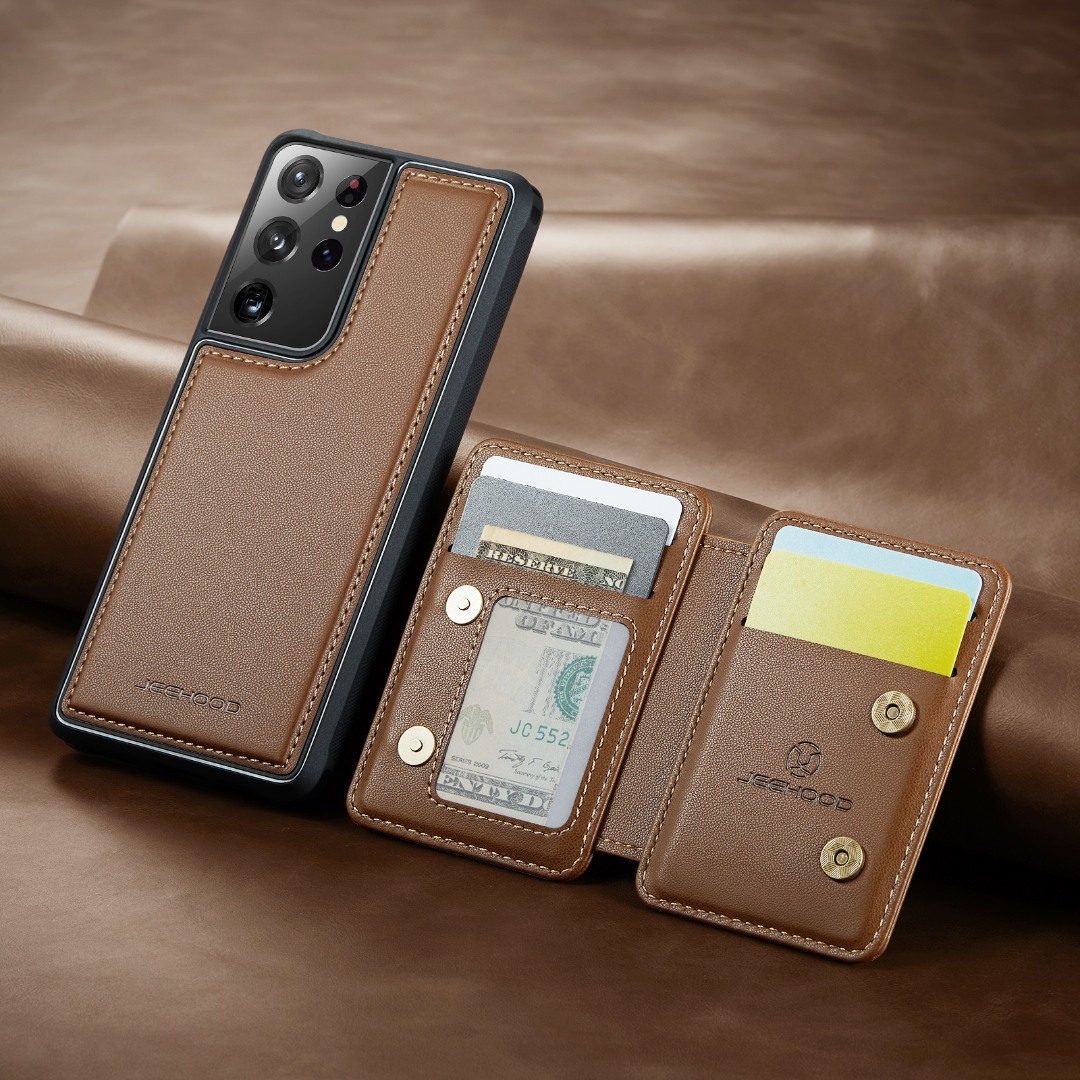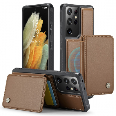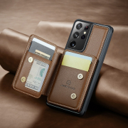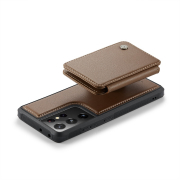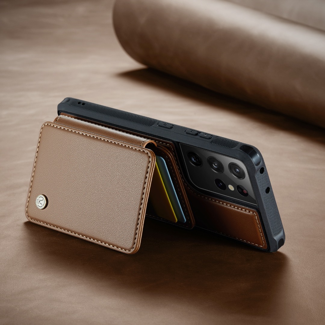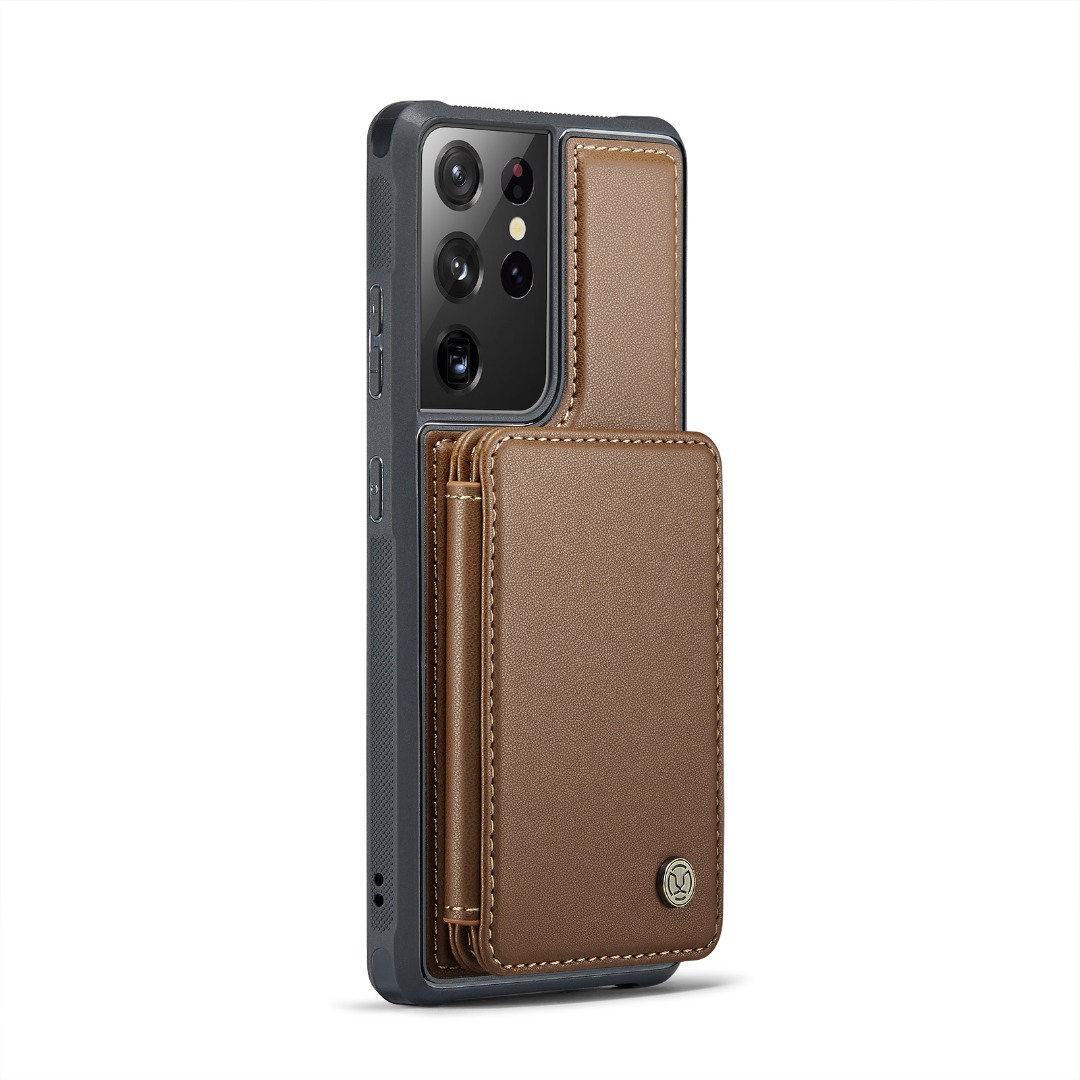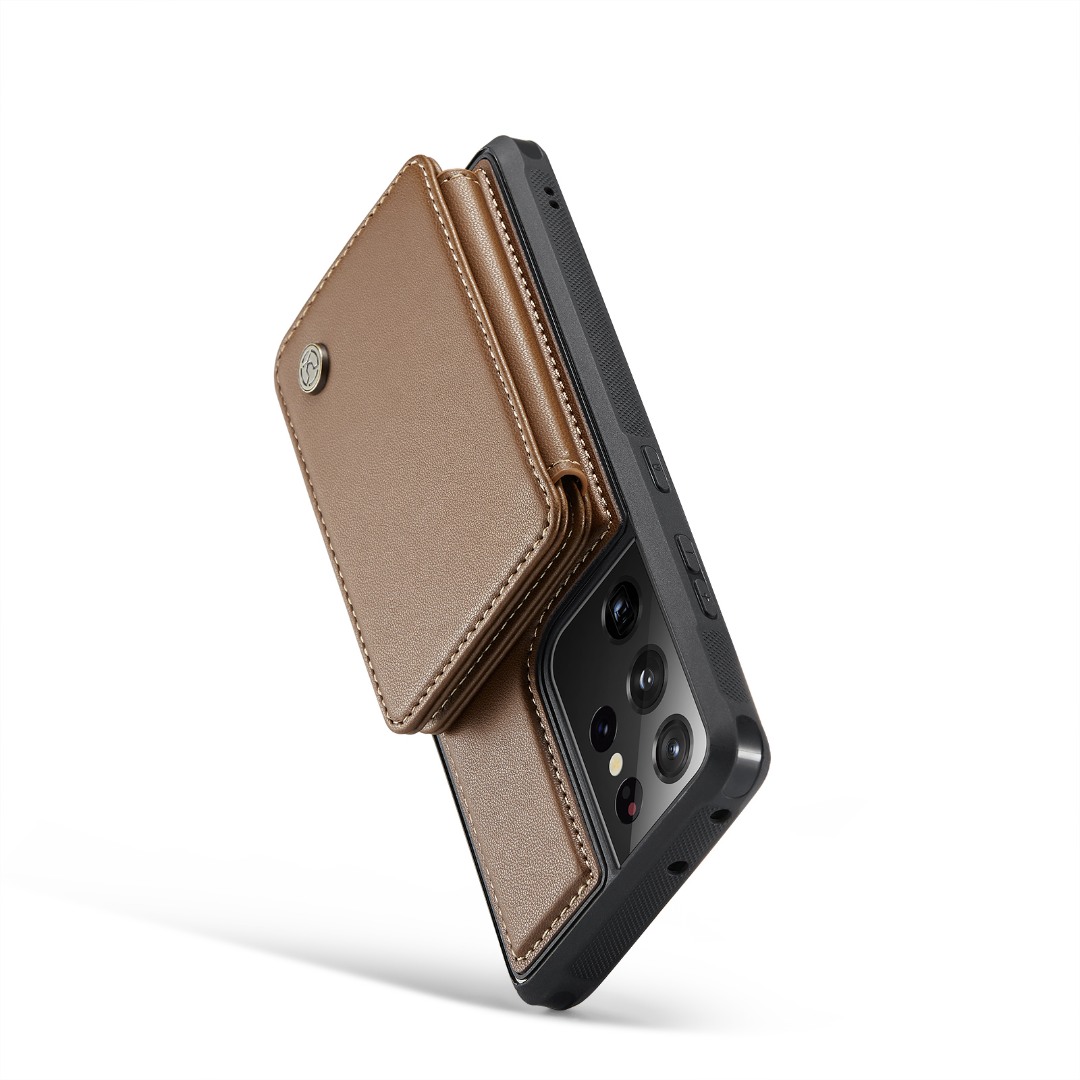 Husa piele cu textura moale si aderenta in mana, back cover, mini portofel magnetic detasabil, slot carduri, functie stand, protectie RFID, Samsung Galaxy S21 Ultra, CaseMe, Maro