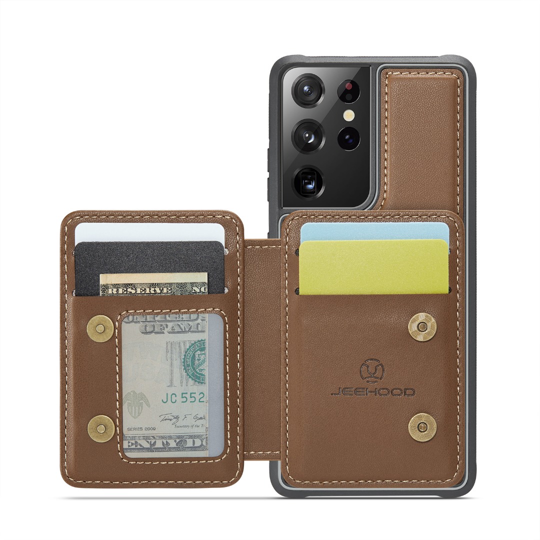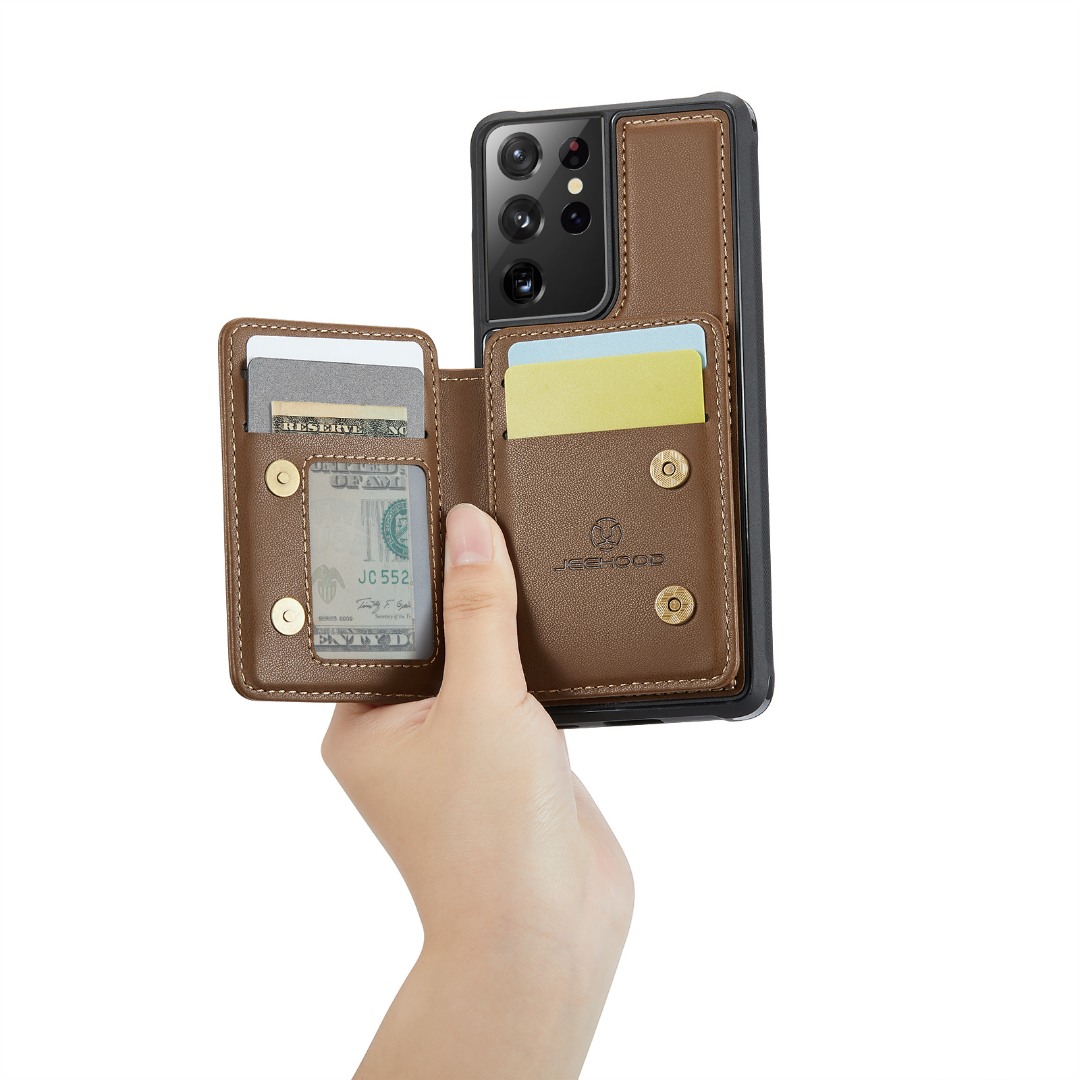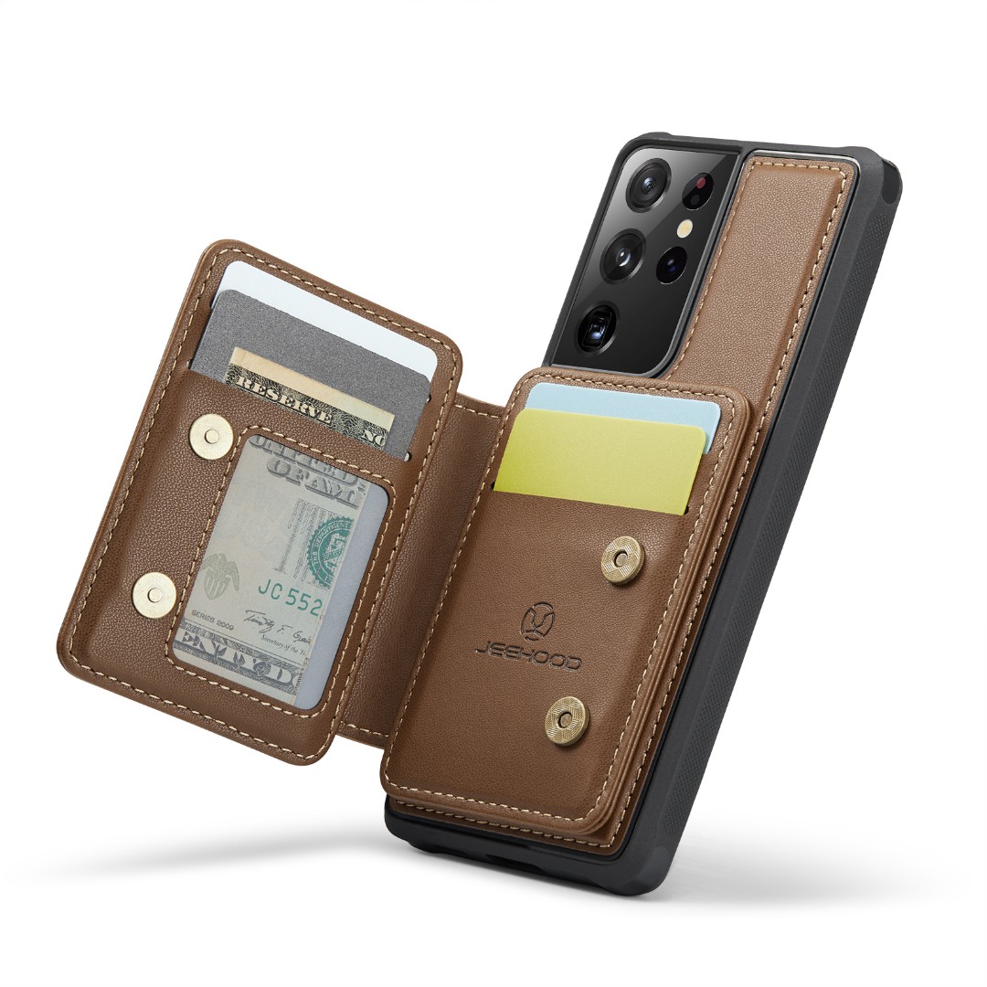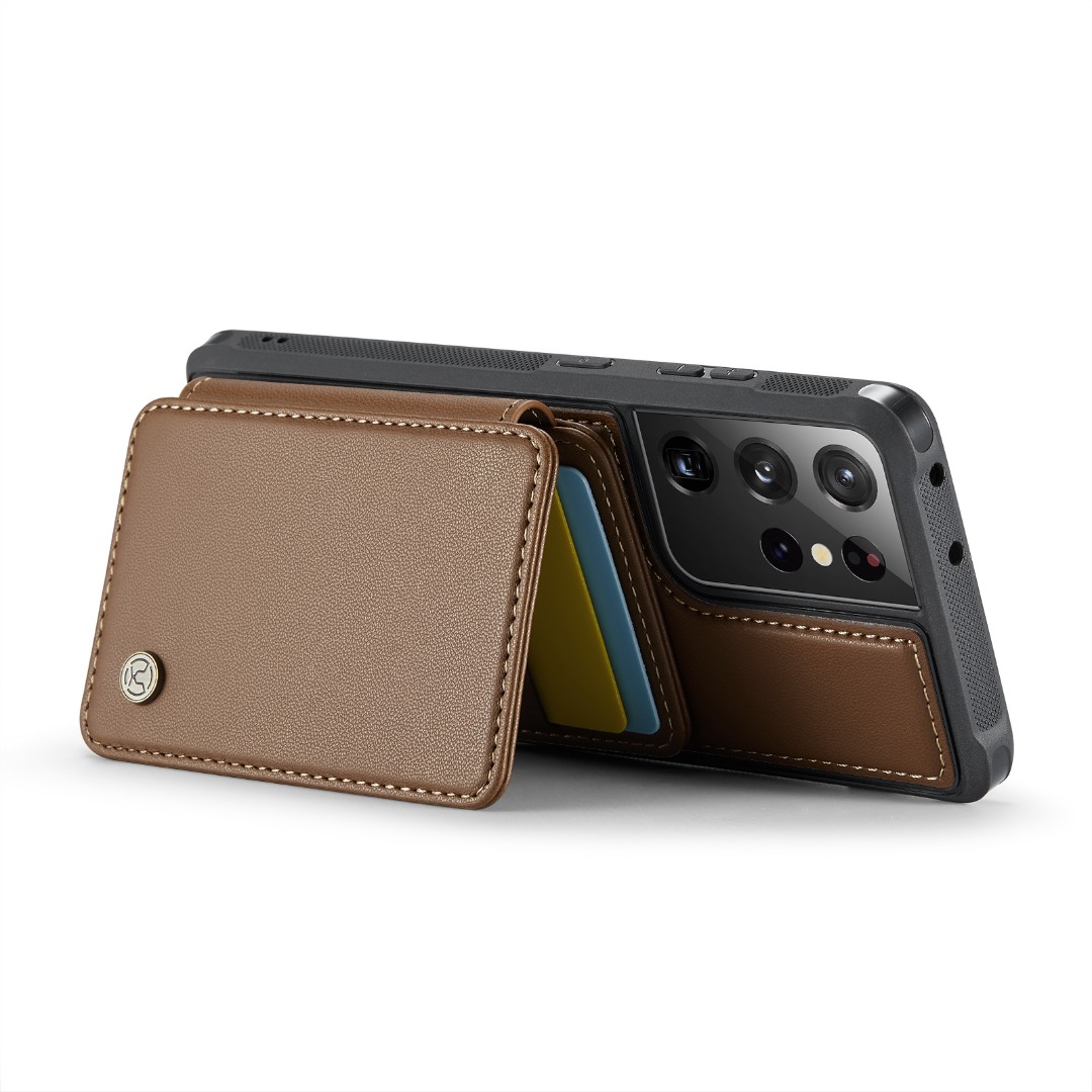 Husa piele cu textura moale si aderenta in mana, back cover, mini portofel magnetic detasabil, slot carduri, functie stand, protectie RFID, Samsung Galaxy S21 Ultra, CaseMe, Maro