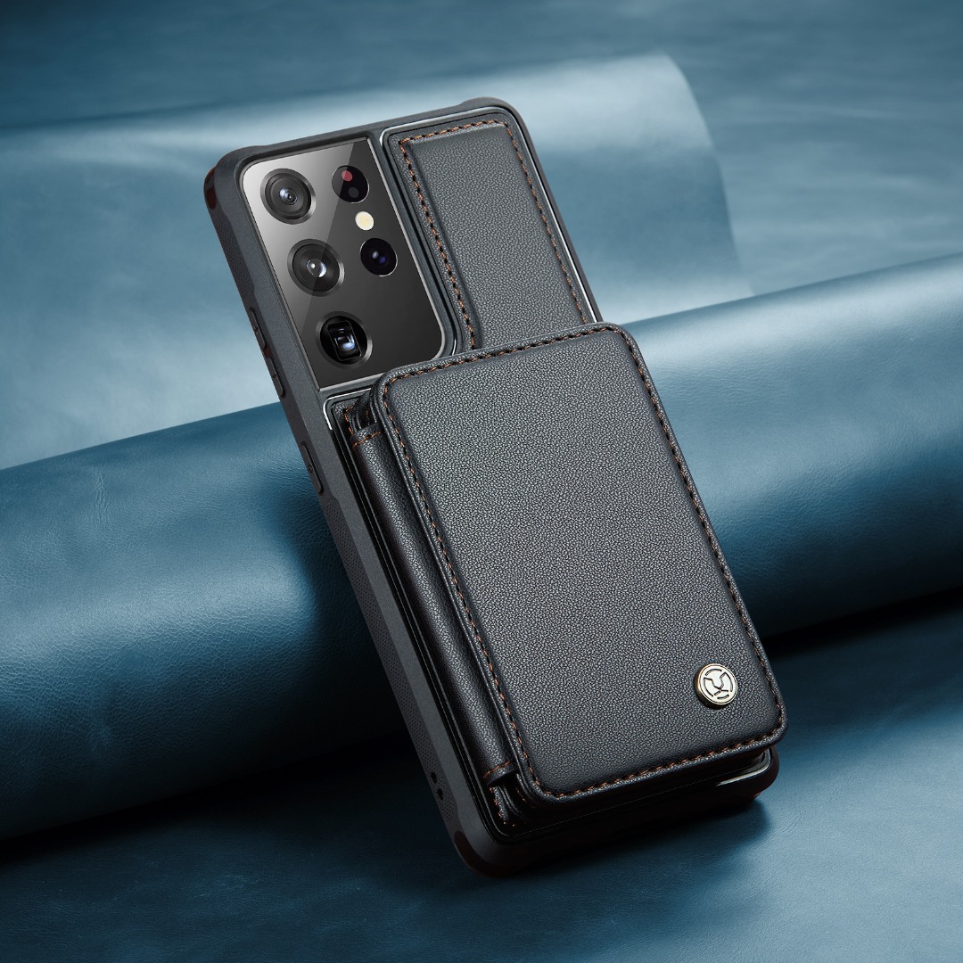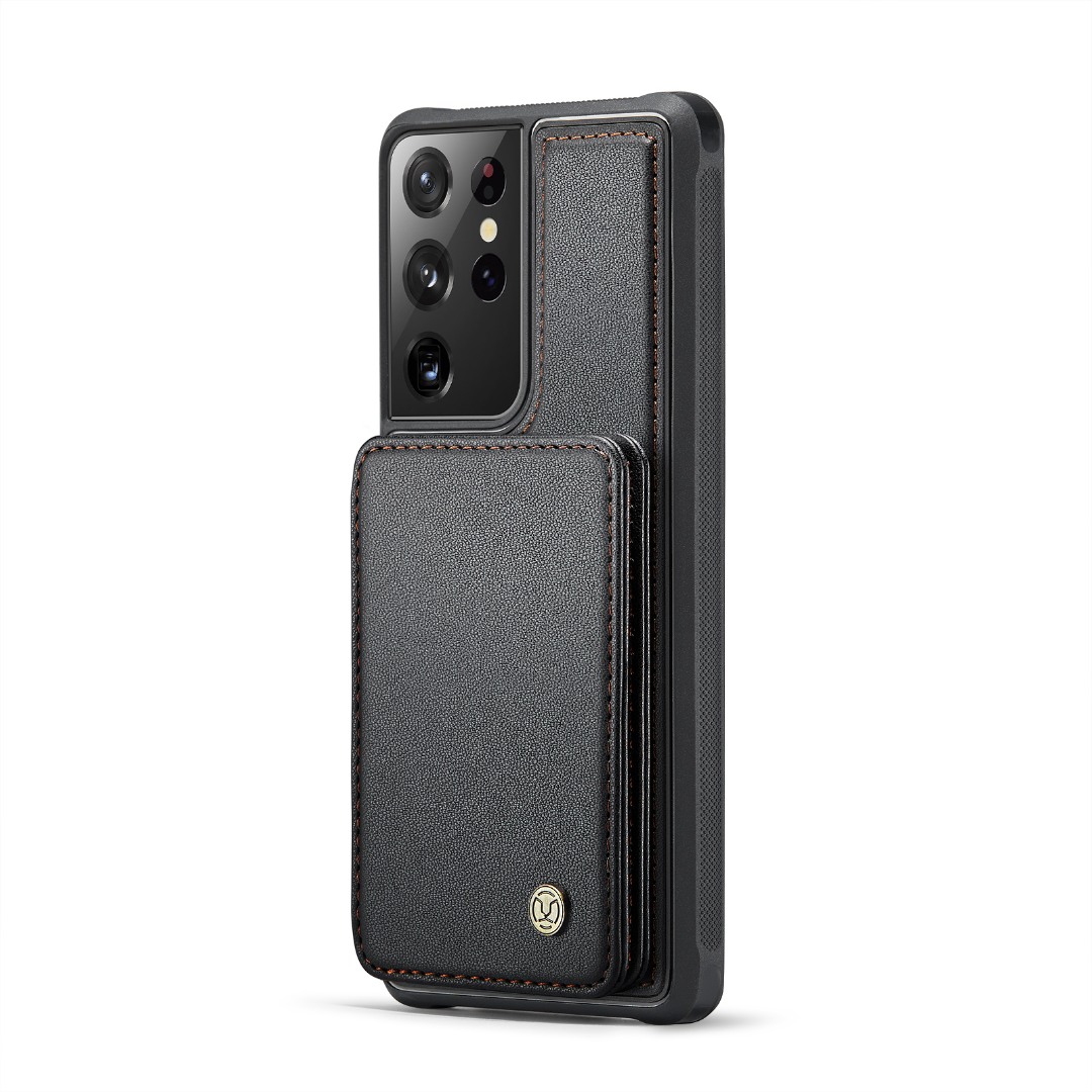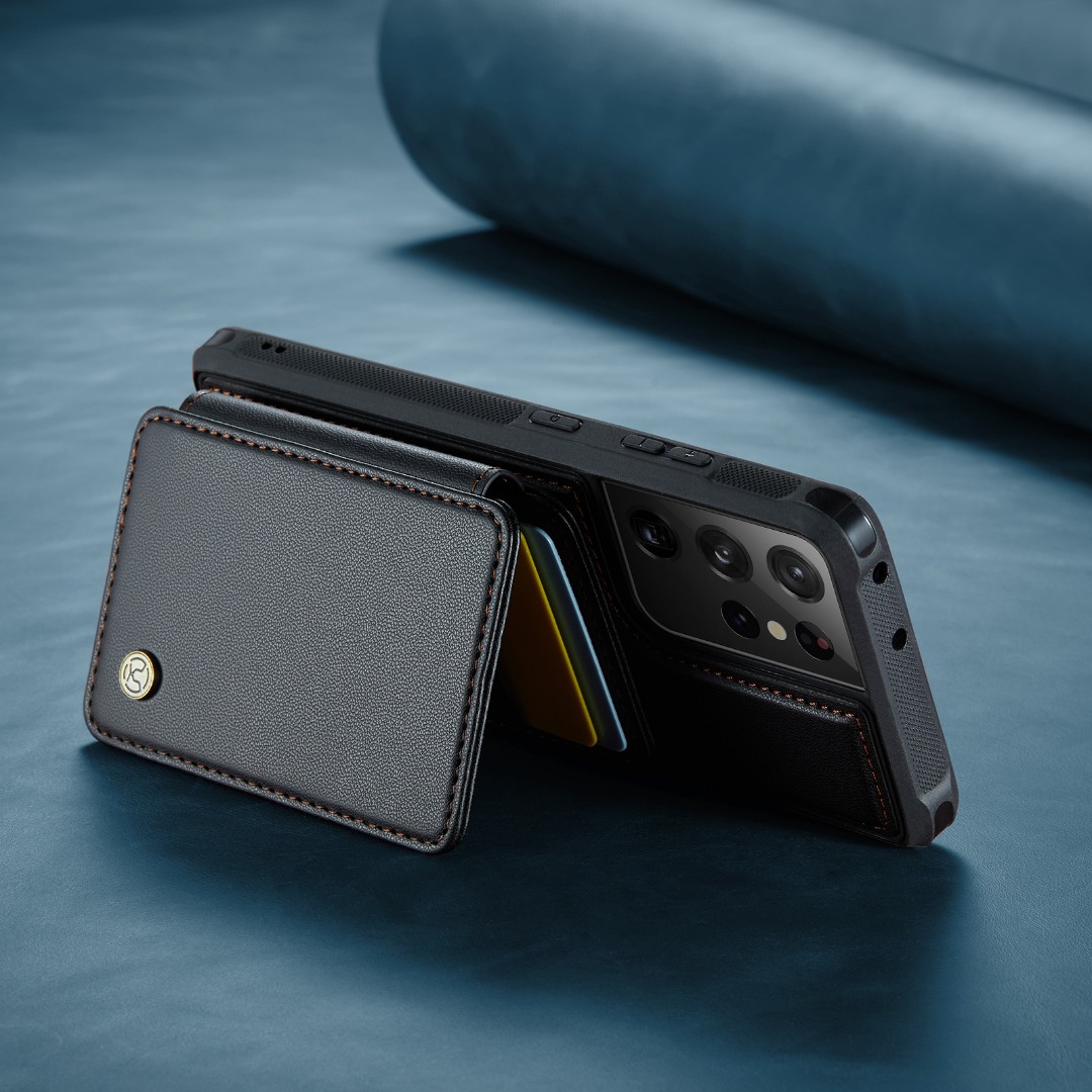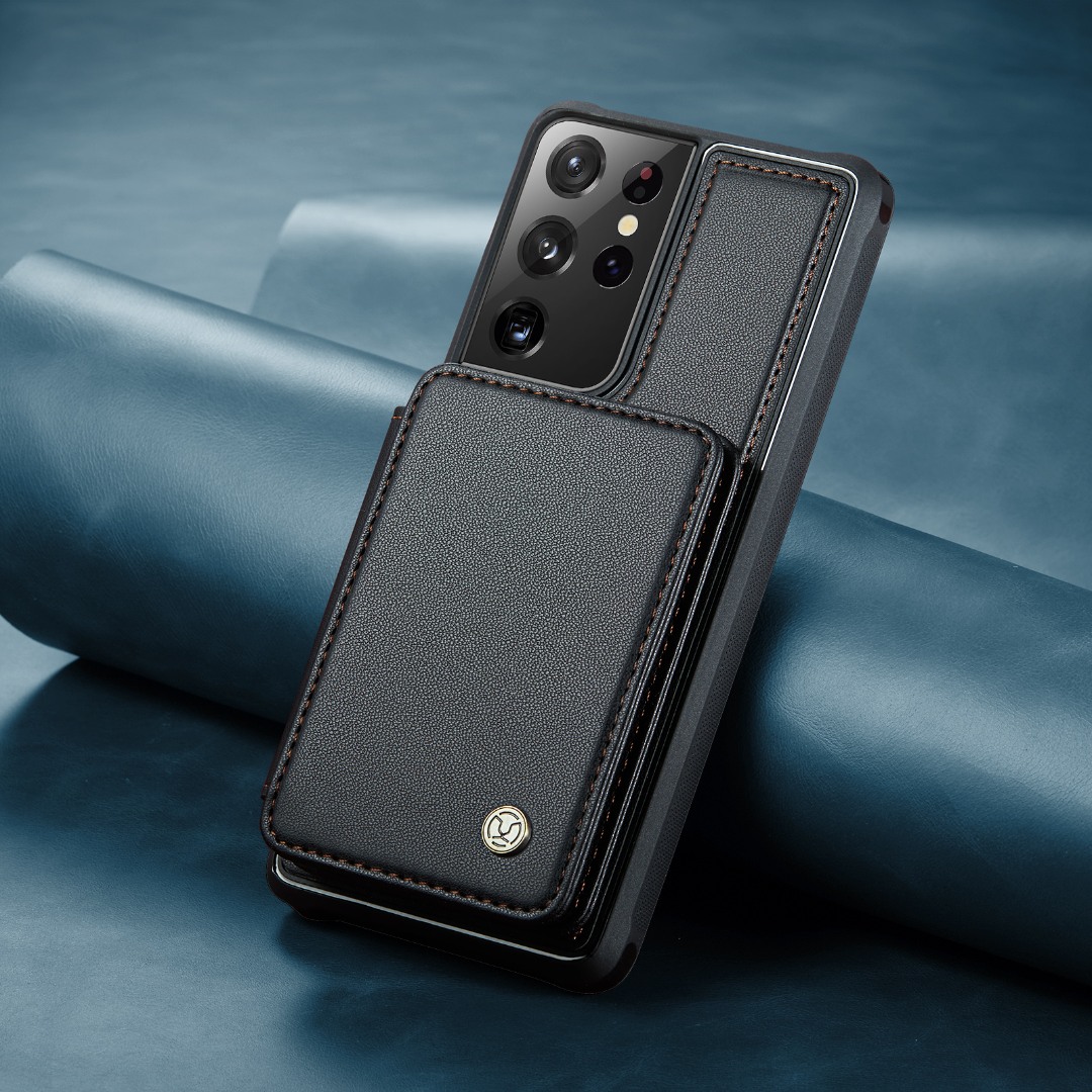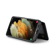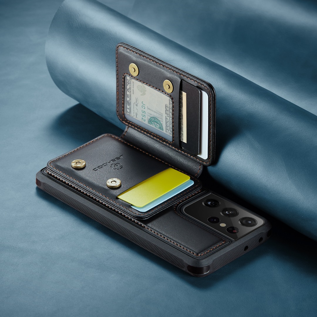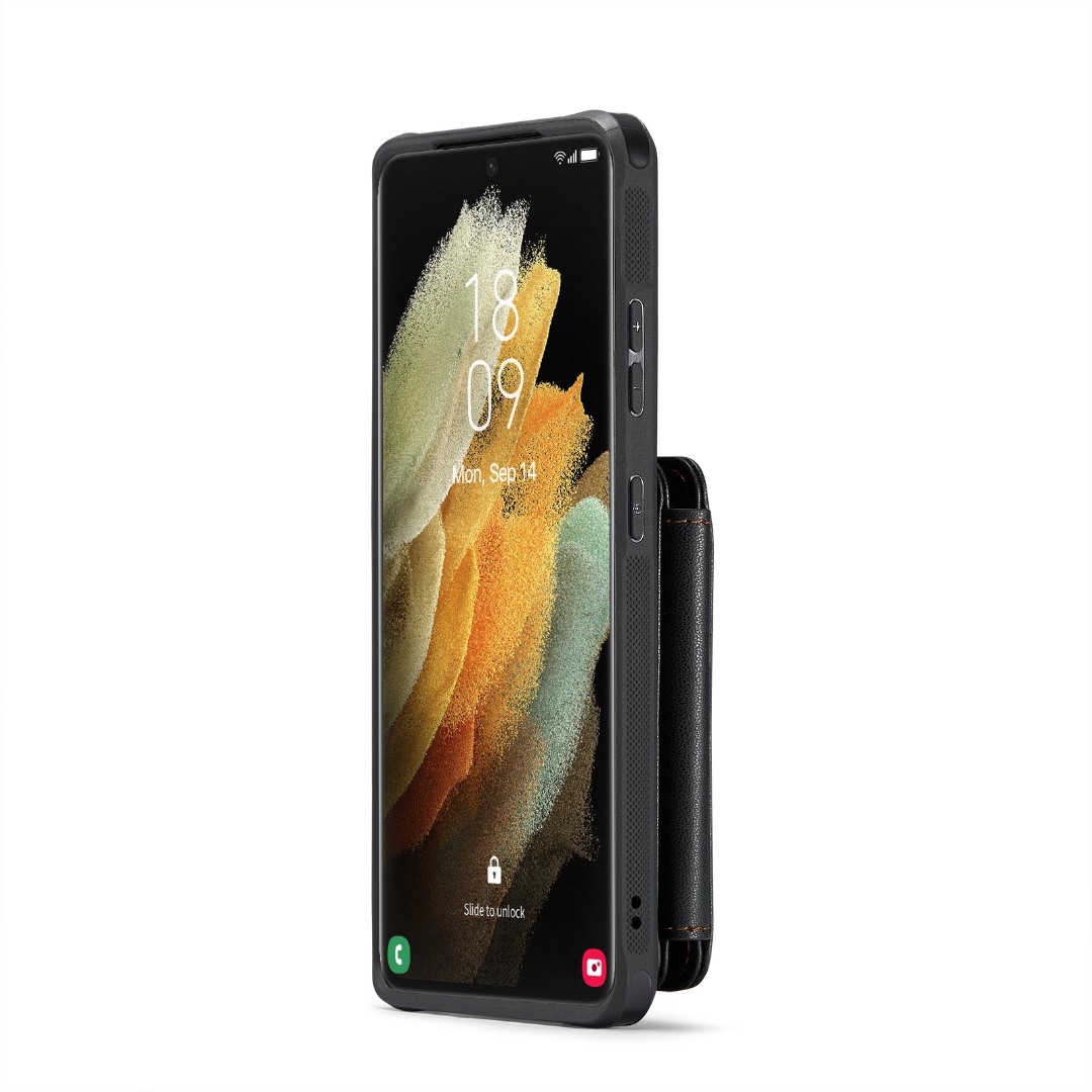 Husa piele cu textura moale si aderenta in mana, back cover, mini portofel magnetic detasabil, slot carduri, functie stand, protectie RFID, Samsung Galaxy S21 Ultra, CaseMe, Negru