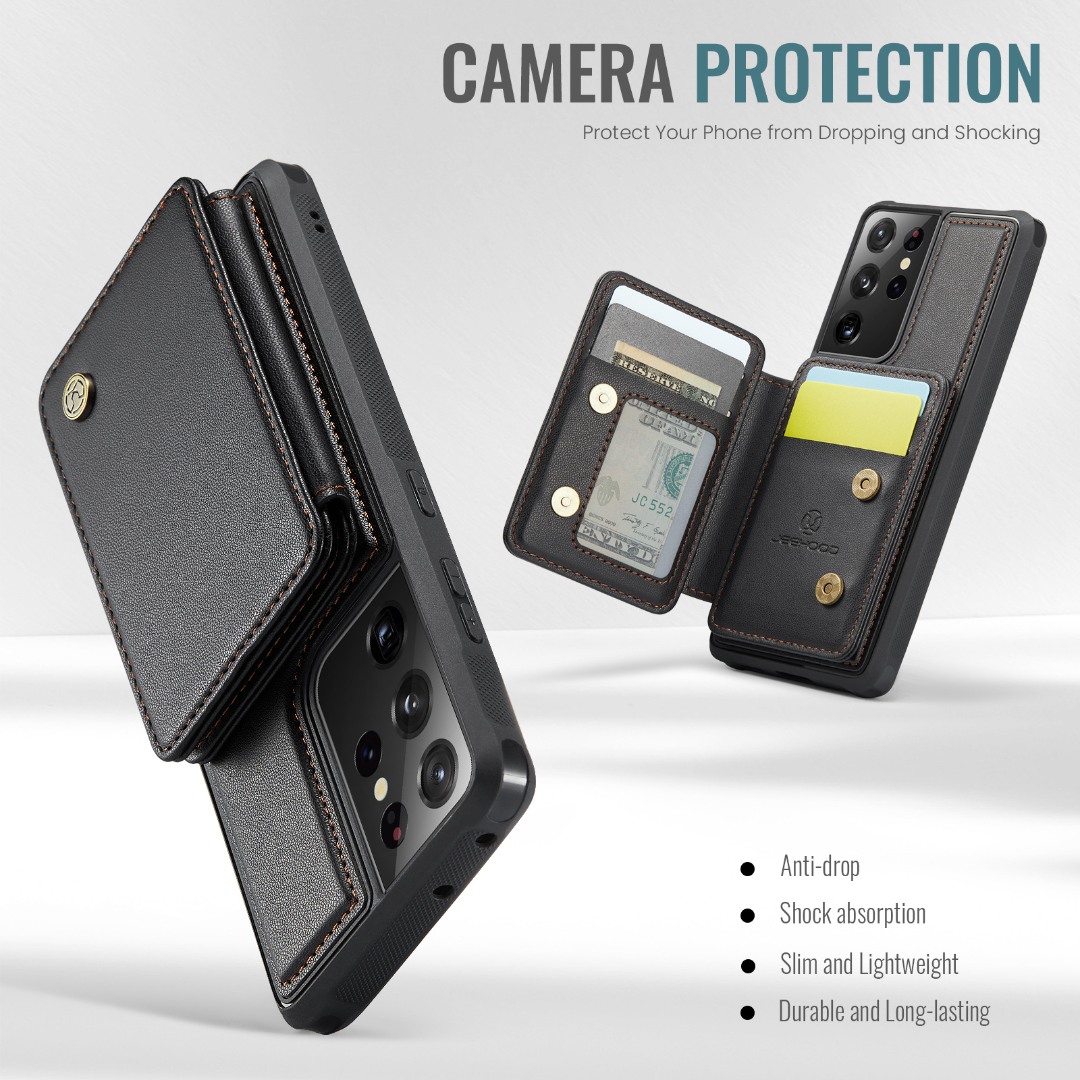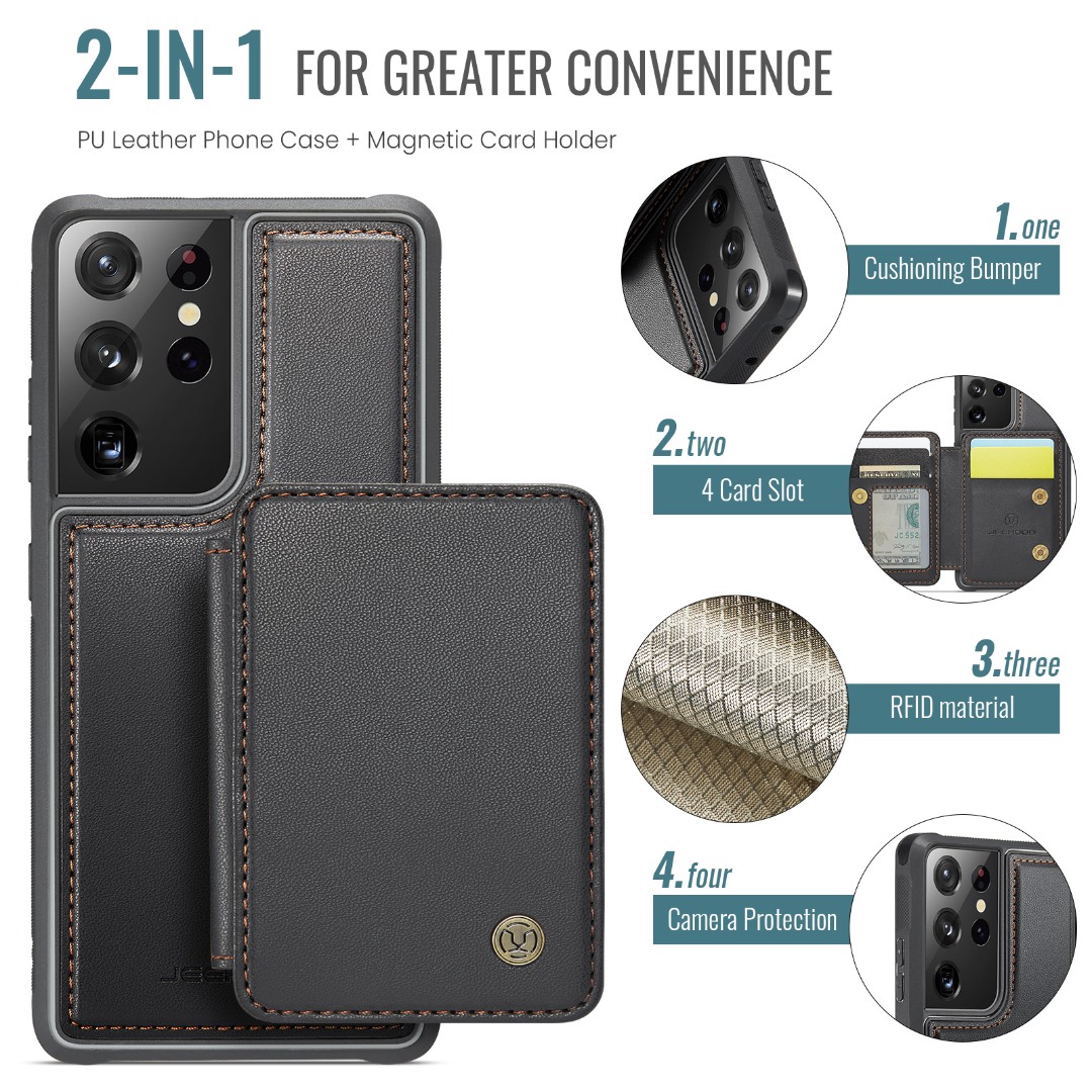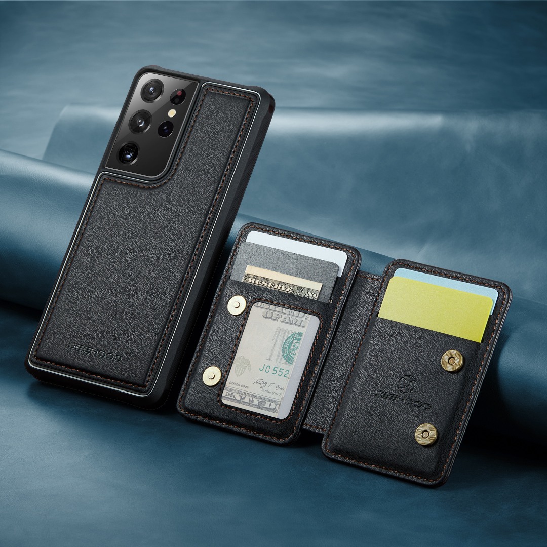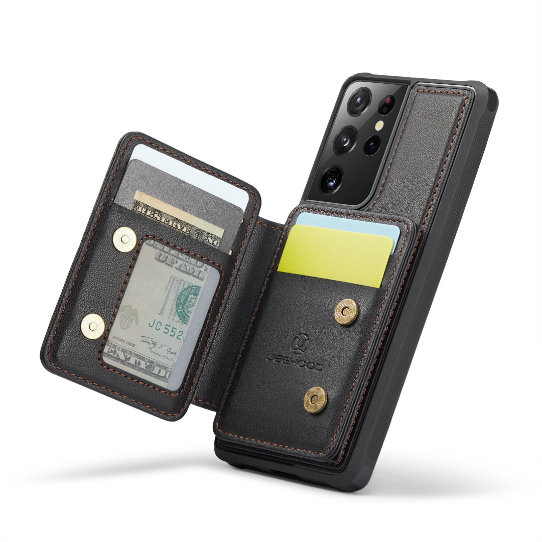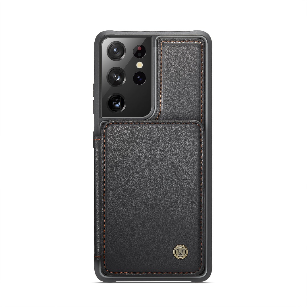 Husa piele cu textura moale si aderenta in mana, back cover, mini portofel magnetic detasabil, slot carduri, functie stand, protectie RFID, Samsung Galaxy S21 Ultra, CaseMe, Negru