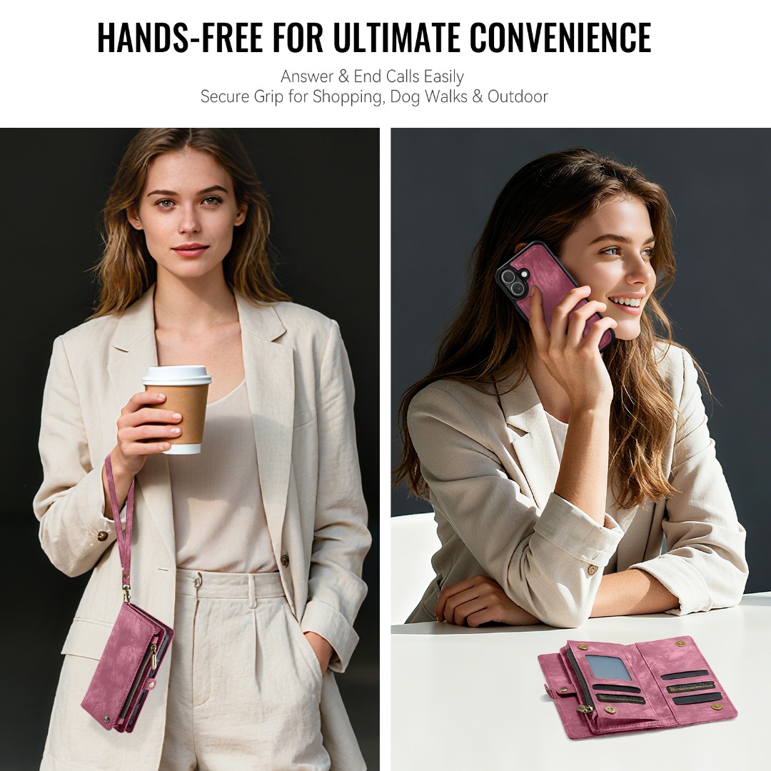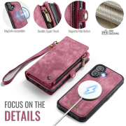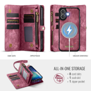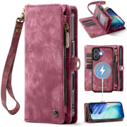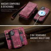 Husa piele portofel 2 in 1, multifunctionala, back cover detasabil, curelusa mana, compatibil MagSafe, inchidere sigura magnetica, stand, buzunare carduri, bani, casti, chei, iPhone 17 - CaseME, Rosu