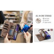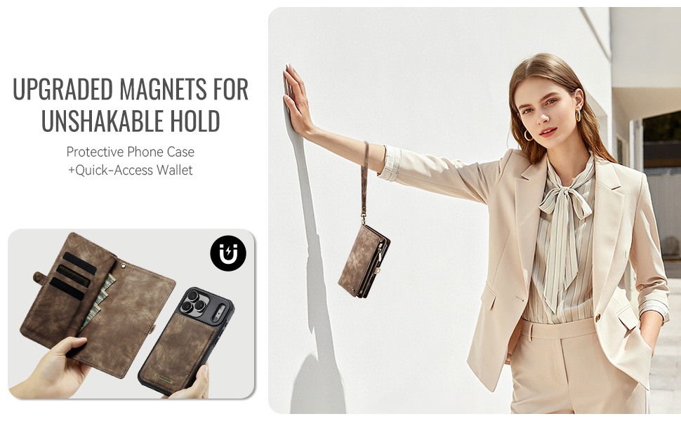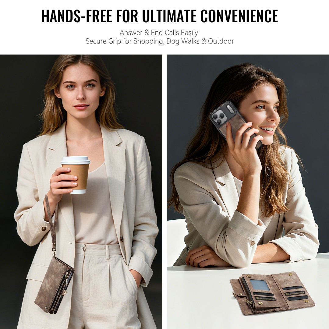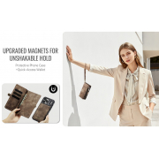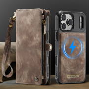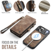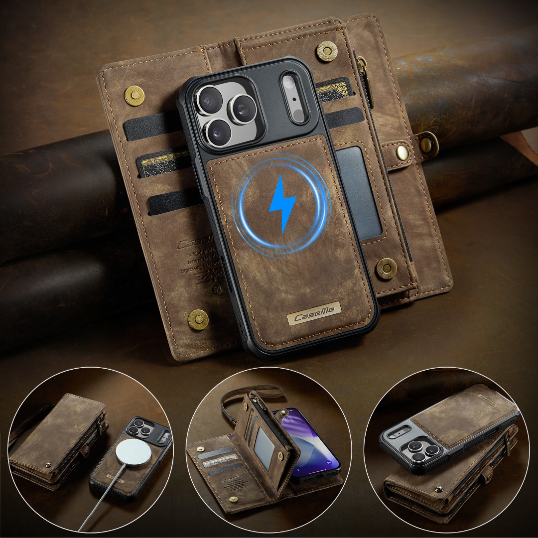 Husa piele portofel 2 in 1, multifunctionala, back cover detasabil, curelusa mana, compatibil MagSafe, inchidere sigura magnetica, stand, buzunare carduri, bani, casti, chei, iPhone 17 Pro - CaseME, Maro