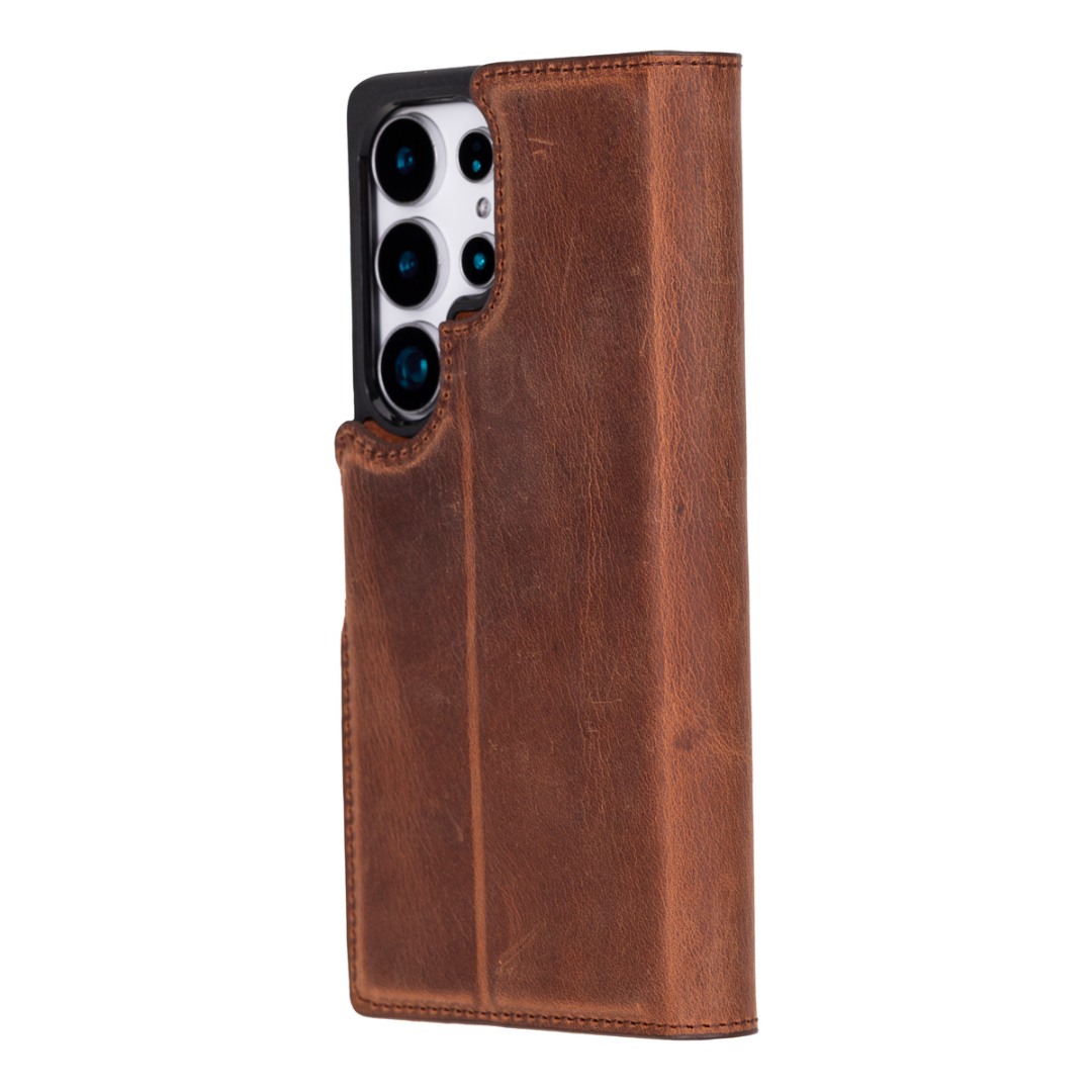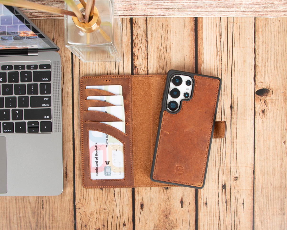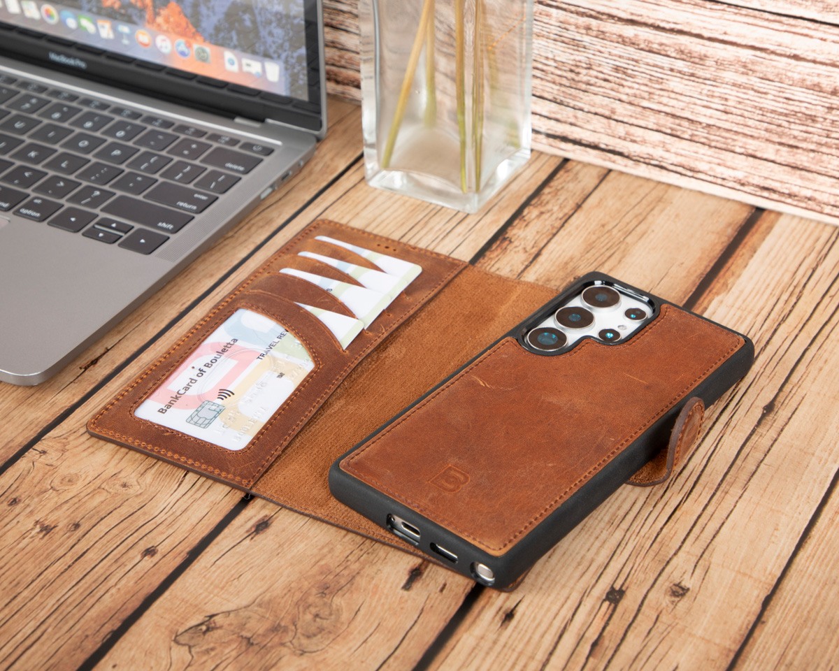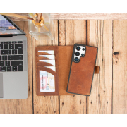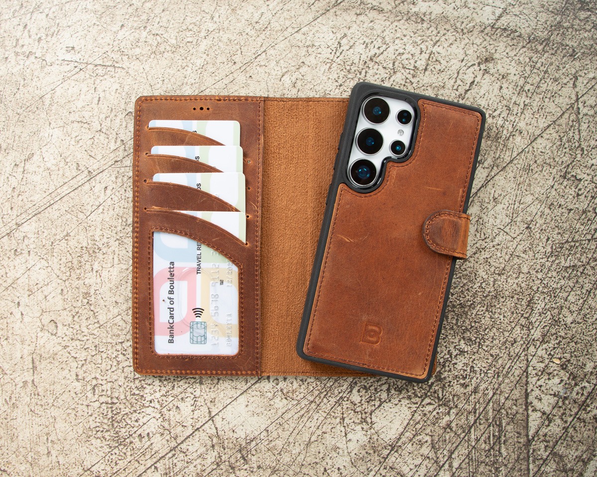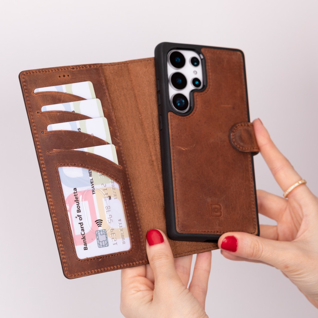 Husa polivalenta pentru Samsung Galaxy S25 Ultra din piele naturala premium, portofel + carcasa detasabila magnetic, functie vizionare video, inchidere sigura magnetica - Bouletta Magic Wallet, Antique brown