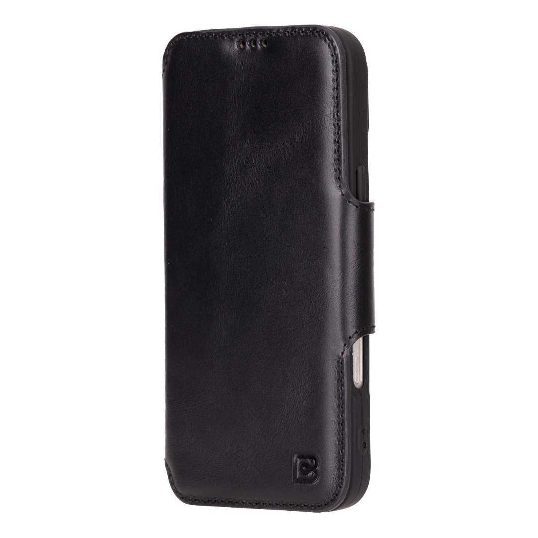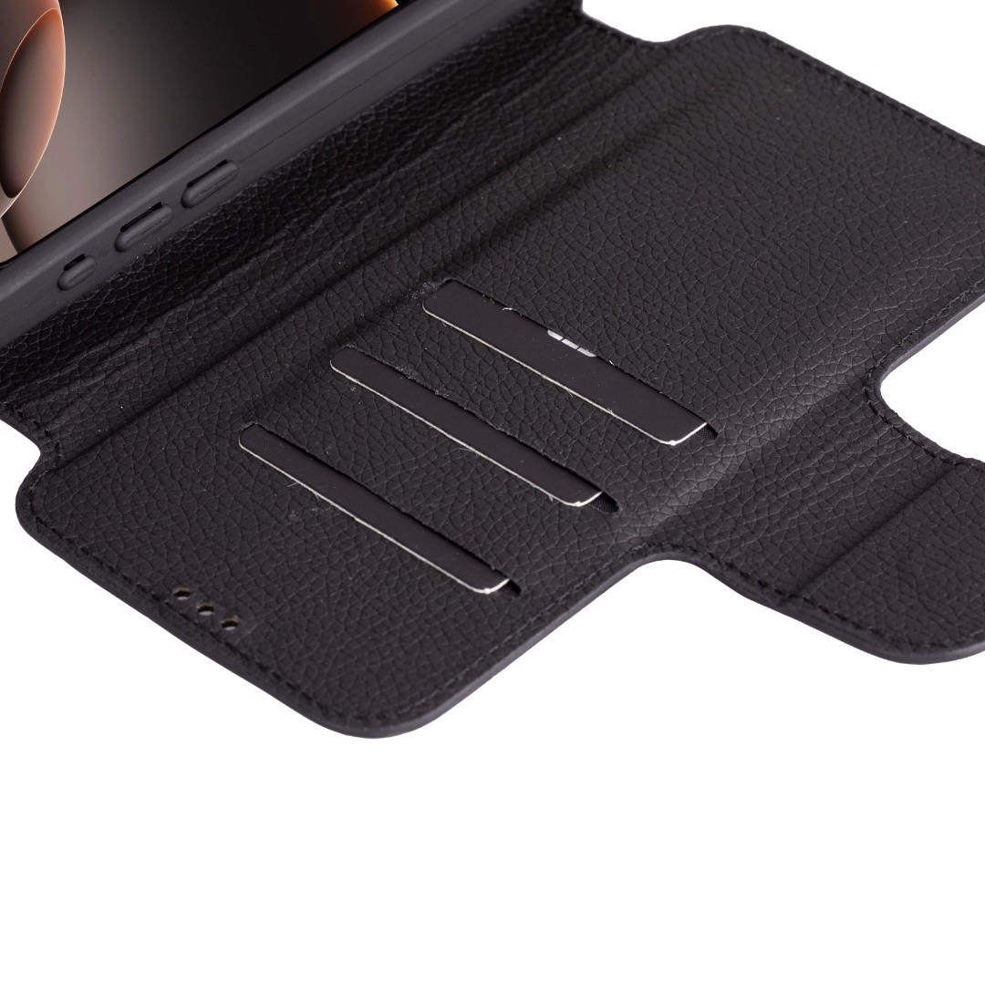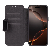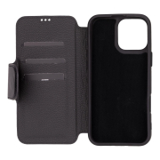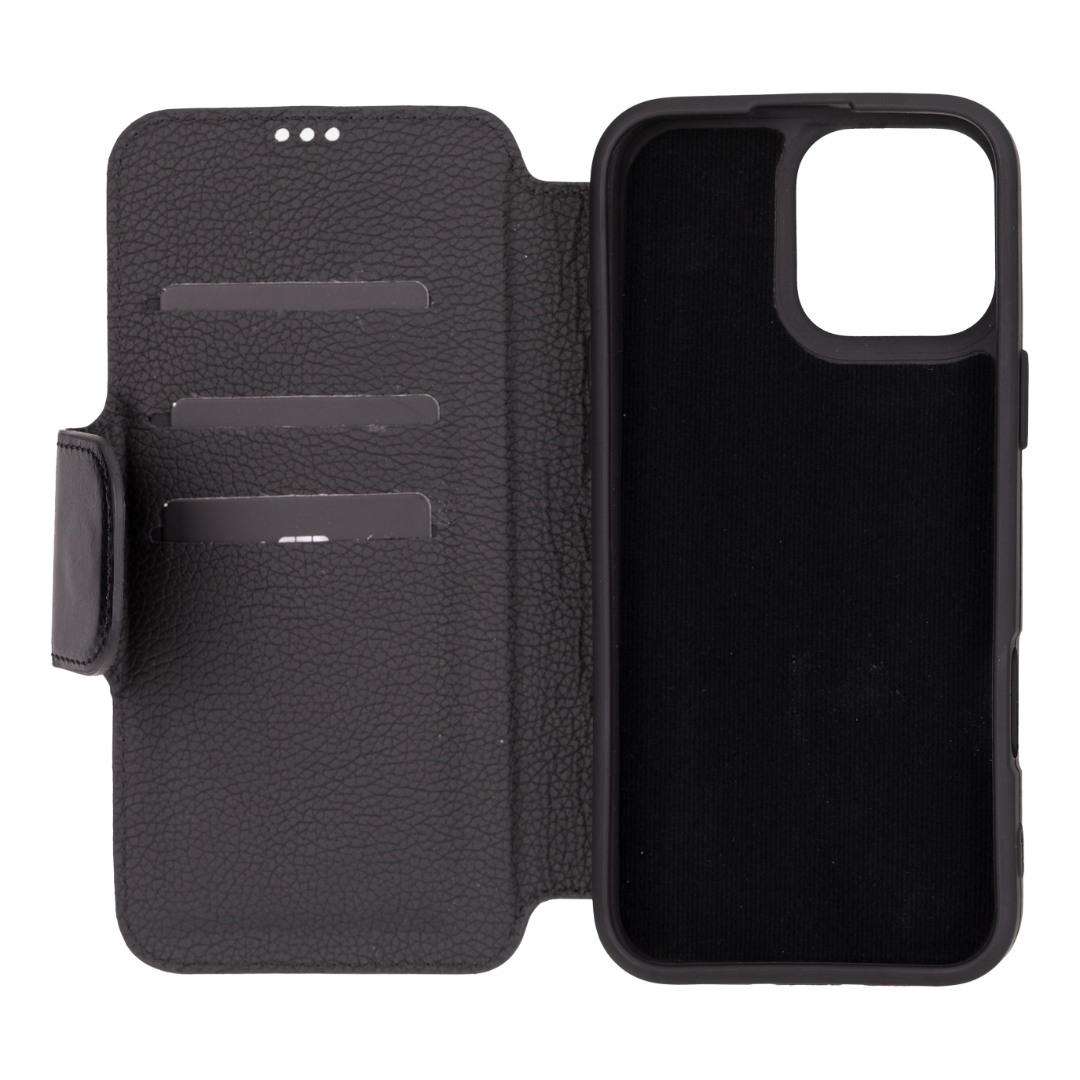 Husa slim pentru iPhone 16 Pro Max - din piele naturala premium (interior/exterior), design simplu si durabill. tip carte, inchidere sigura cu banda magnetica, suport stand & buzunare carduri, Bouletta Firenze, Rustic black