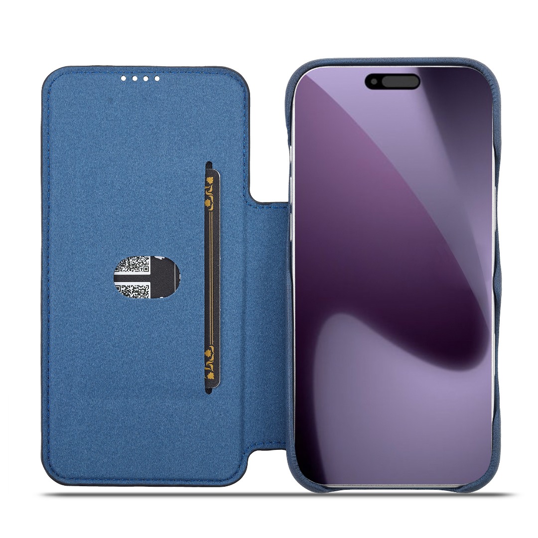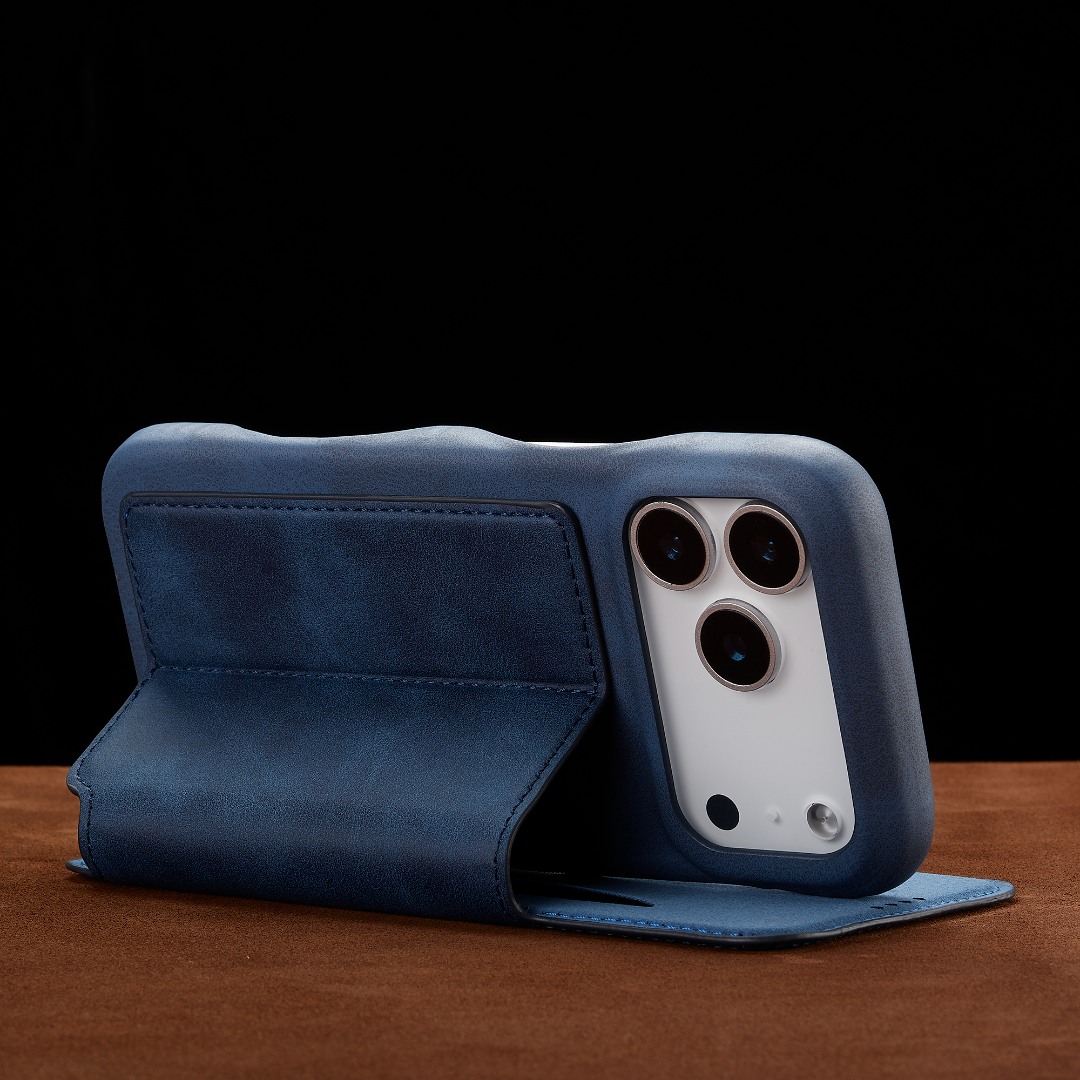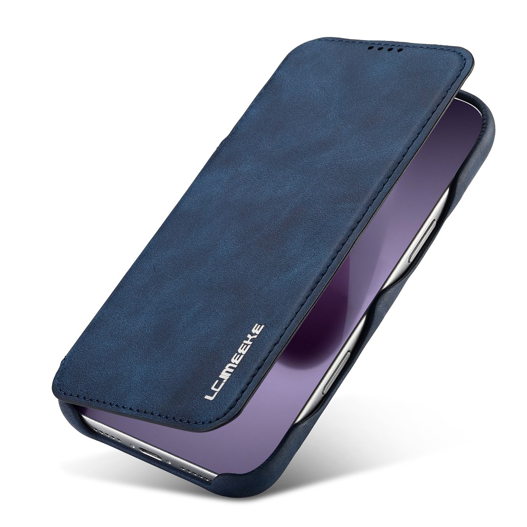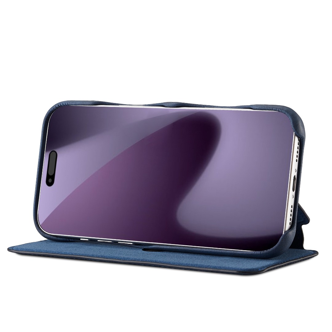 Husa slim tip carte pentru iPhone 17 Pro, cu buzunar pentru card, functie stand pentru vizionare video, decupaj pentru convorbiri cu clapeta inchisa, inchidere magnetica, CaseMe, Albastru inchis