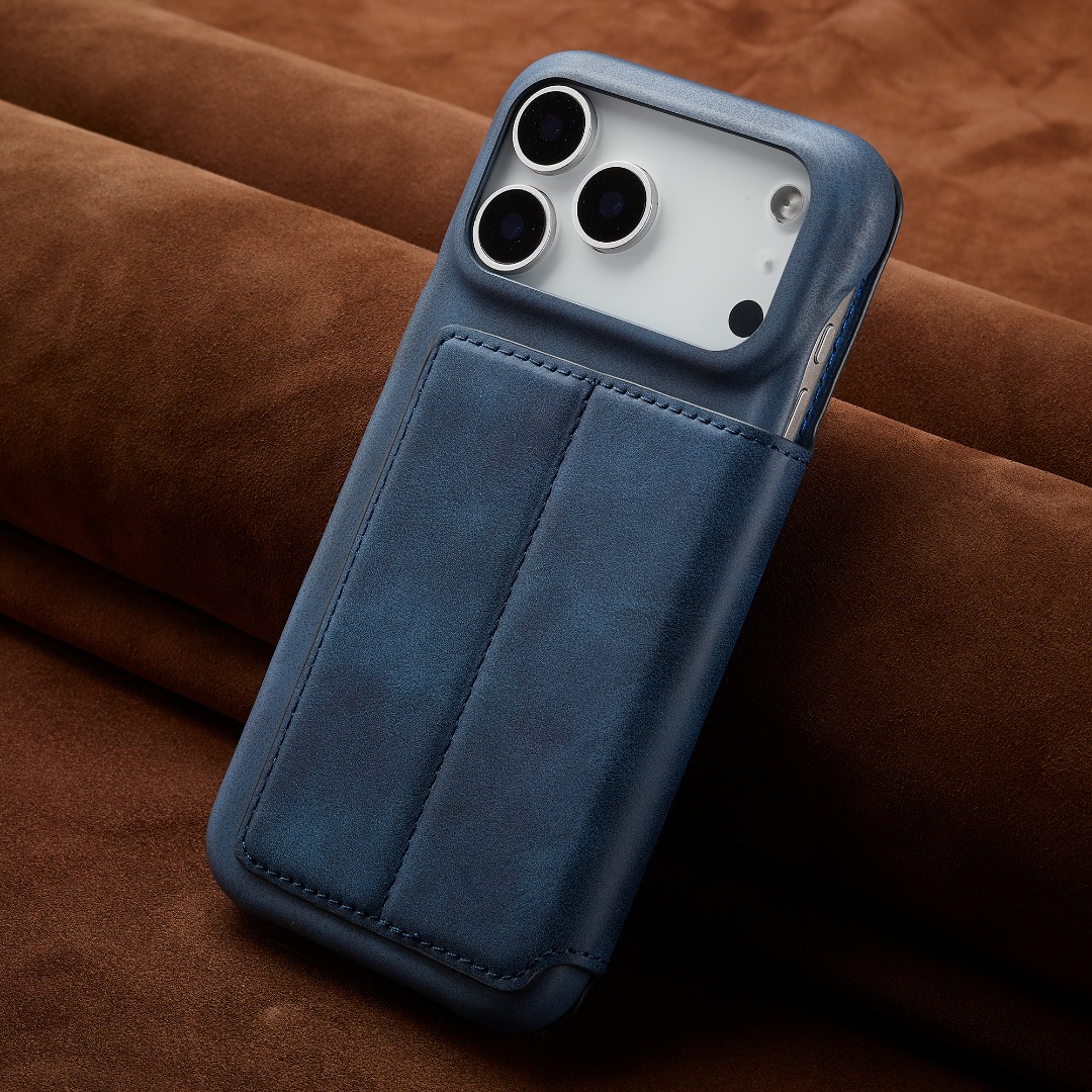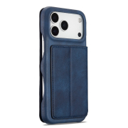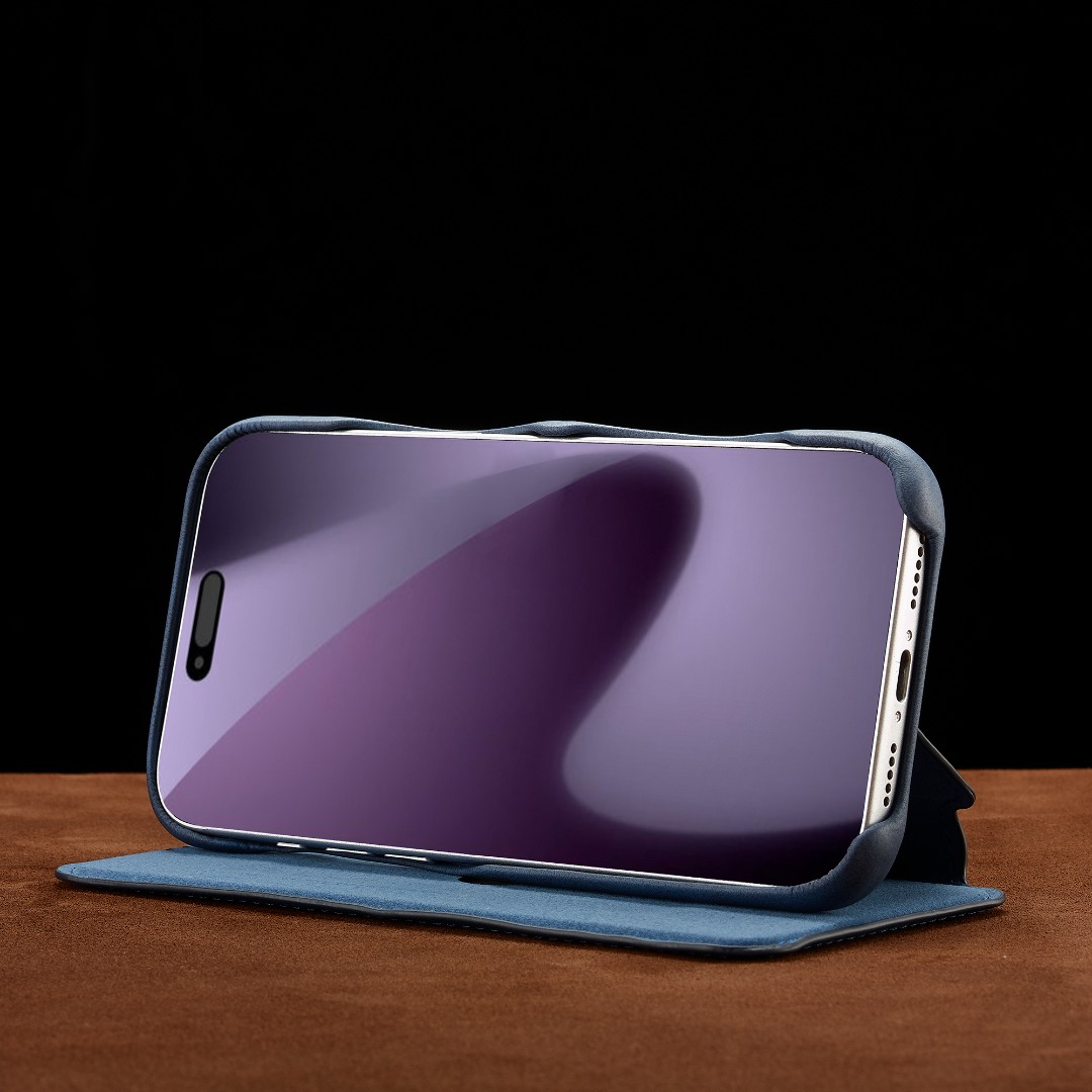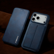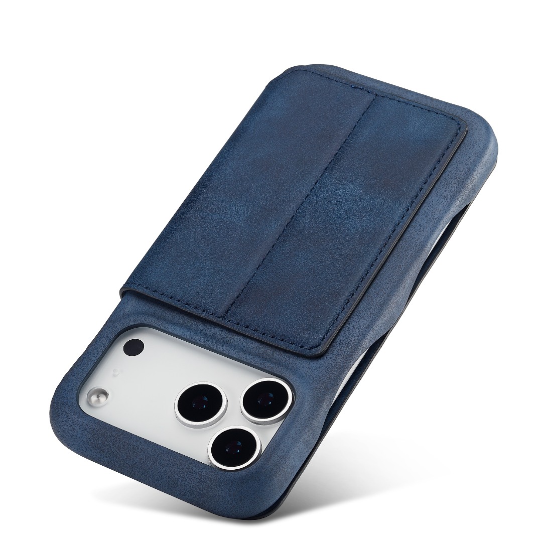 Husa slim tip carte pentru iPhone 17 Pro, cu buzunar pentru card, functie stand pentru vizionare video, decupaj pentru convorbiri cu clapeta inchisa, inchidere magnetica, CaseMe, Albastru inchis