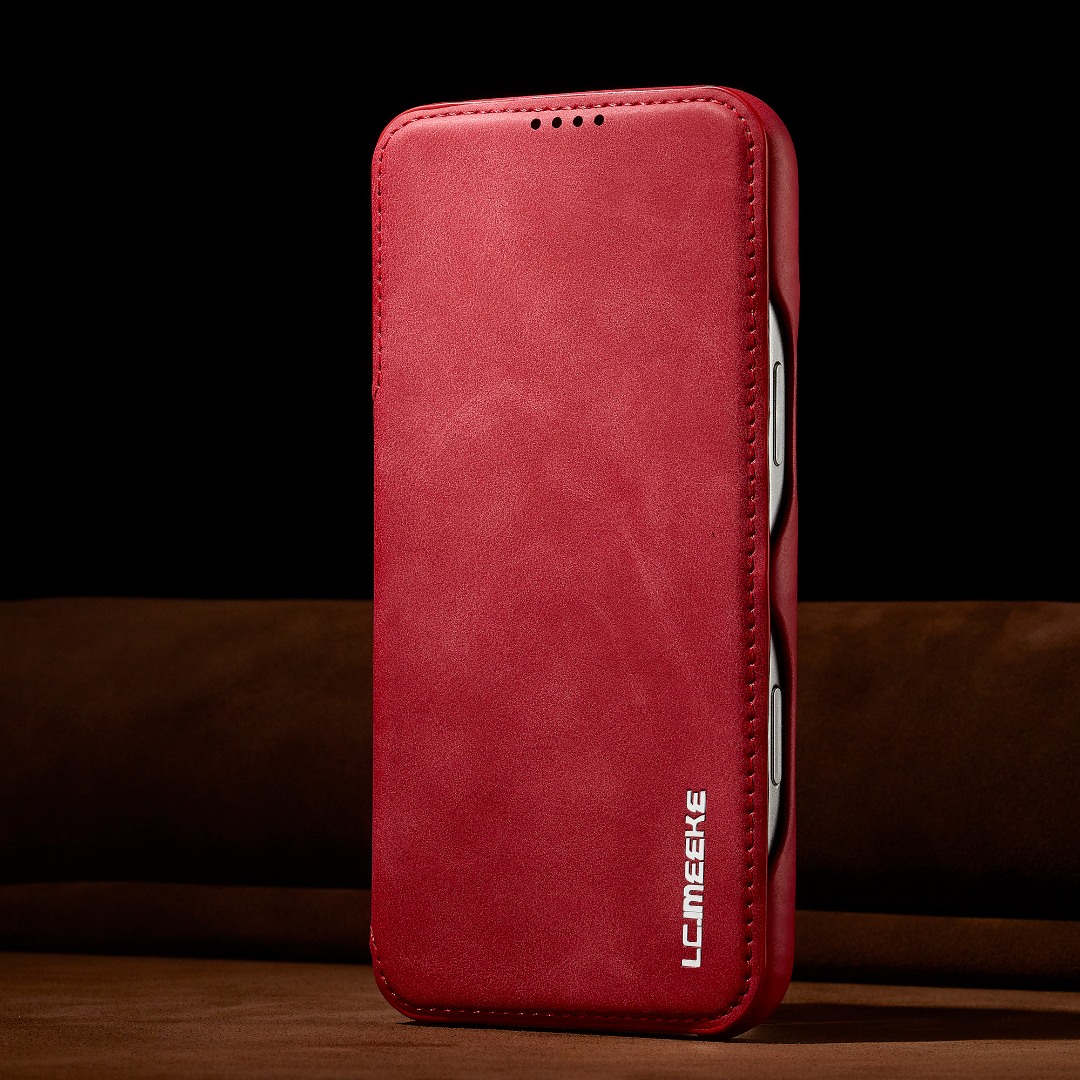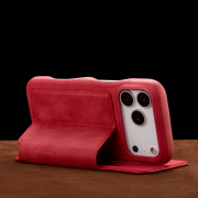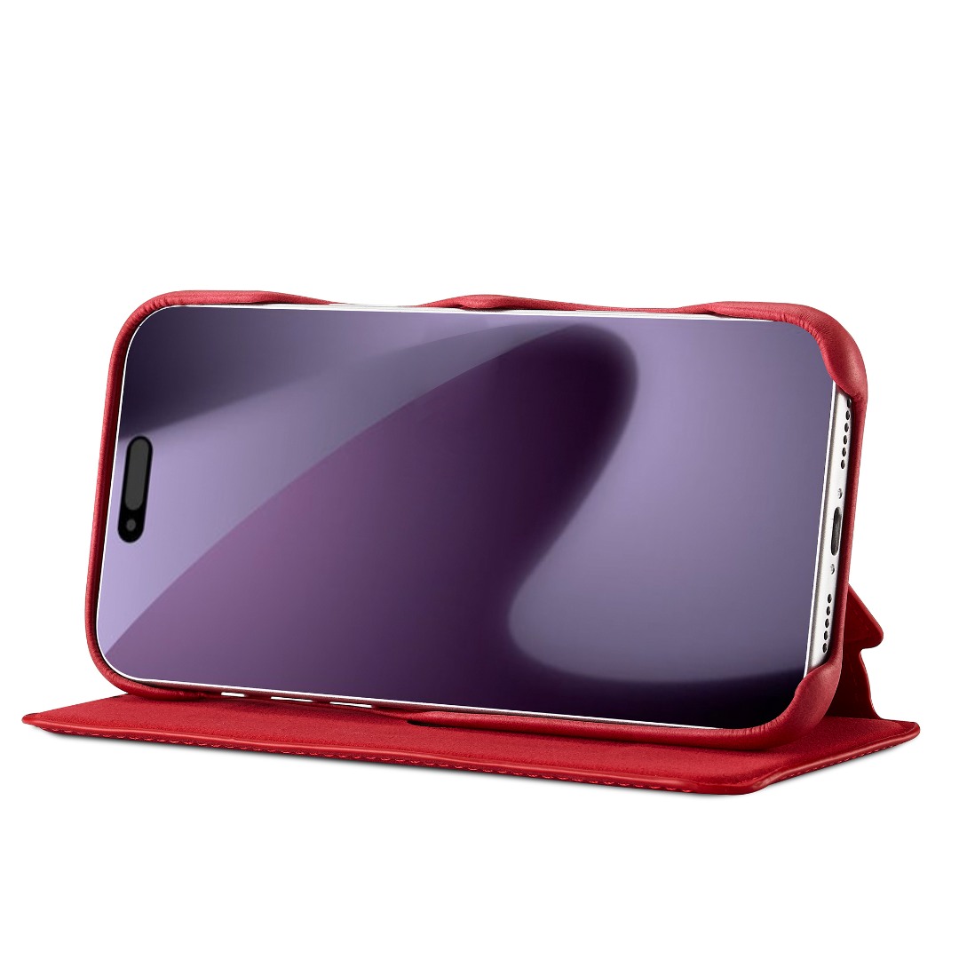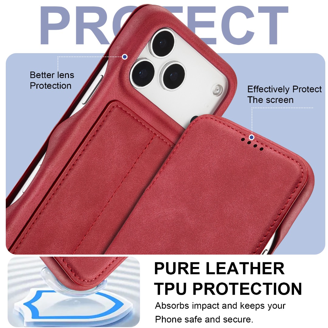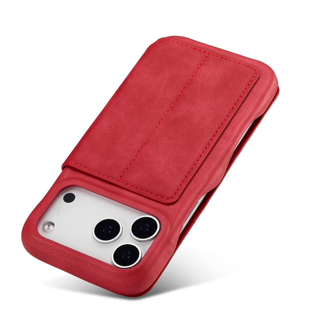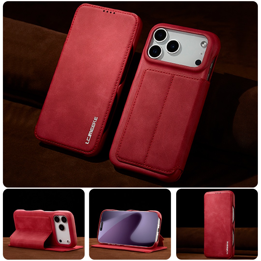 Husa slim tip carte pentru iPhone 17 Pro, cu buzunar pentru card, functie stand pentru vizionare video, decupaj pentru convorbiri cu clapeta inchisa, inchidere magnetica, CaseMe, Rosu