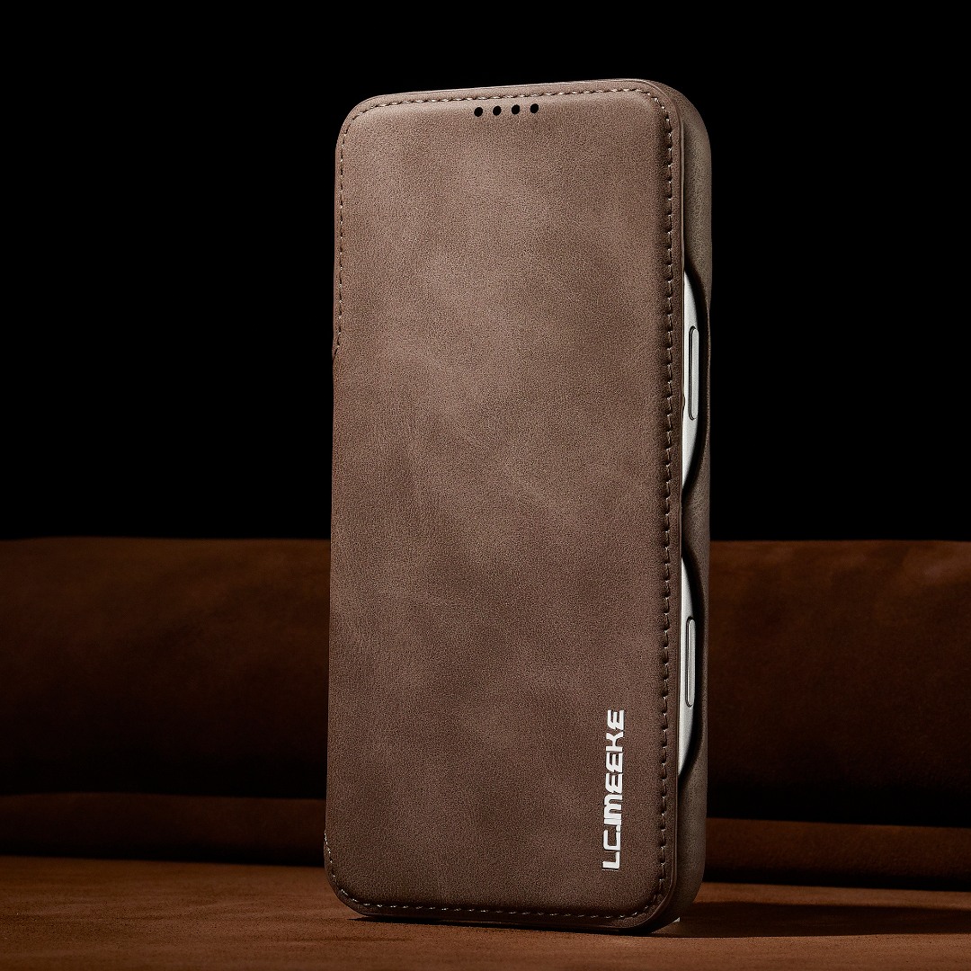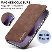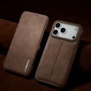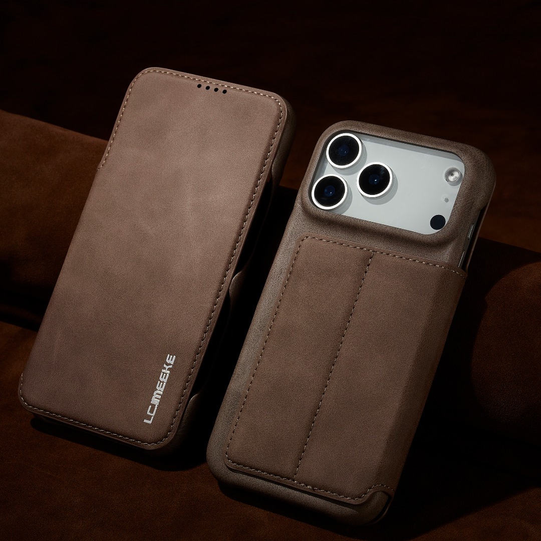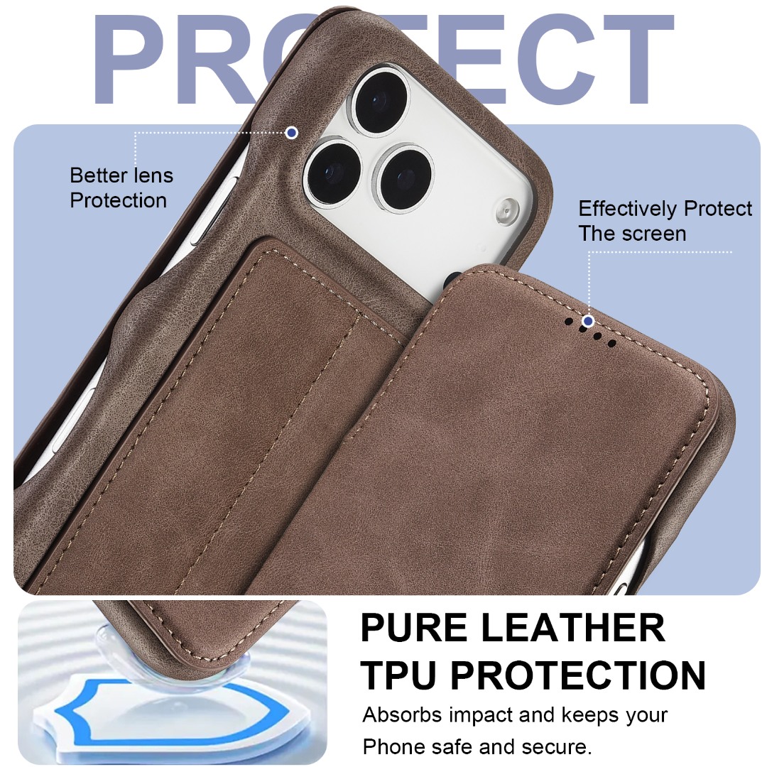 Husa slim tip carte pentru iPhone 17 Pro Max, cu buzunar pentru card, functie stand pentru vizionare video, decupaj pentru convorbiri cu clapeta inchisa, inchidere magnetica, CaseMe, Maro coffee