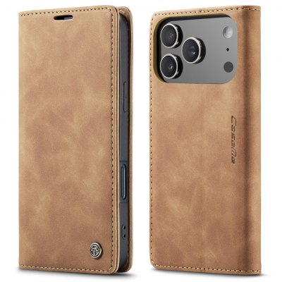 Husa slim piele, tip portofel, stand, inchidere magnetica, textura catifelata, iPhone 17 Pro Max - CaseMe, Maro