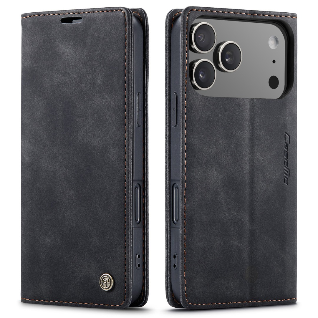 Husa slim piele, tip portofel, stand, inchidere magnetica, textura catifelata, buzunare pentru bani si carduri, iPhone 17 Pro Max - CaseMe, Negru