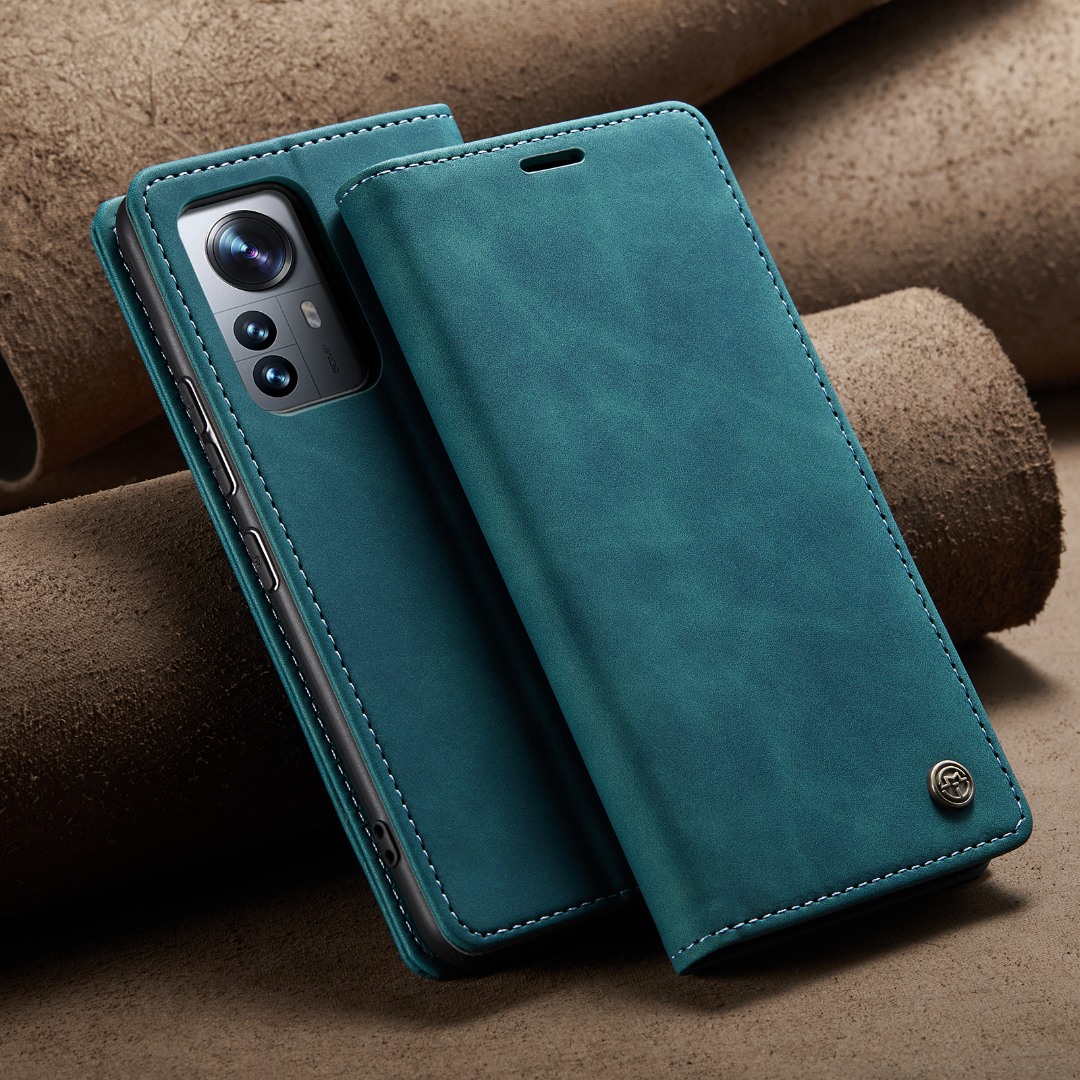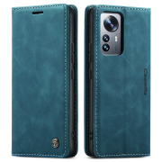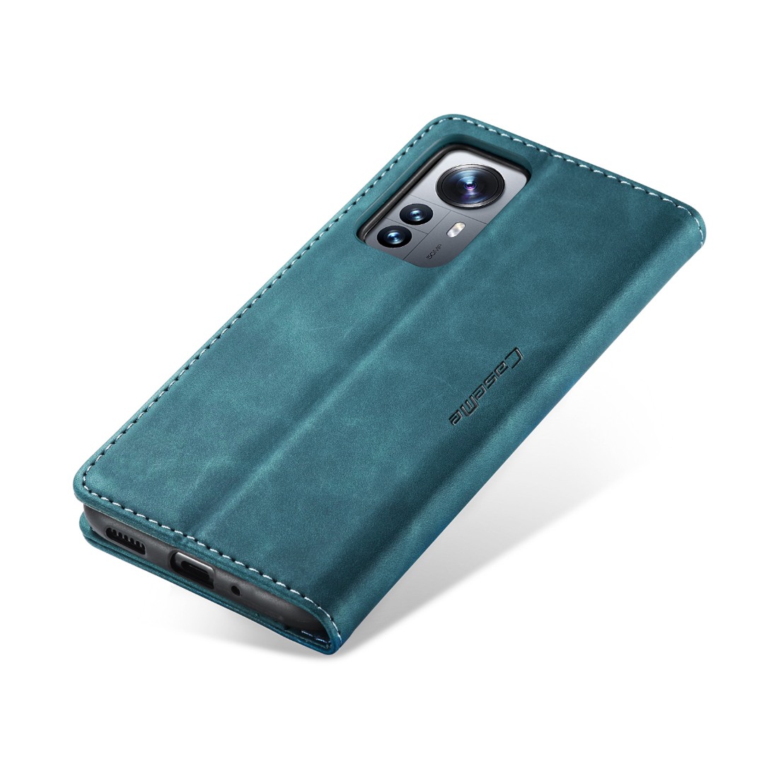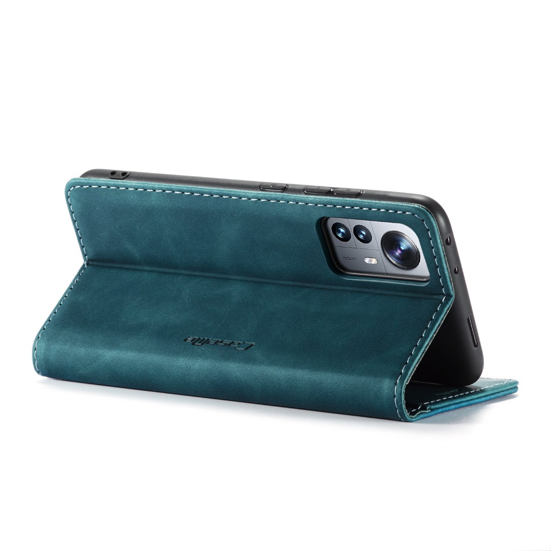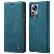 Husa slim piele, tip portofel, stand, inchidere magnetica, textura catifelata, Xiaomi 12 Pro - CaseMe, Albastru verzui