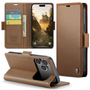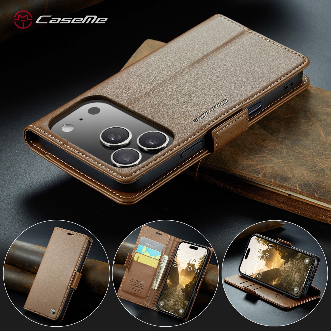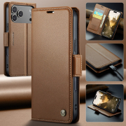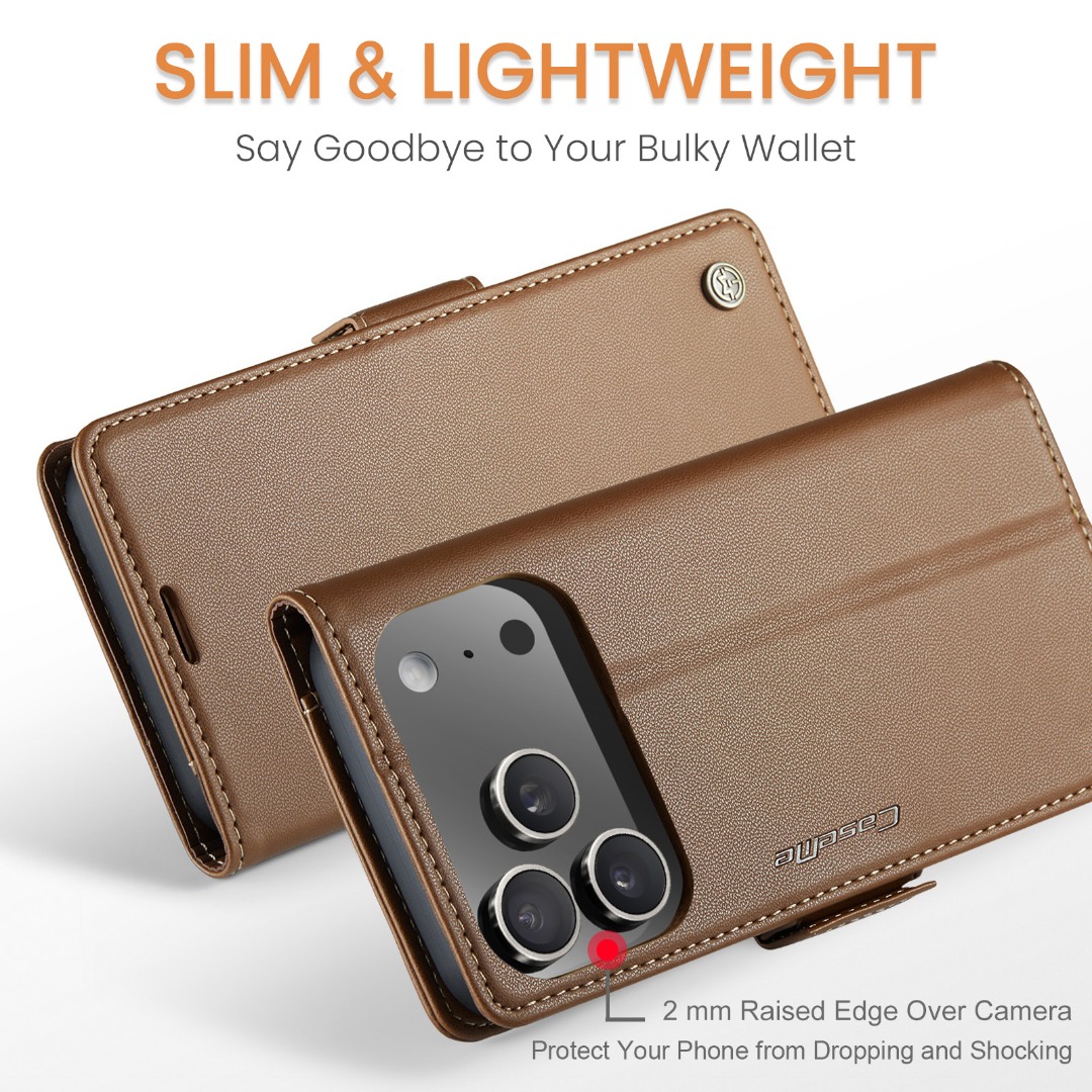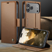 Husa slim piele, tip portofel, stand, inchidere sigura magnetica, textura moale si aderenta in mana, protectie RFID, iPhone 17 Pro Maxi - CaseMe, Maro
