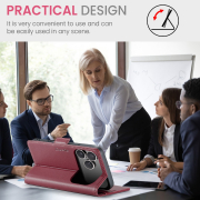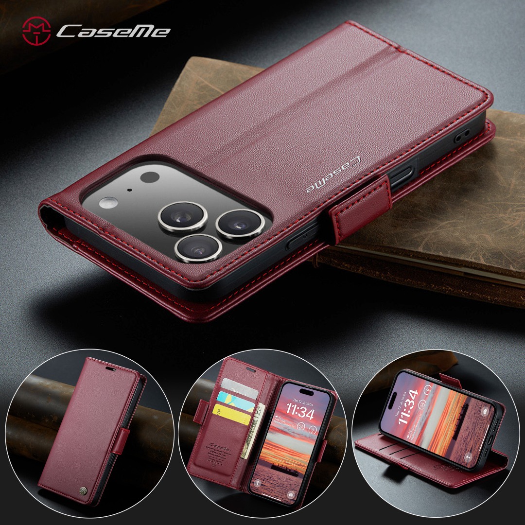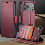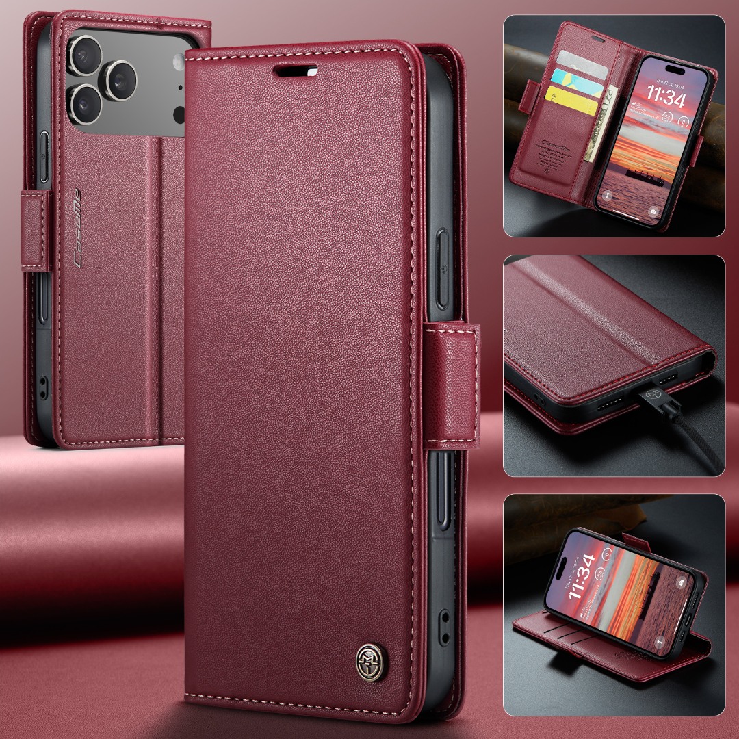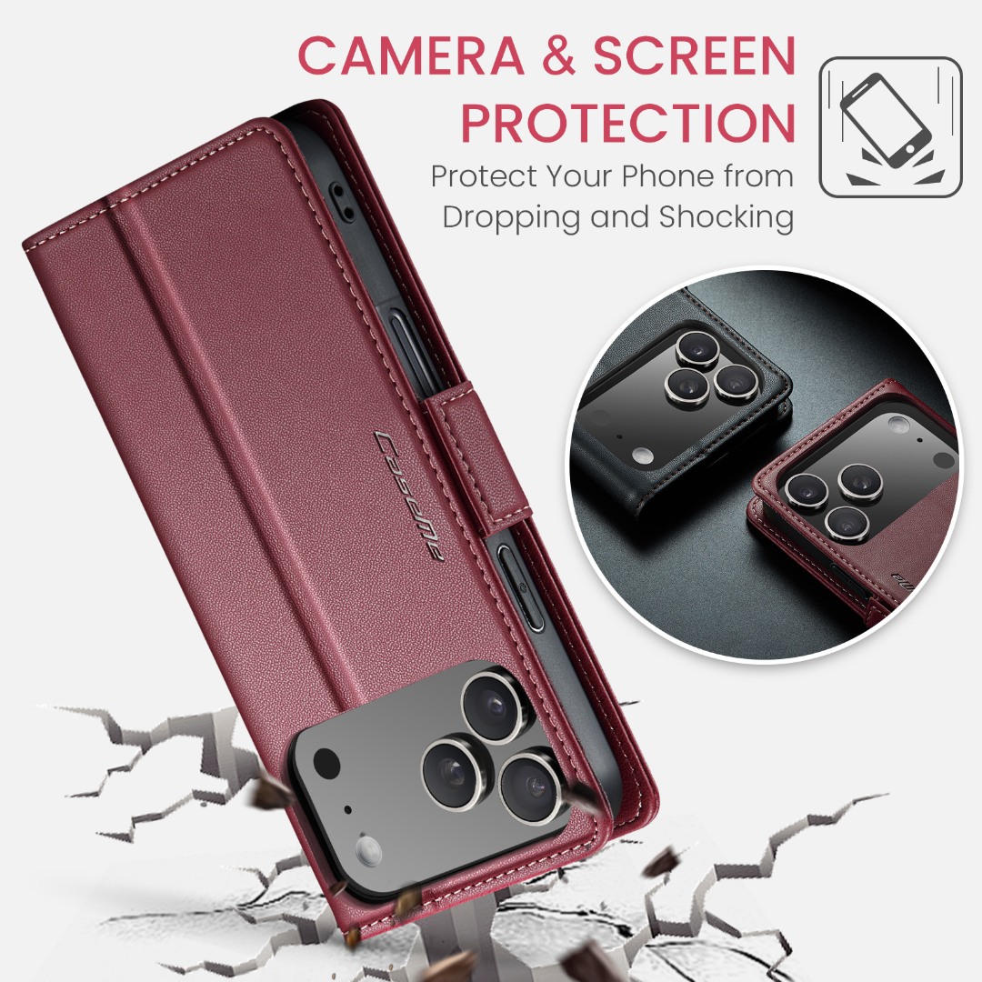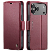Husa slim piele, tip portofel, stand, inchidere sigura magnetica, textura moale si aderenta in mana, protectie RFID, iPhone 17 Pro Max - CaseMe, Rosu